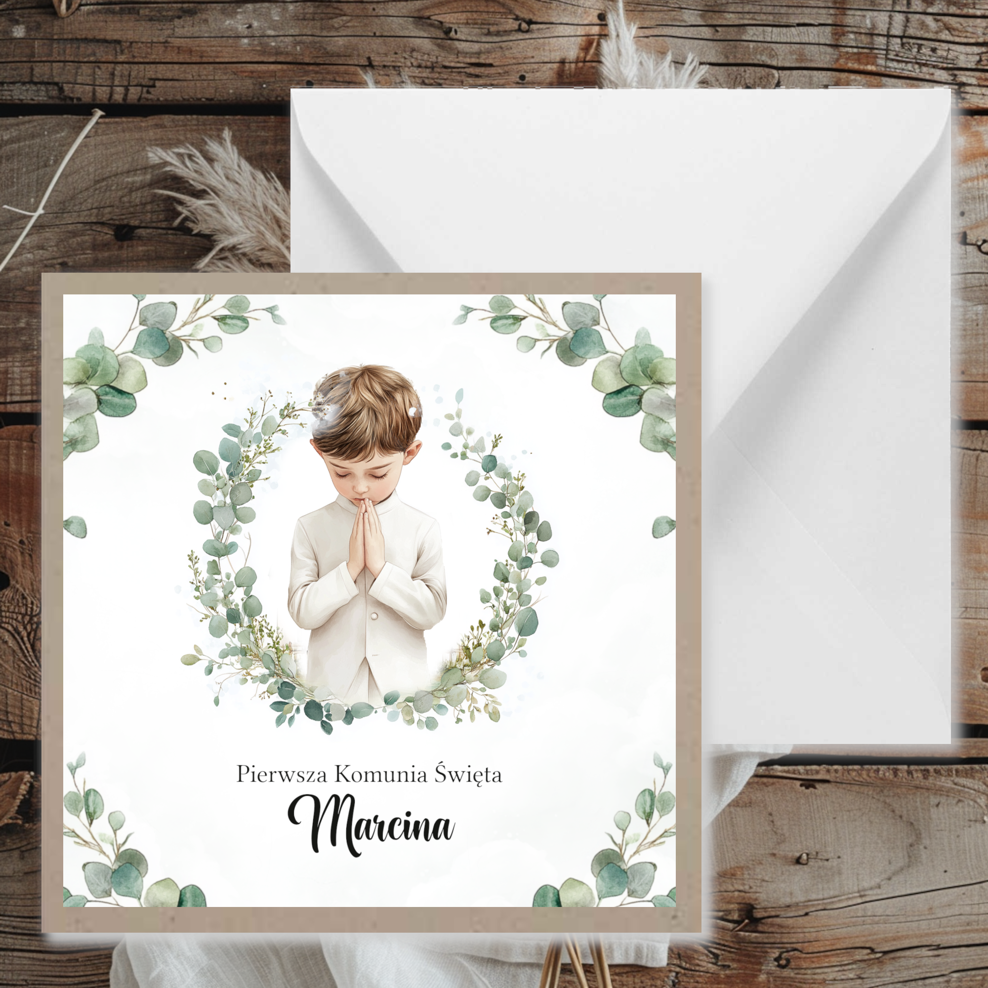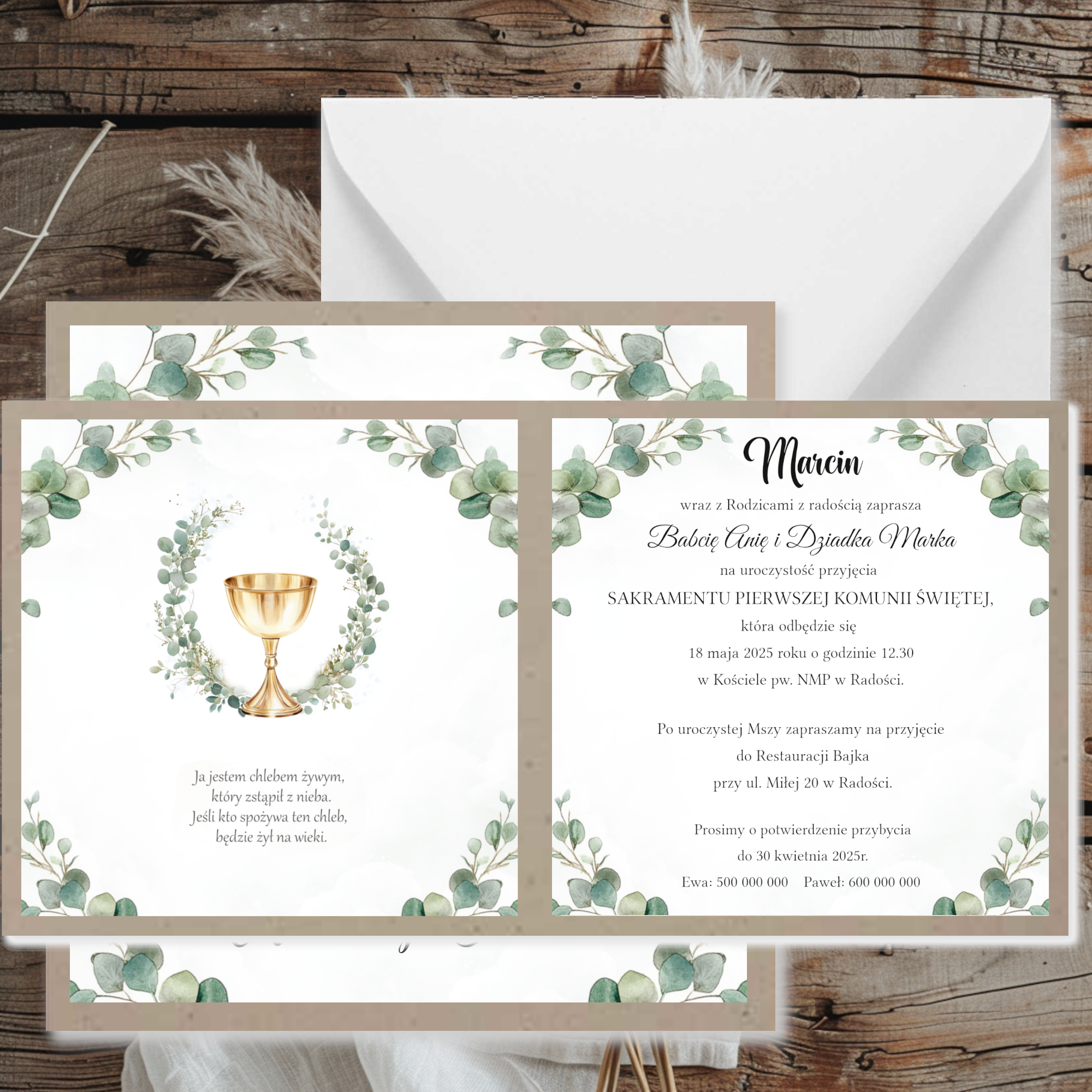 Zaproszenia na komunię z motywem eukaliptusa oraz papierem kraftowym