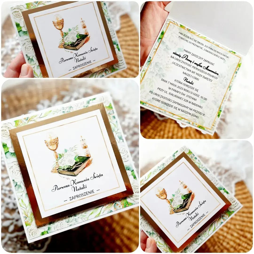 Zaproszenia na komunię w uniwersalnej kolorystyce z piękną grafiką oraz papierem lustrzanym.