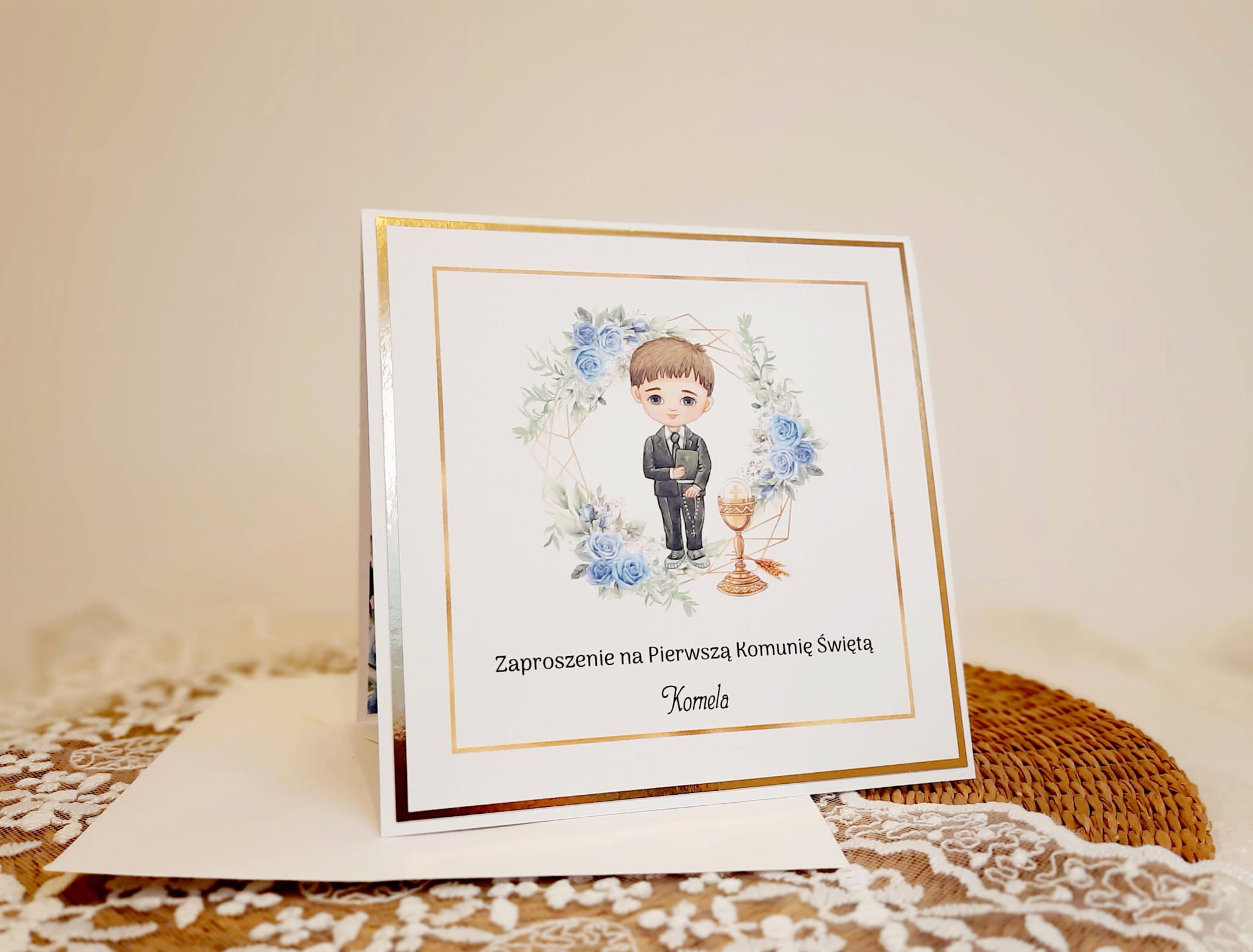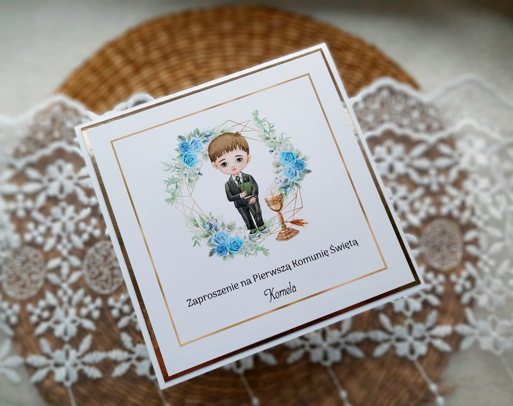 Zaproszenia na komunię z piękną grafiką oraz papierem lustrzanym.
