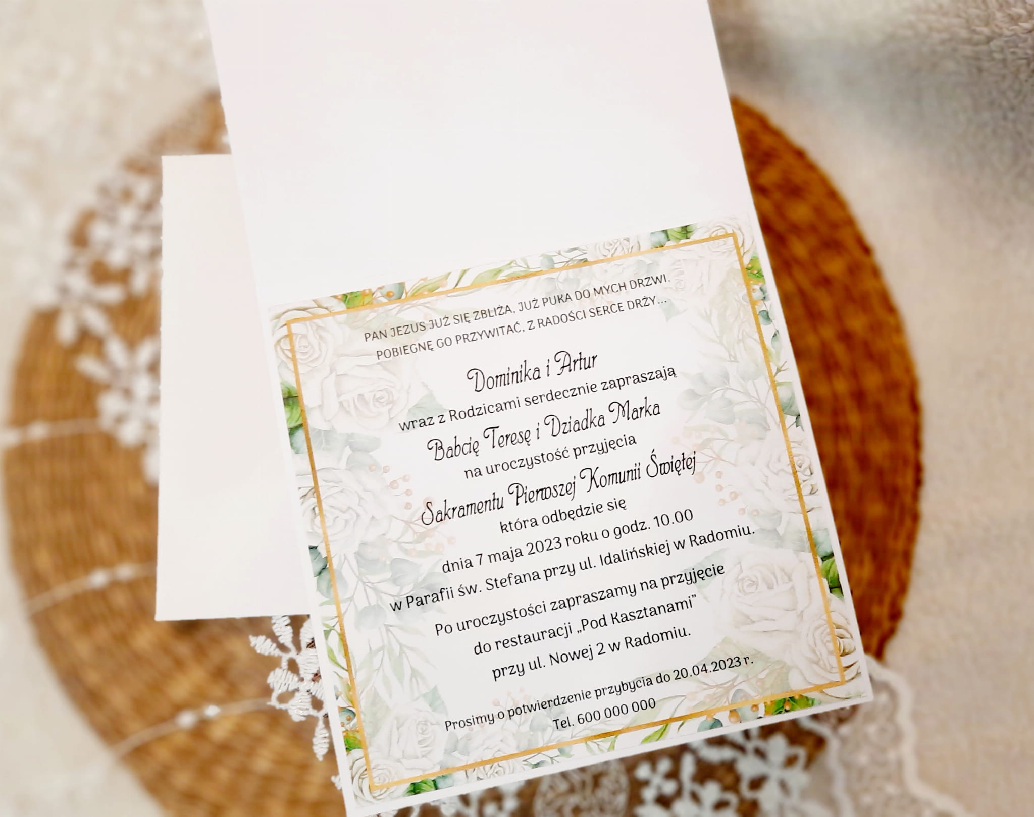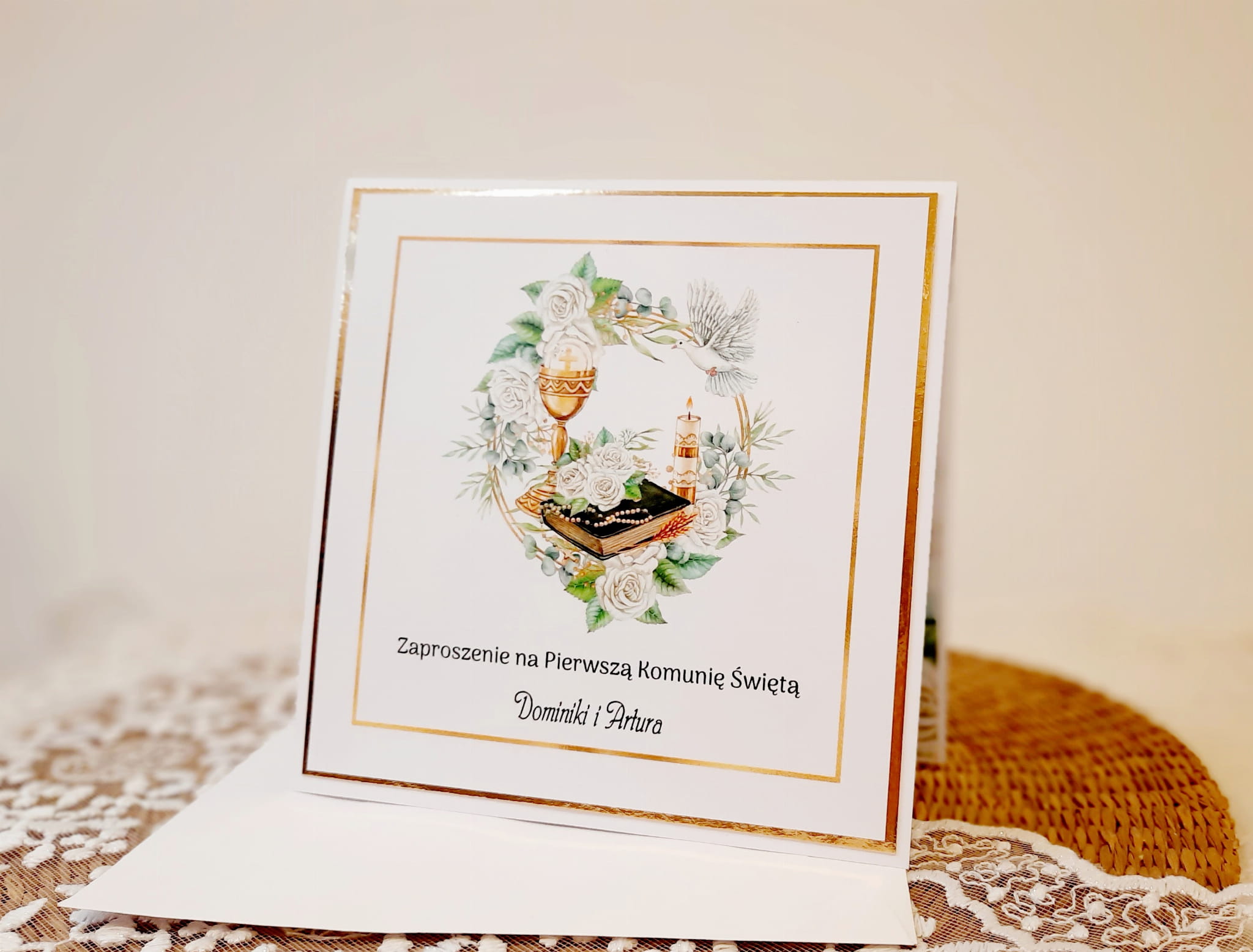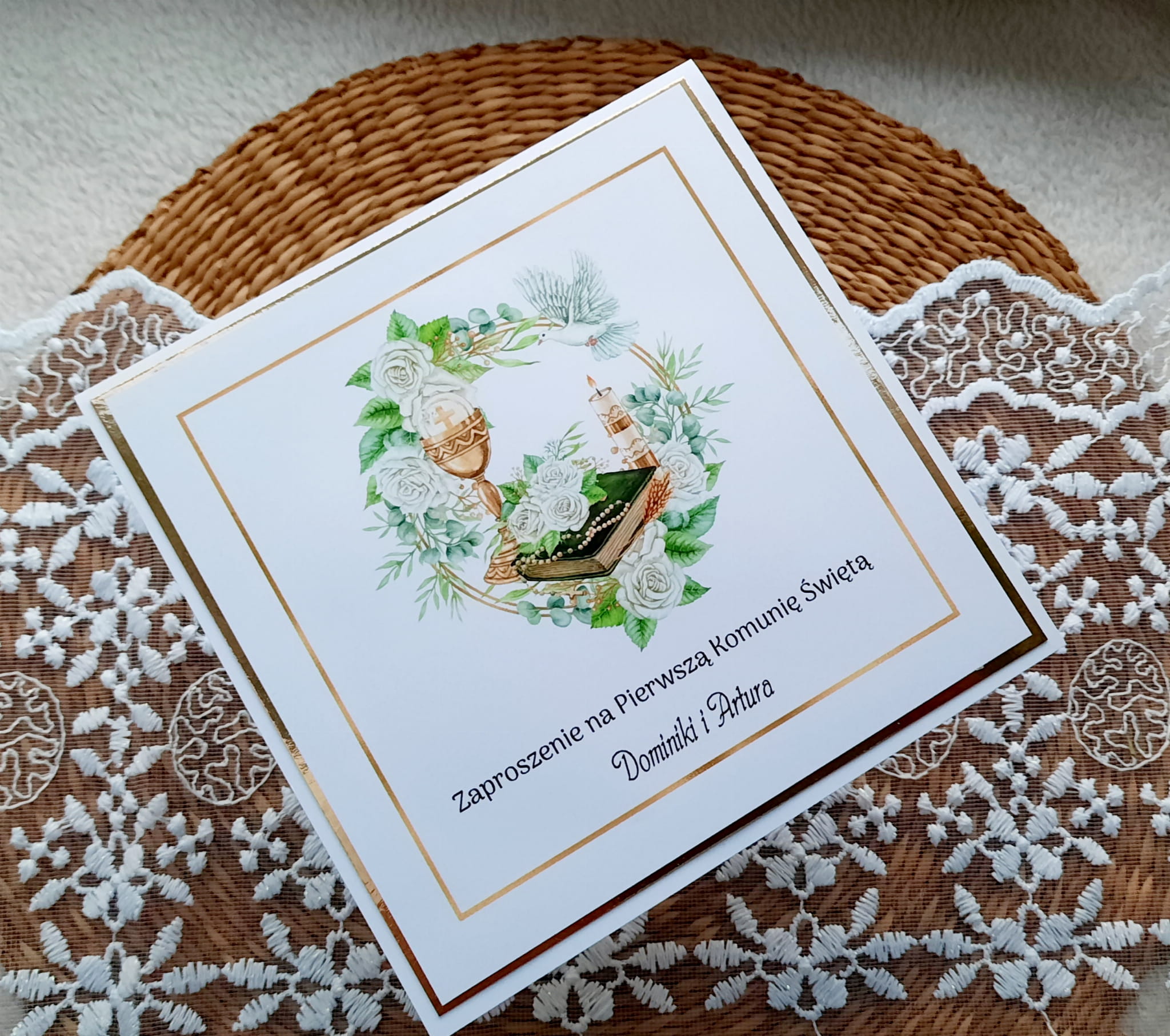 Zaproszenia na komunię z piękną grafiką oraz papierem lustrzanym.