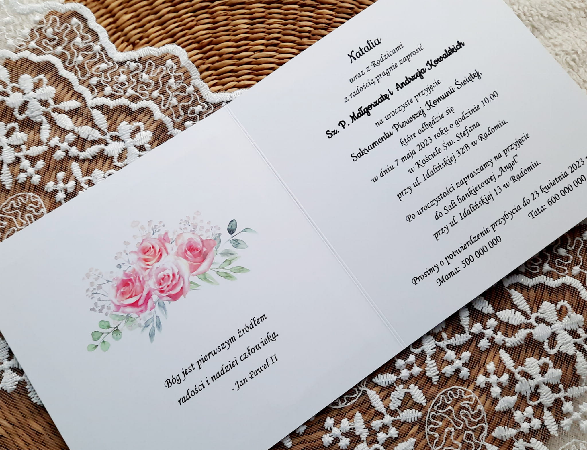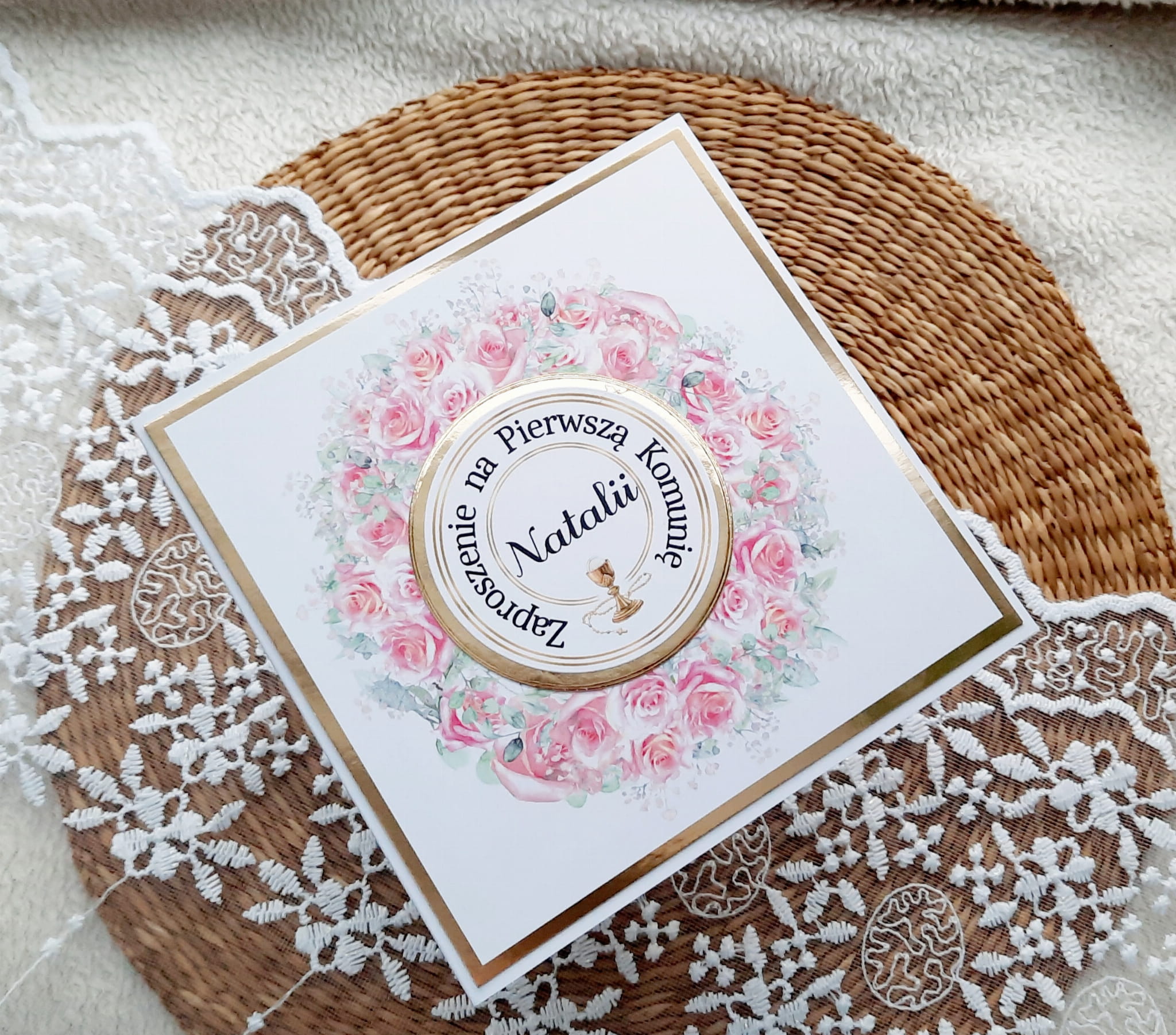 Zaproszenia na komunię z piękną grafiką oraz papierem lustrzanym.