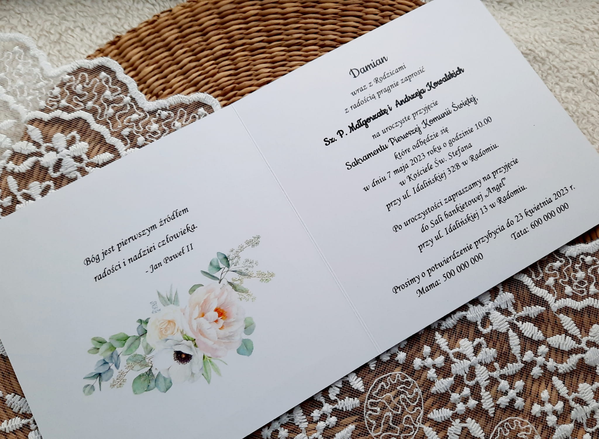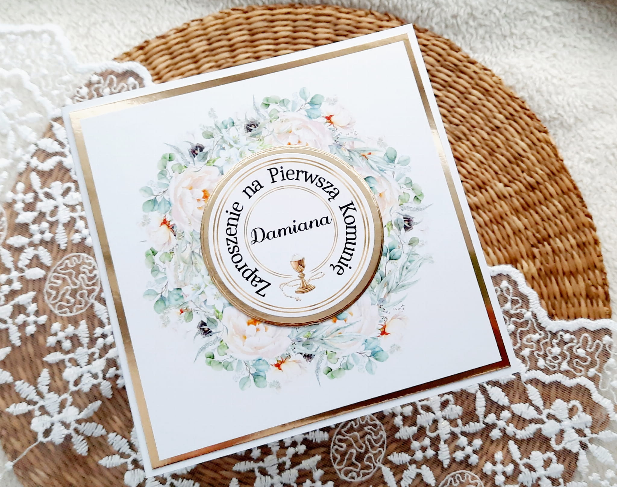 Zaproszenia na komunię z piękną grafiką oraz papierem lustrzanym.