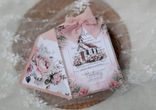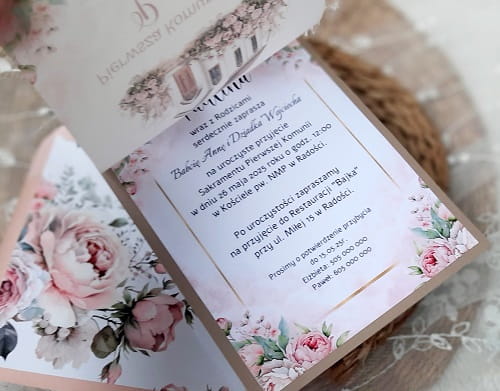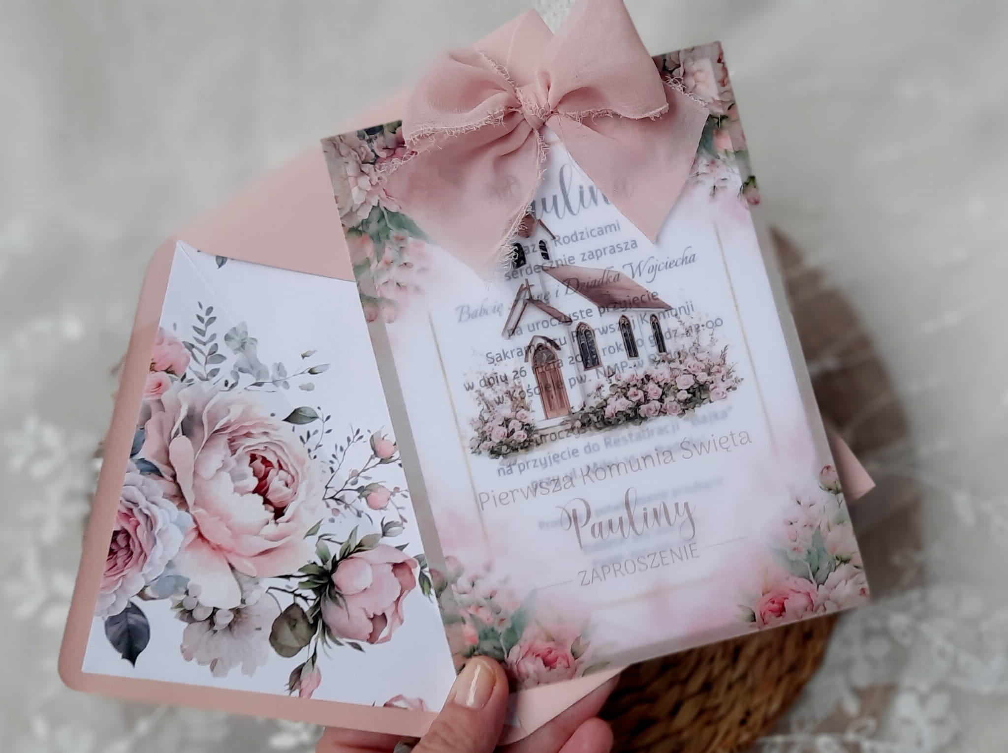 Zaproszenia na komunię z kalką, wstążeczką jedwabną oraz podkładem z papieru eko barwionego. Na kalce grafika kościoła.