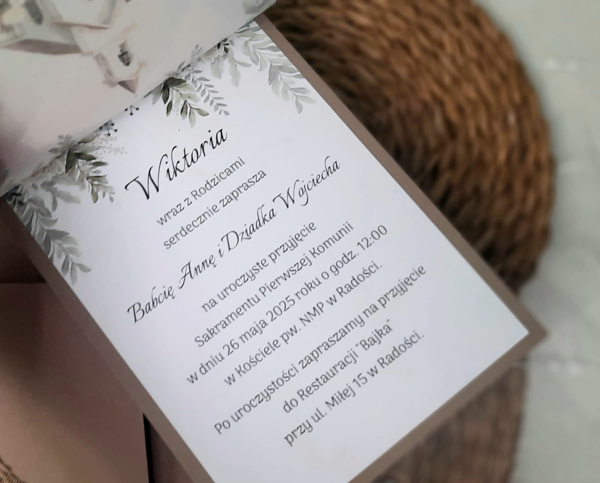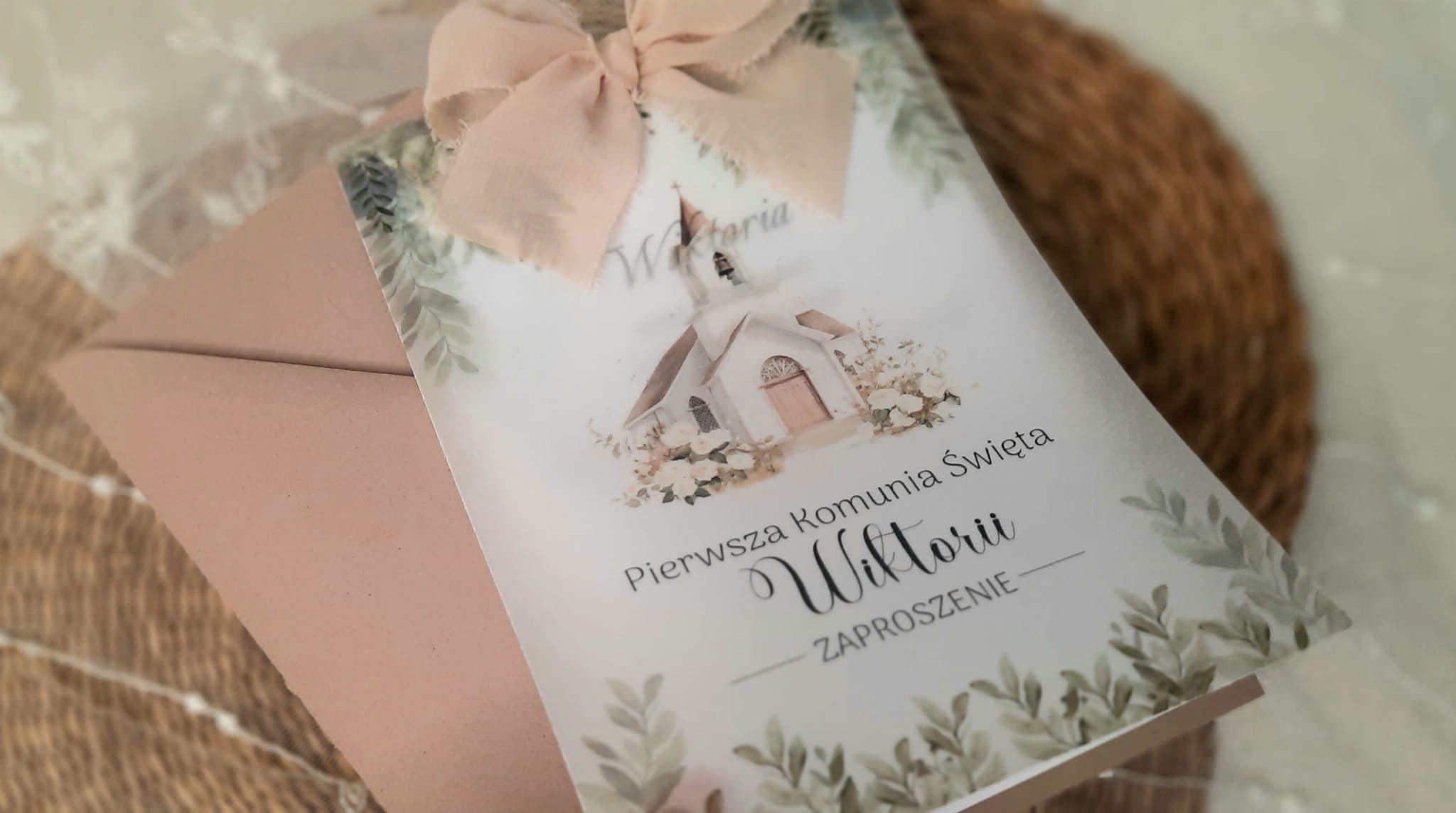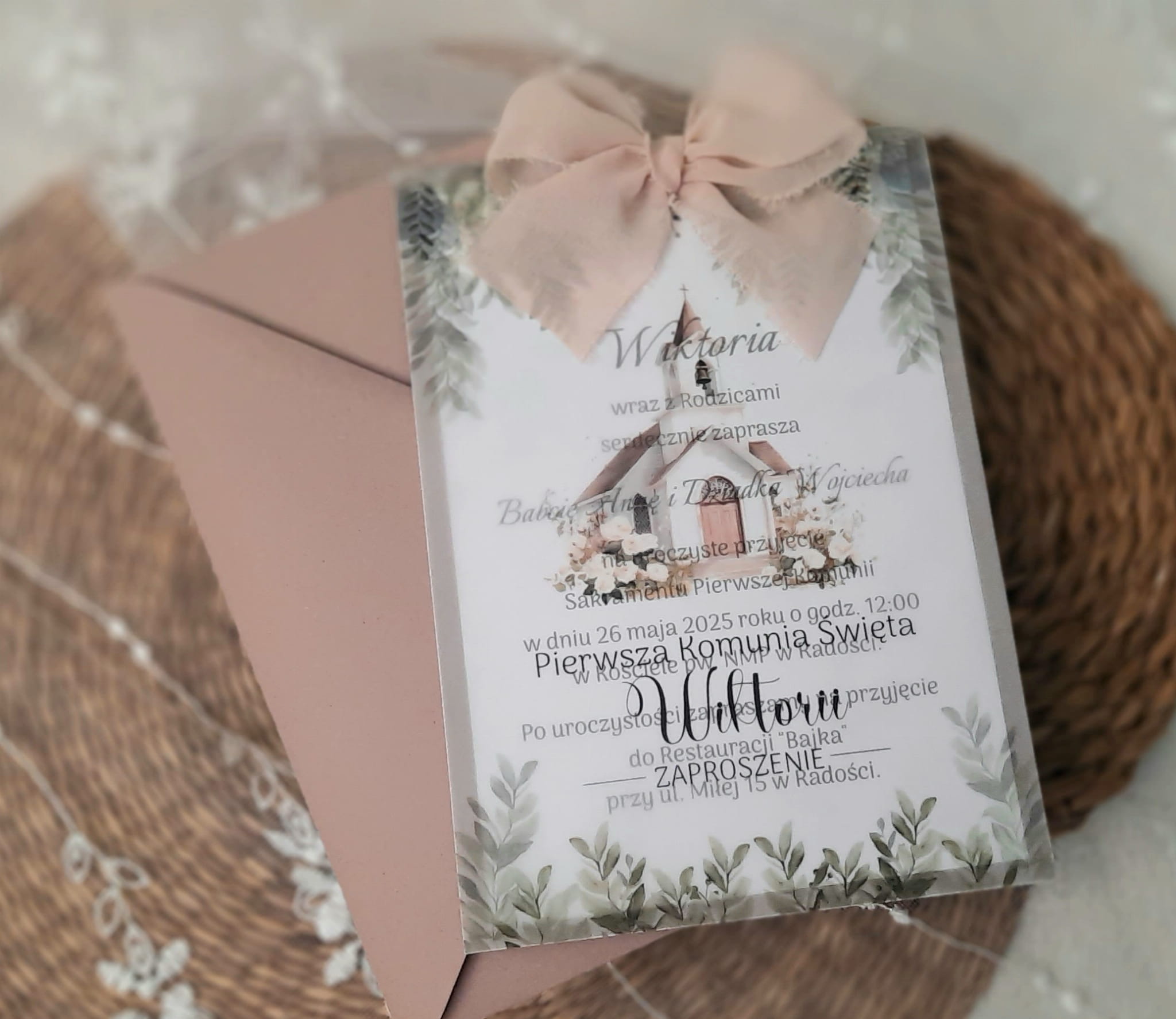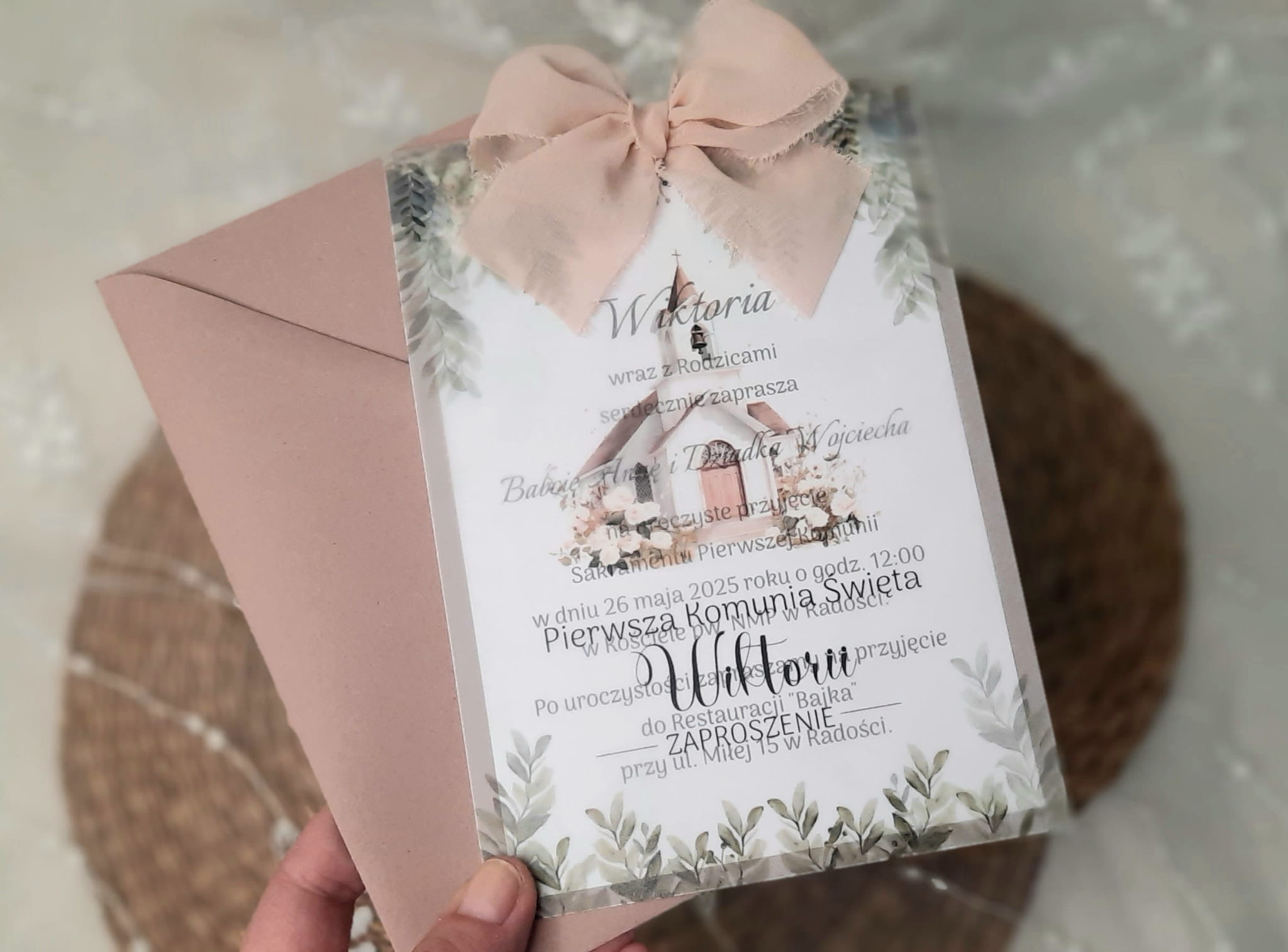 Zaproszenia na komunię z kalką, wstążeczką jedwabną oraz podkładem z papieru eko barwionego.