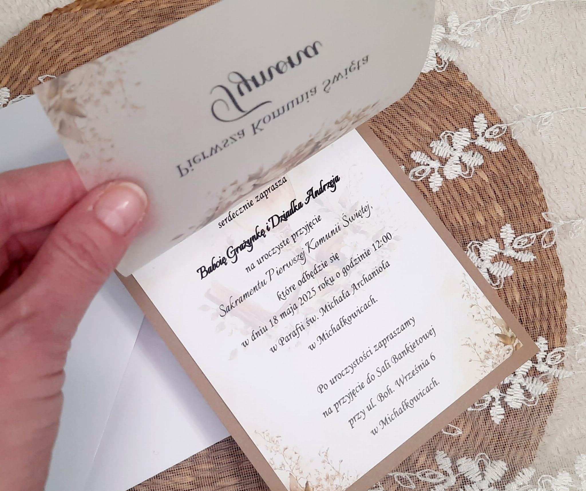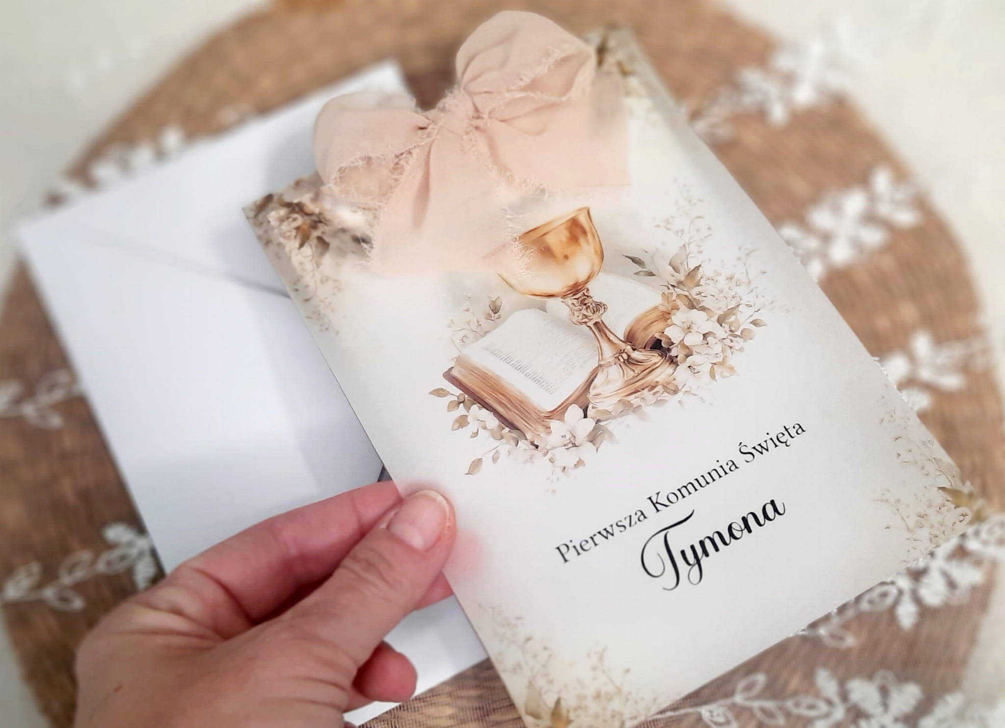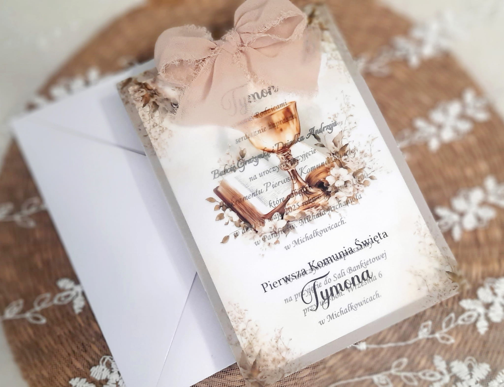 Zaproszenia na komunię z kalką, wstążeczką jedwabną oraz podkładem z papieru eko.