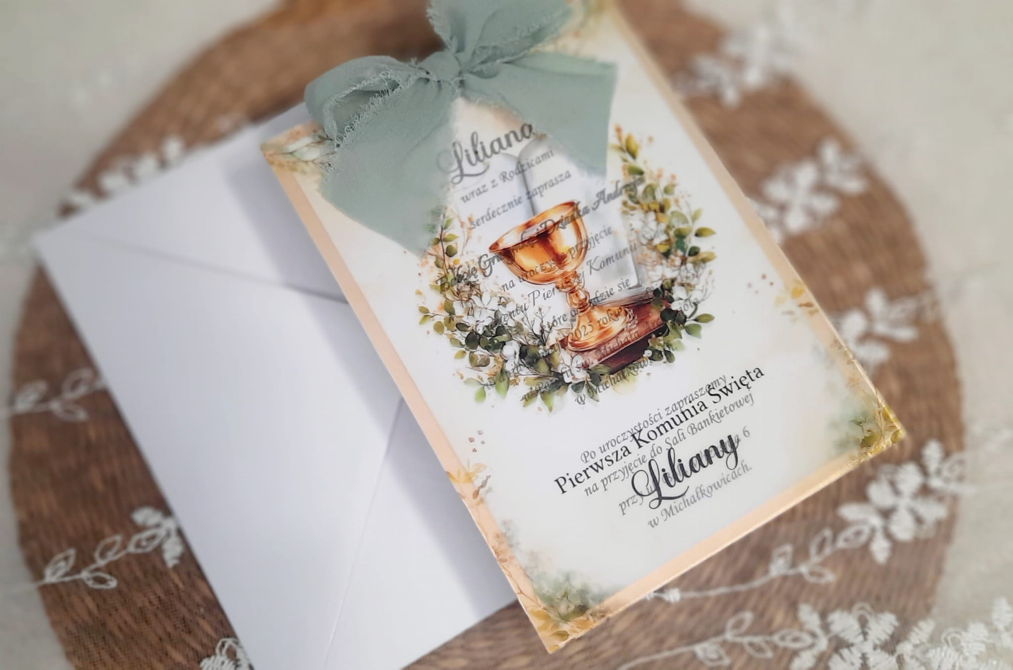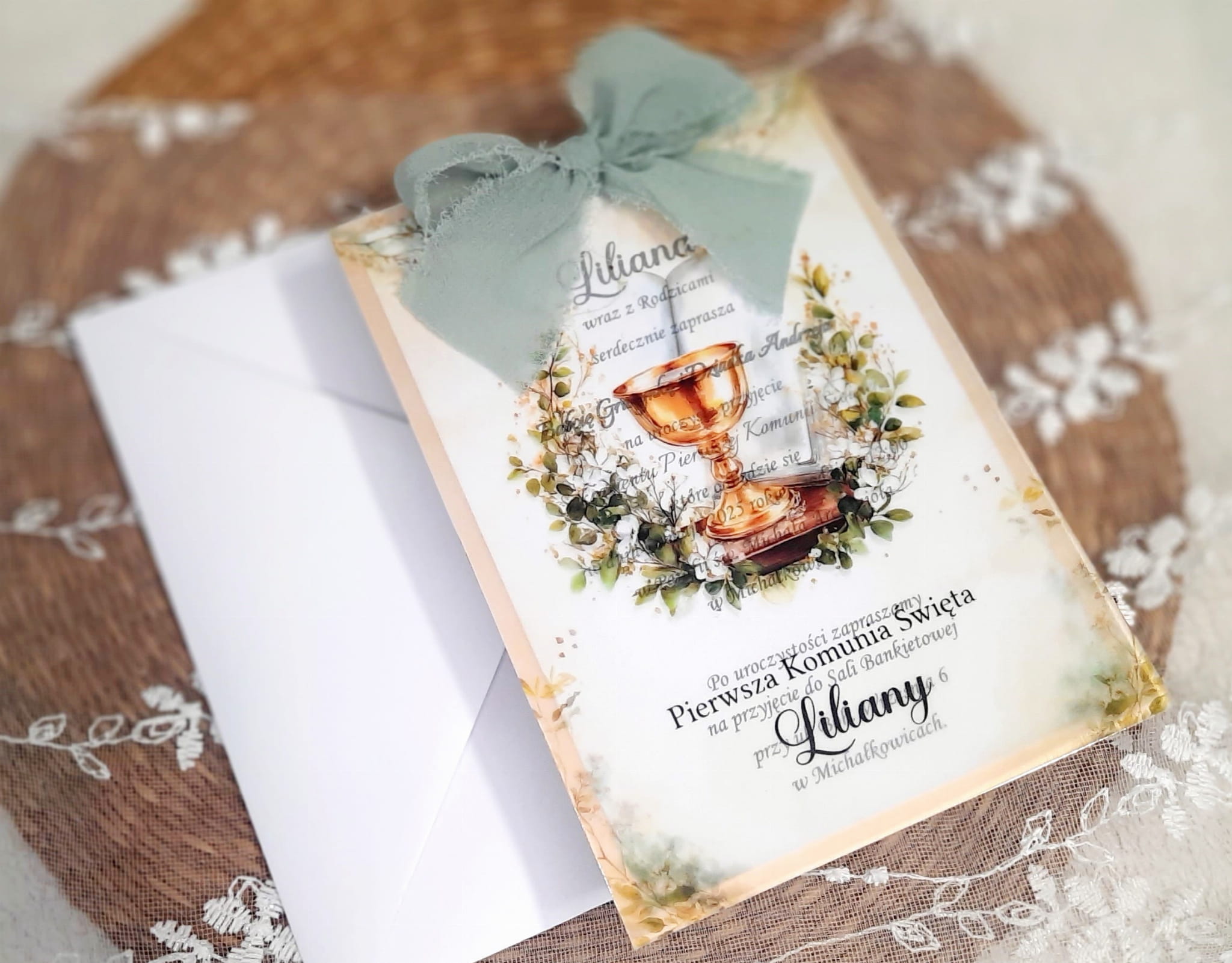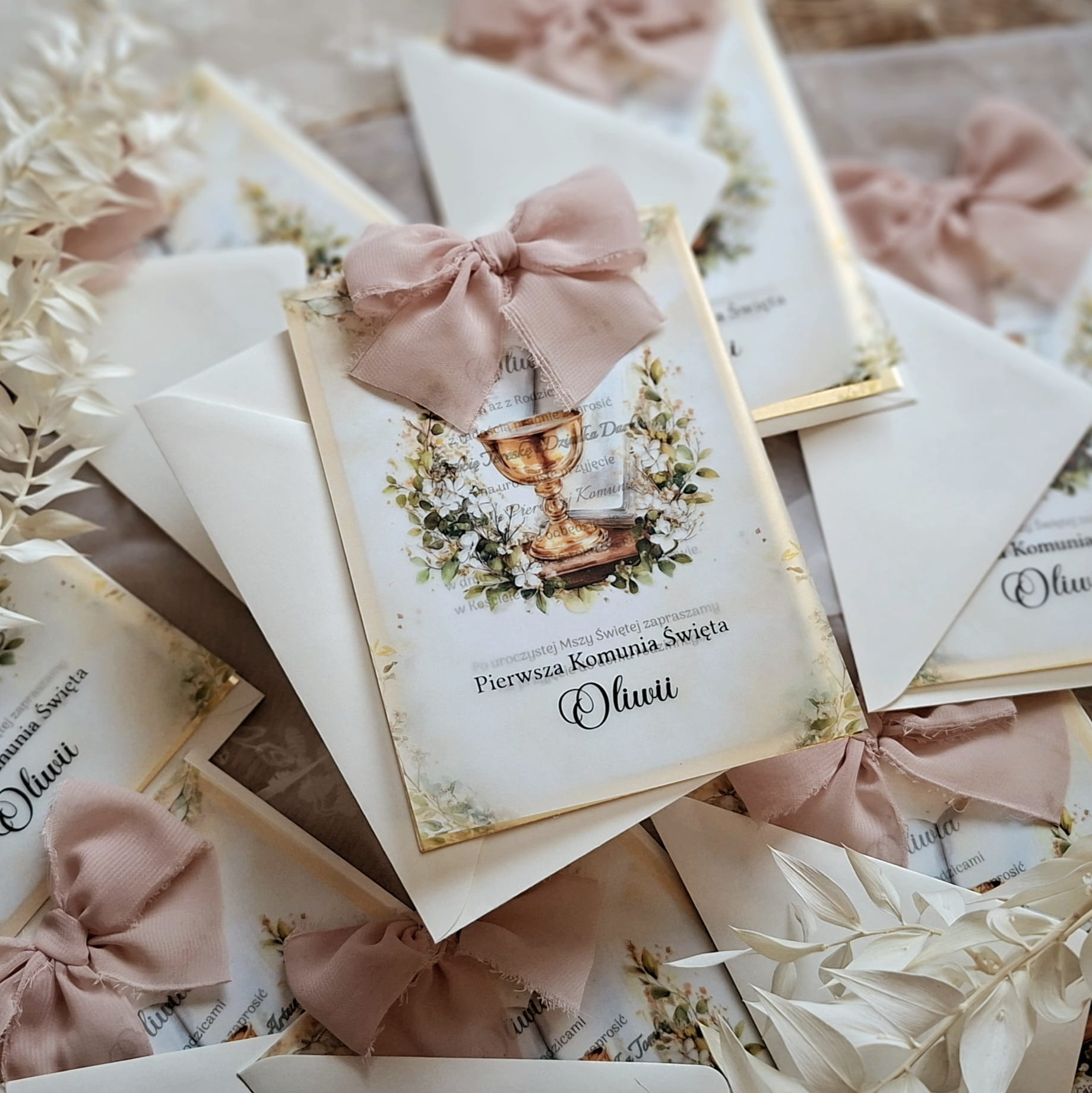 Zaproszenia na komunię z kalką, wstążeczką jedwabną oraz podkładem z papieru lustrzanego.