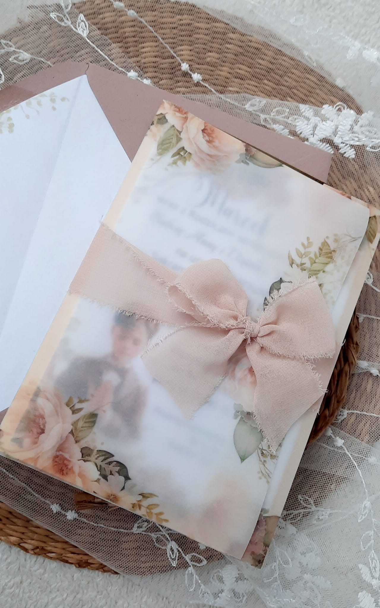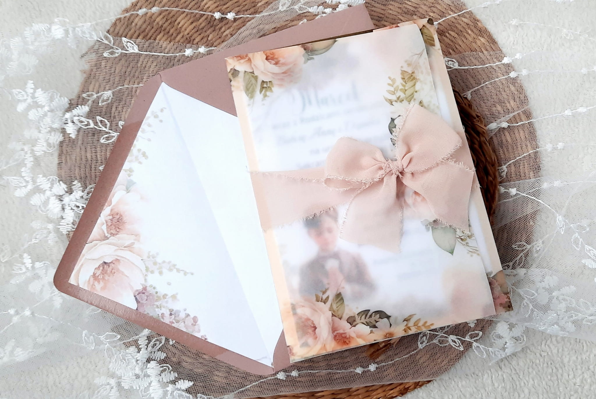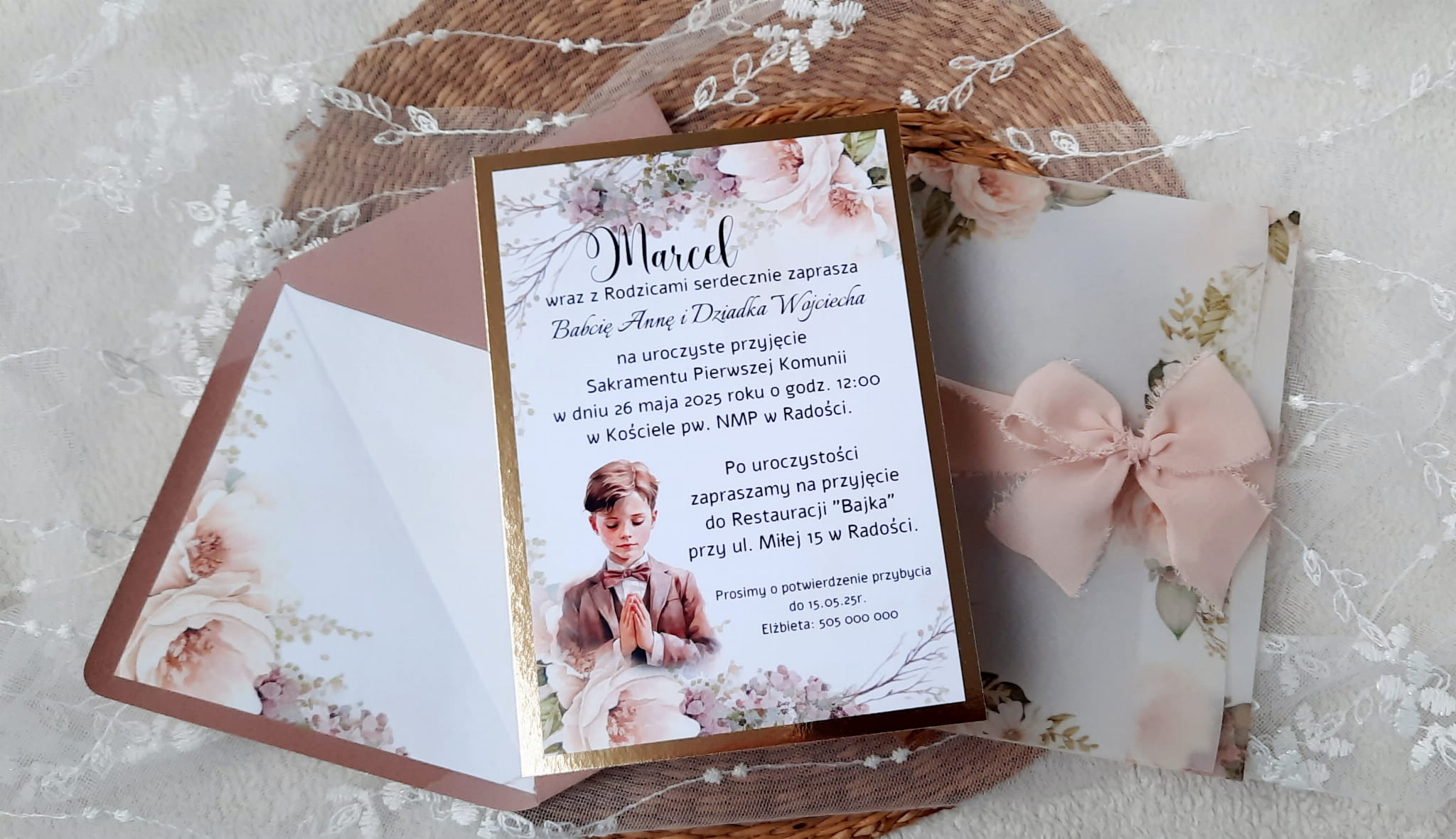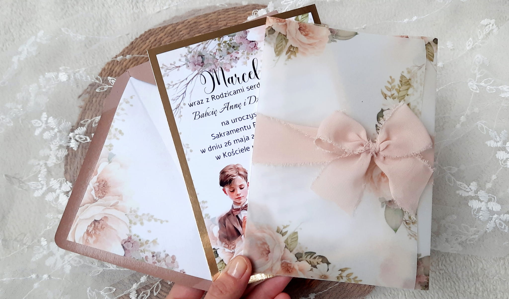 Zaproszenia na komunię z kalką, wstążeczką jedwabną oraz podkładem z papieru lustrzanego.