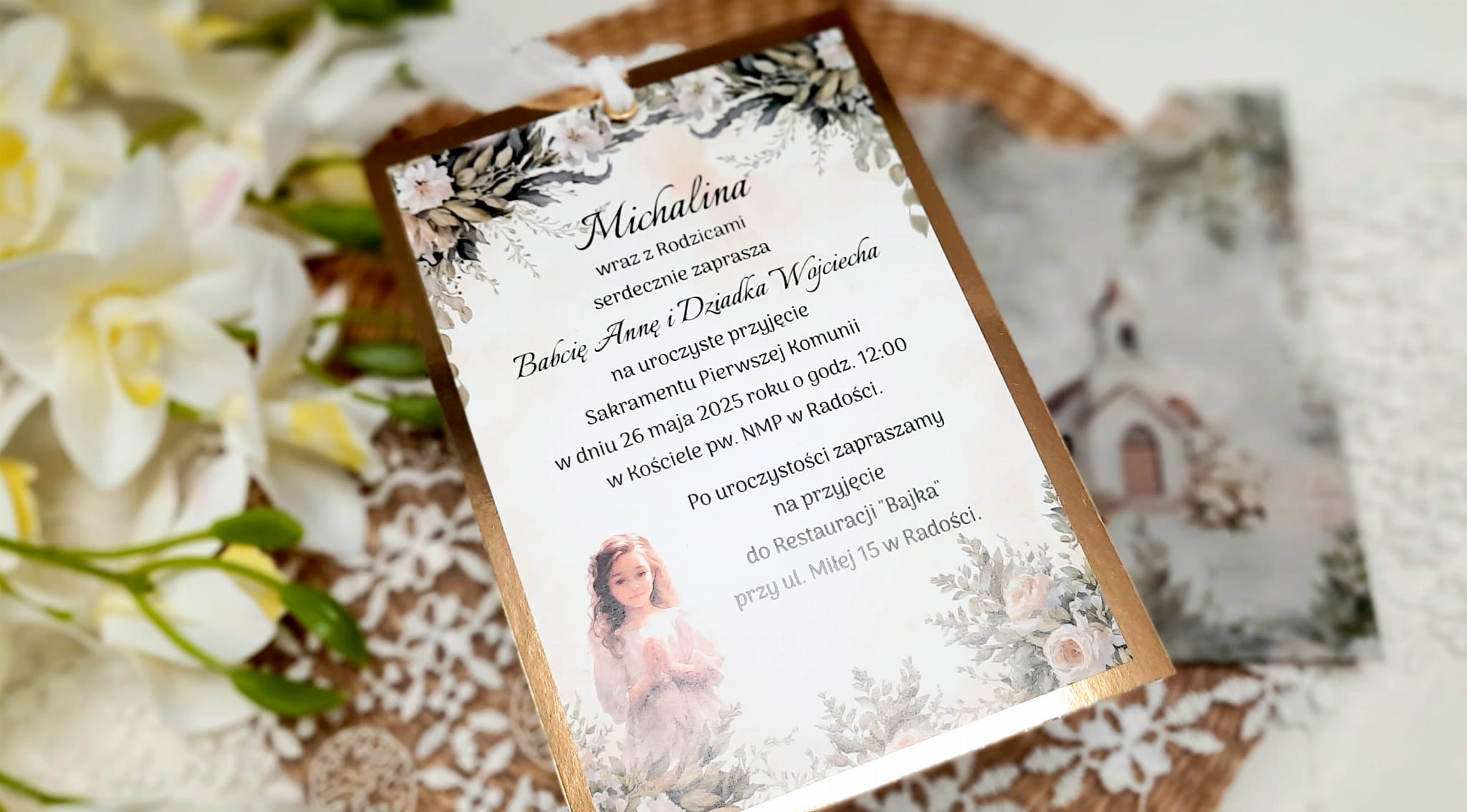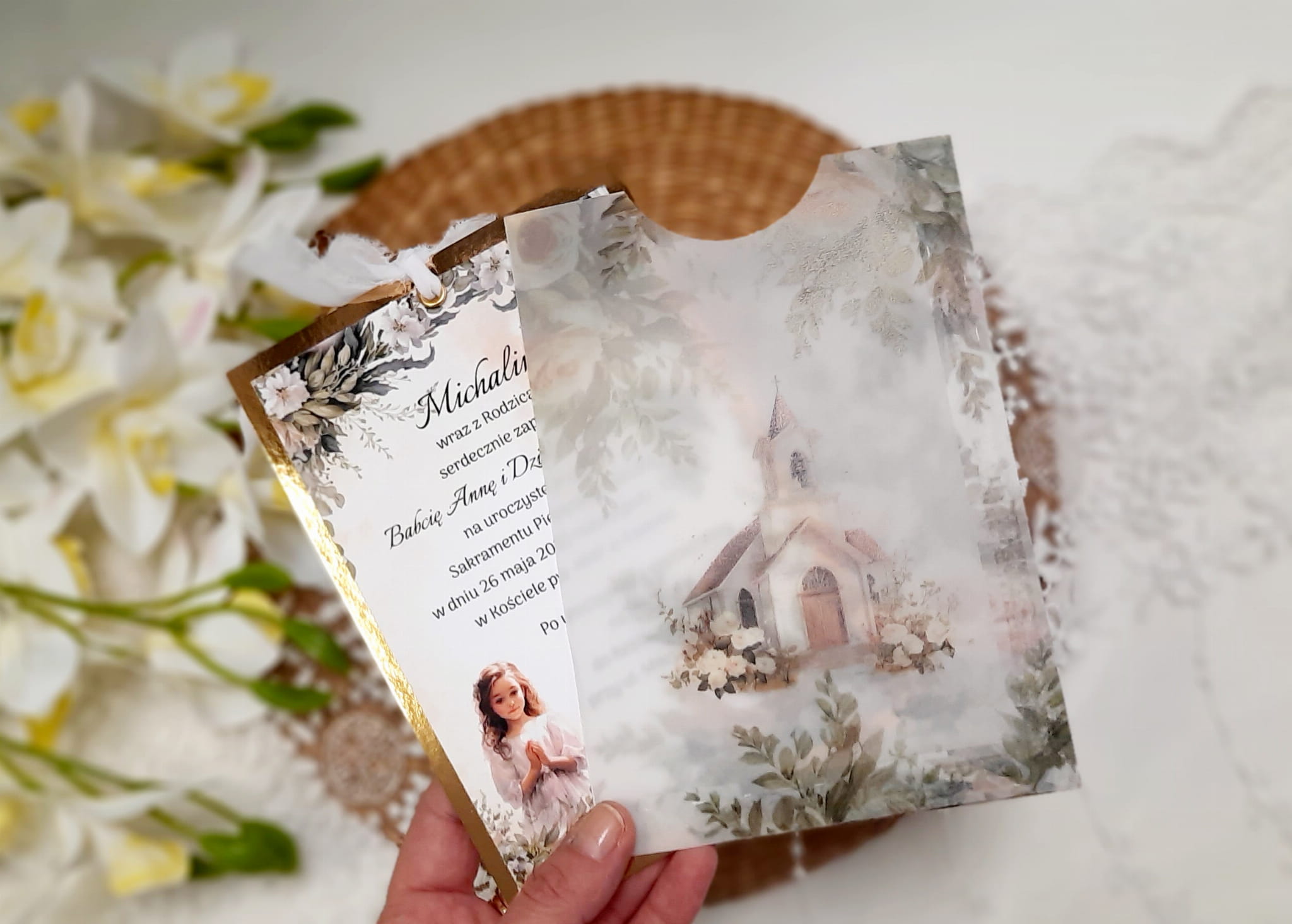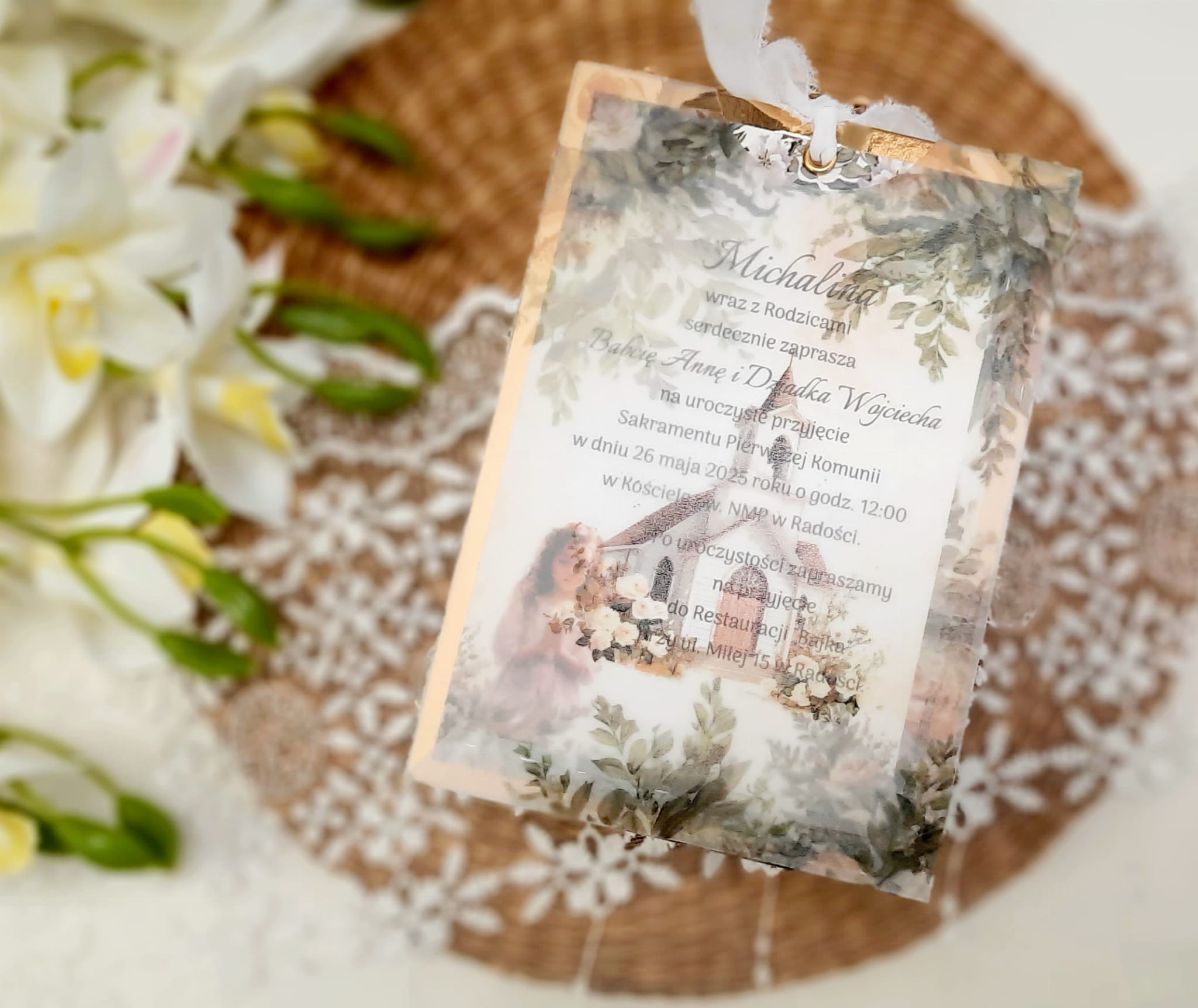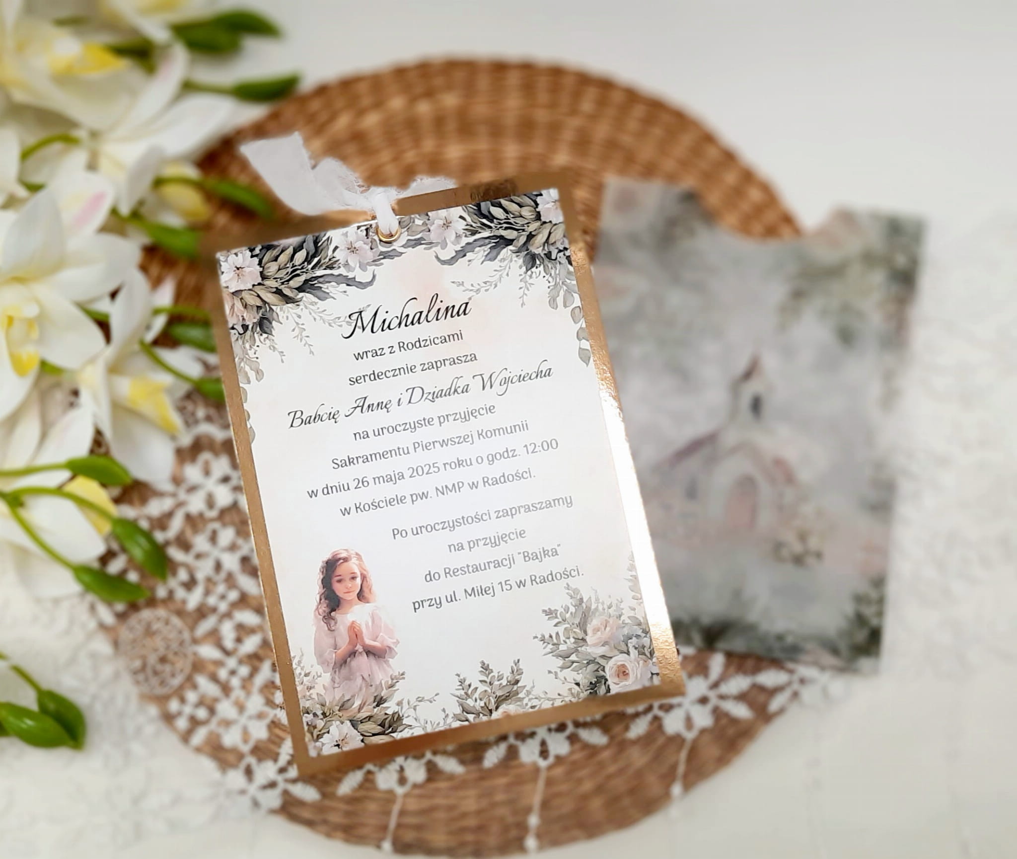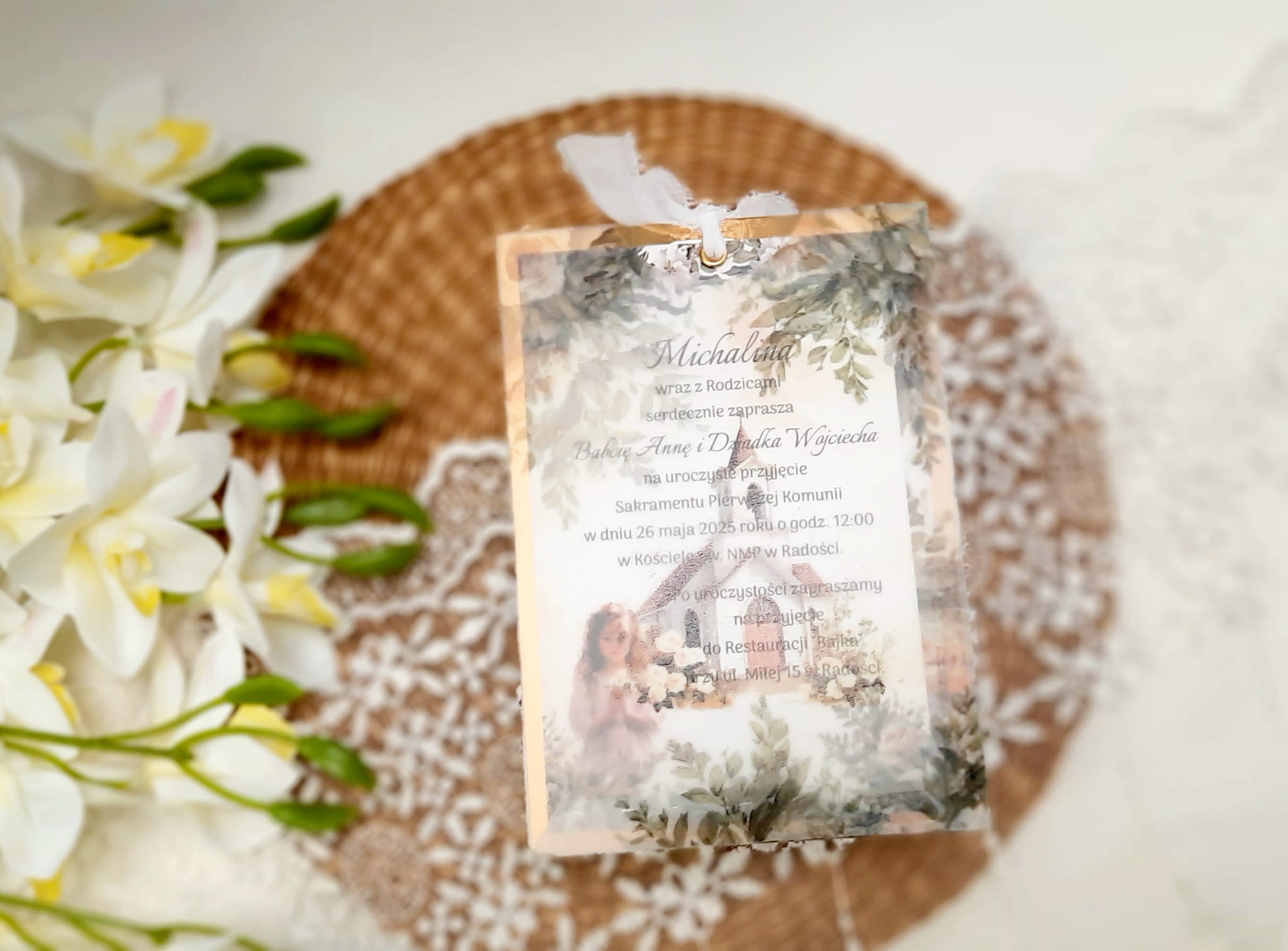Jednokartkowe zaproszenia na podkładzie z papieru lustrzanego, w kopercie z kalki, ze wstążeczką jedwabną.