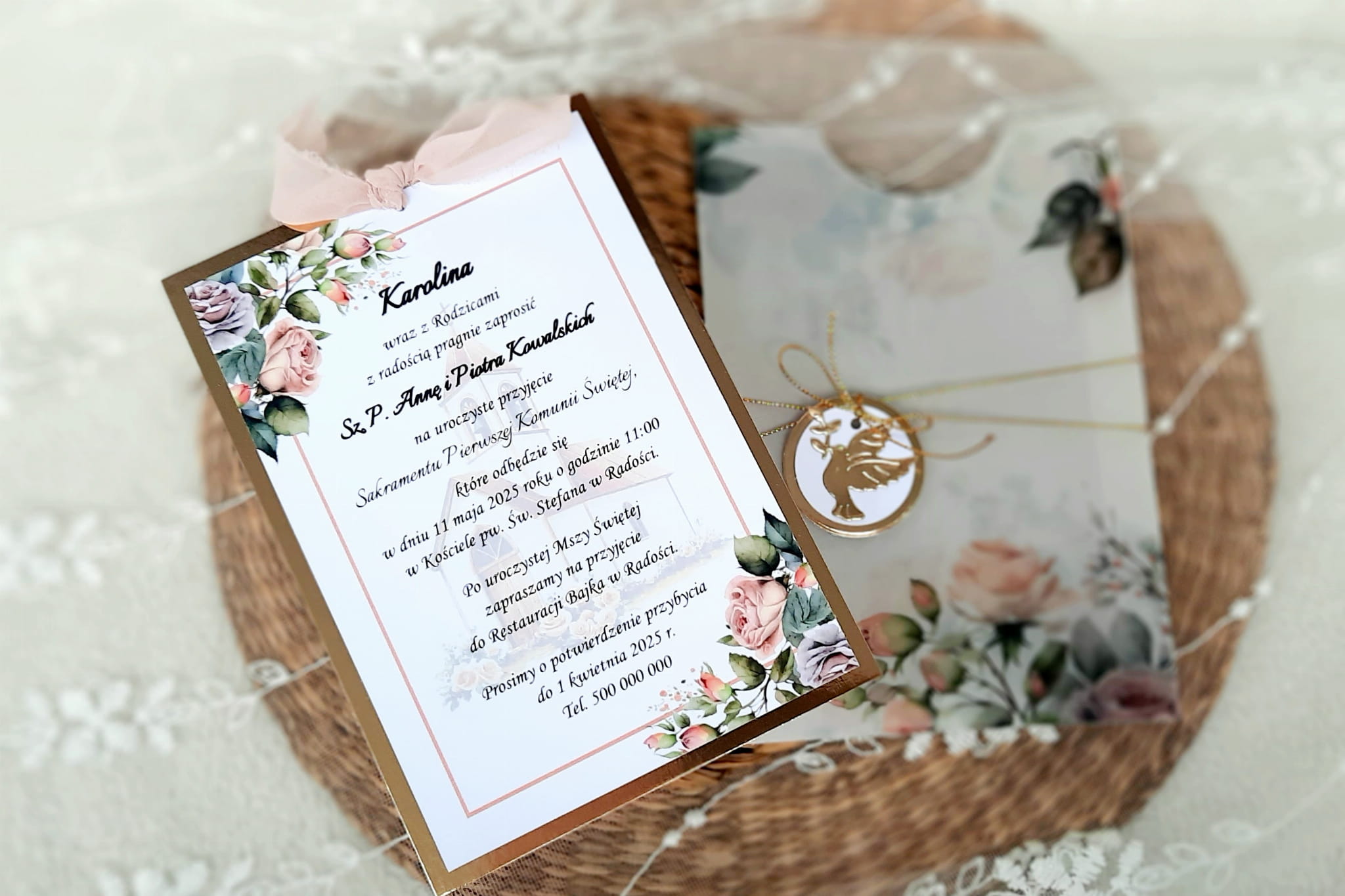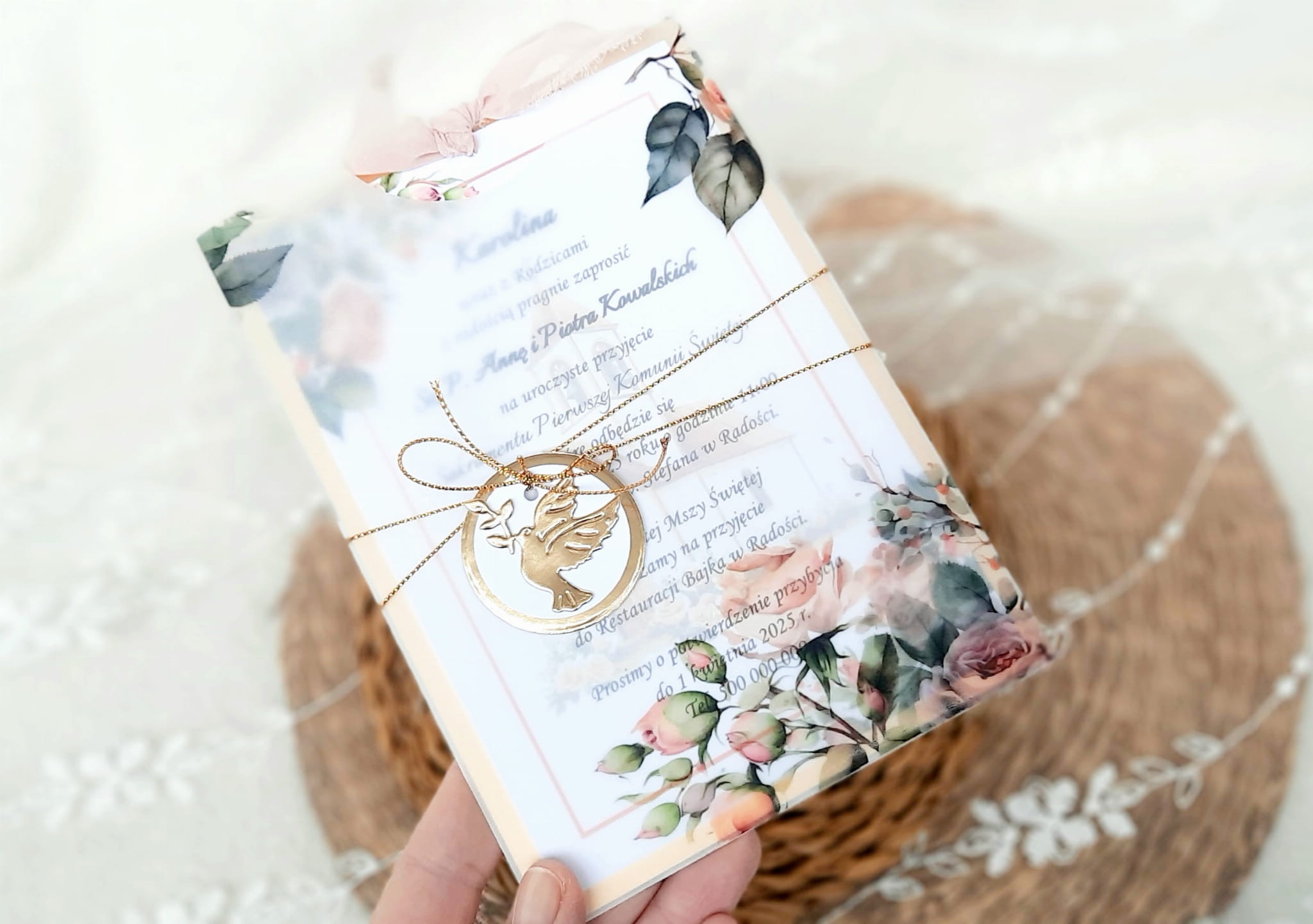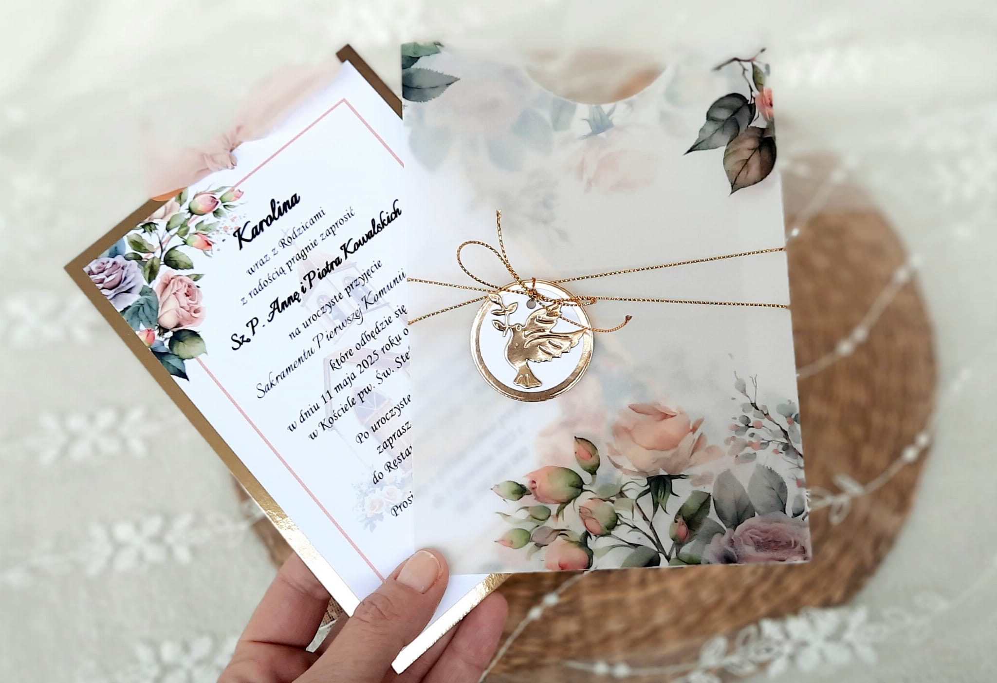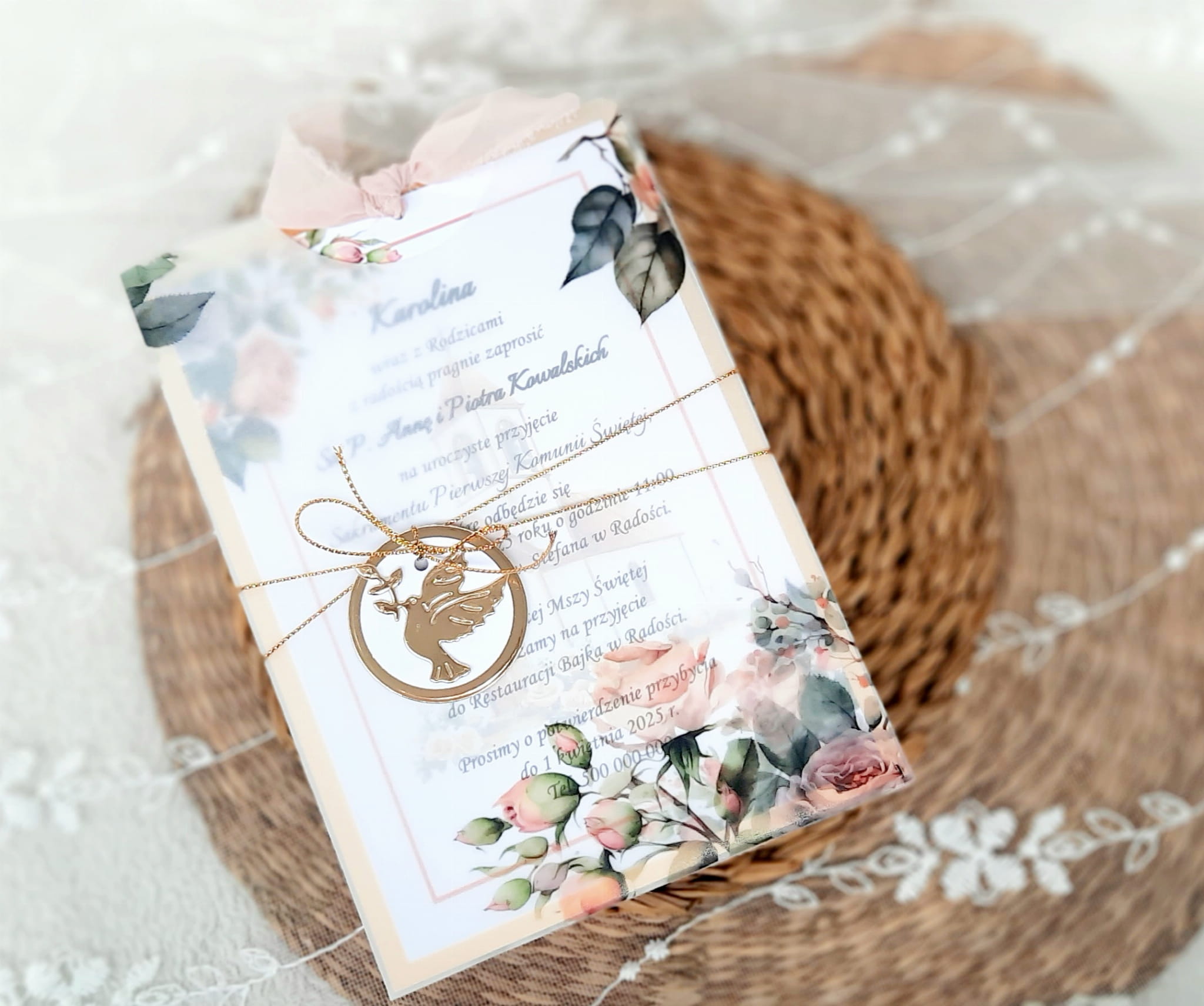 Jednokartkowe zaproszenia na podkładzie z papieru lustrzanego, w kopercie z kalki, ze wstążeczką jedwabną.