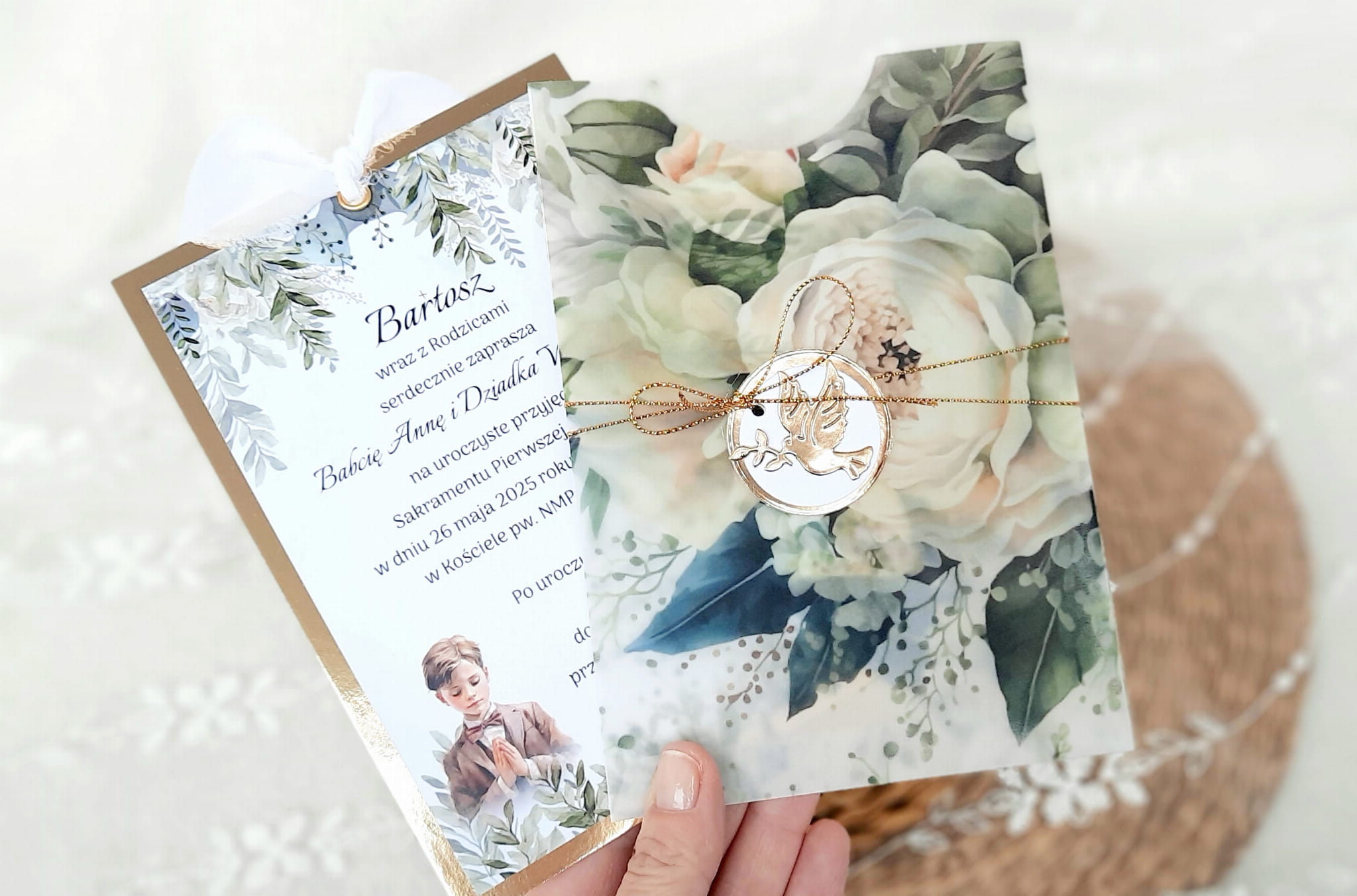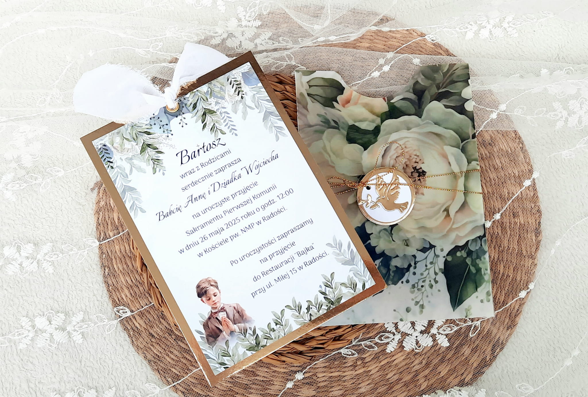 Jednokartkowe zaproszenia na podkładzie z papieru lustrzanego, w kopercie z kalki, ze wstążeczką jedwabną.