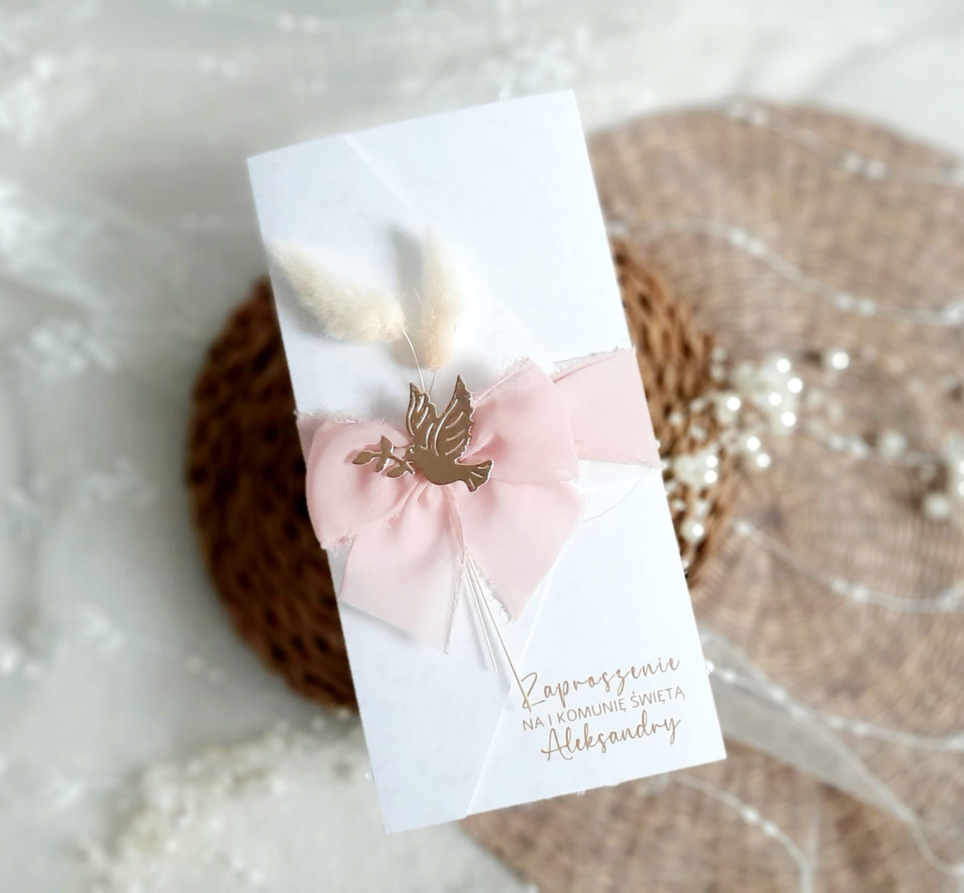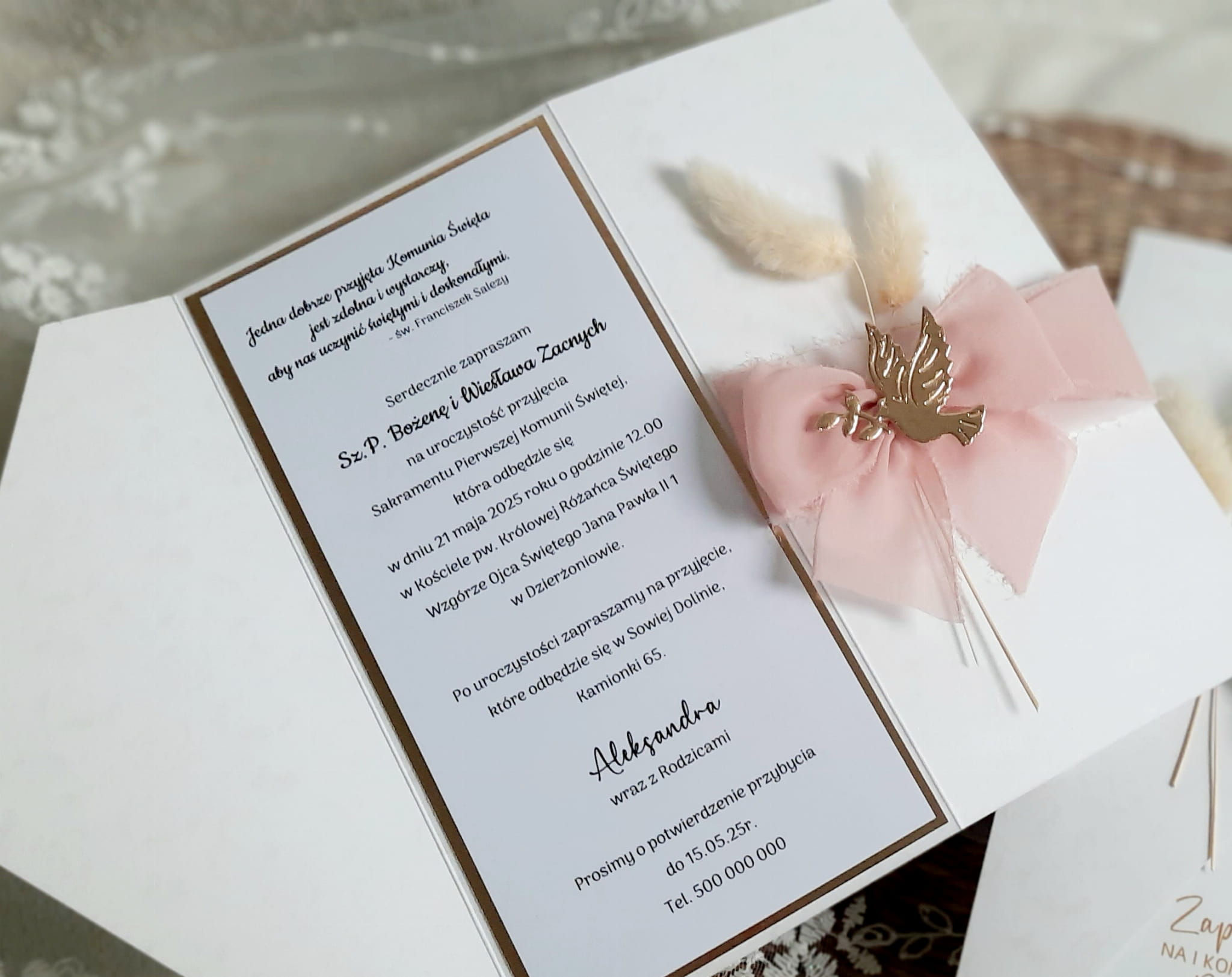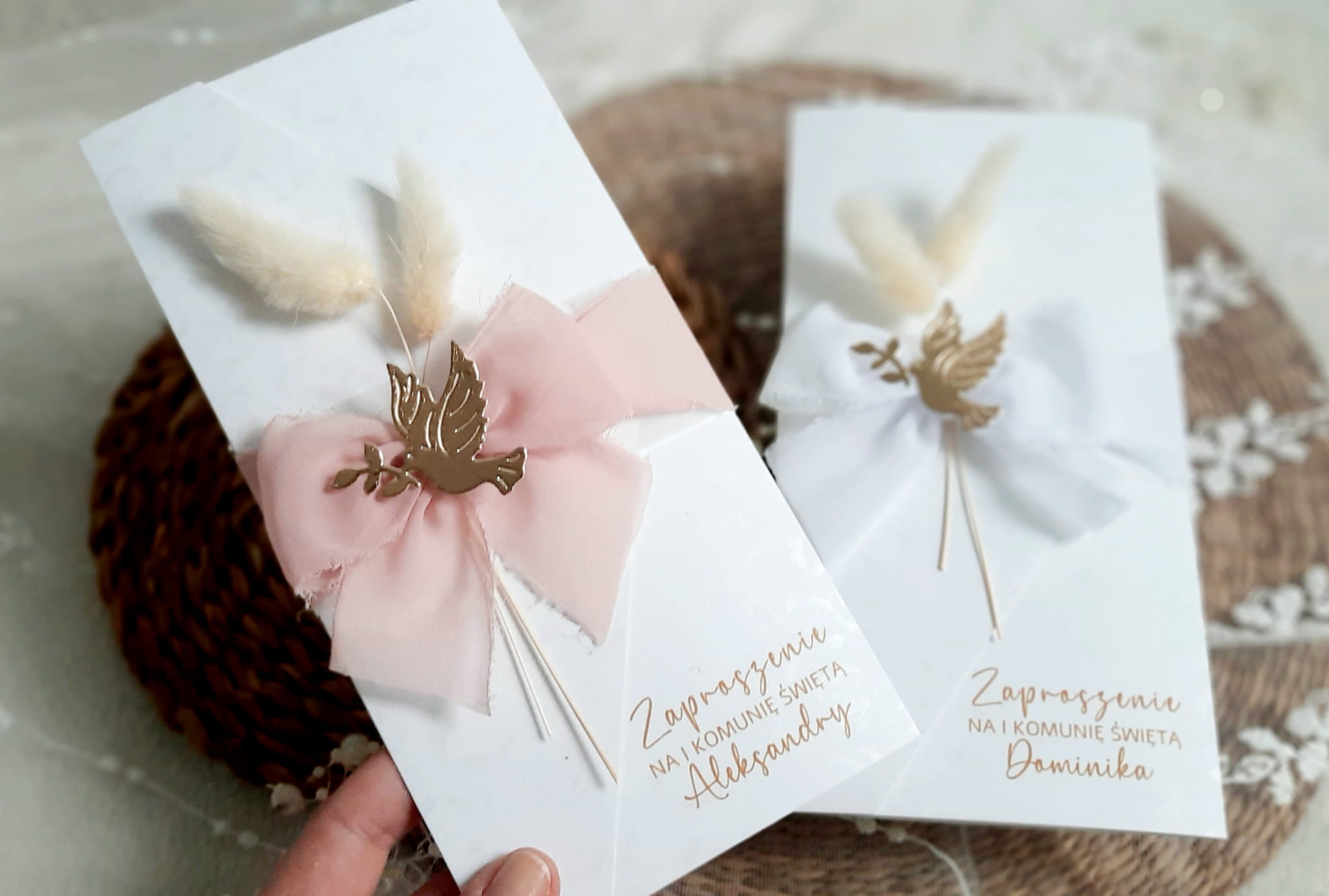 Eleganckie zaproszenia na komunię z pięknym papierem w różyczki, z szyfonową wstążeczką, suszkami i papierem lustrzanym w kolorze złotym lub srebrnym oraz z motywami religijnymi.