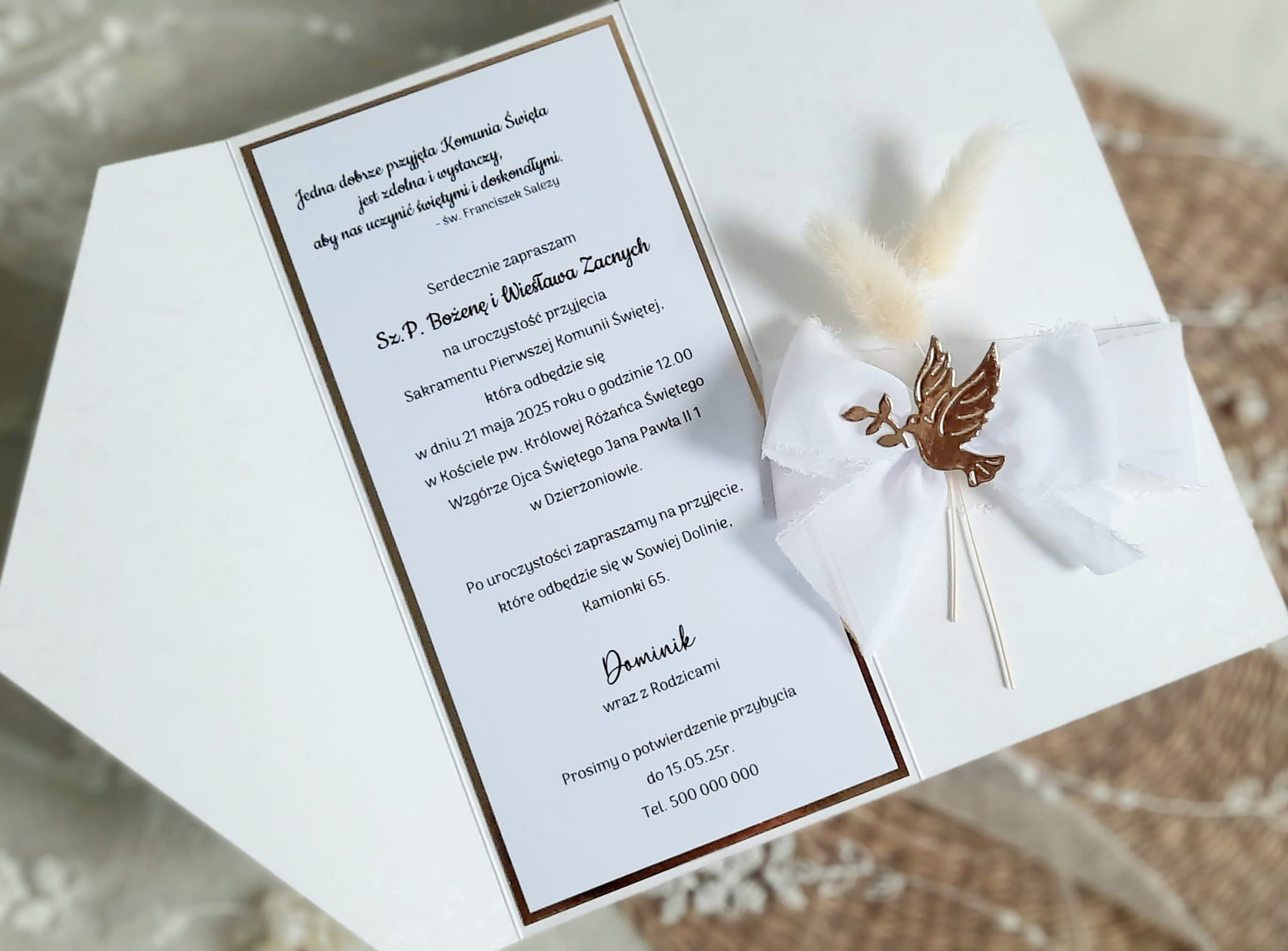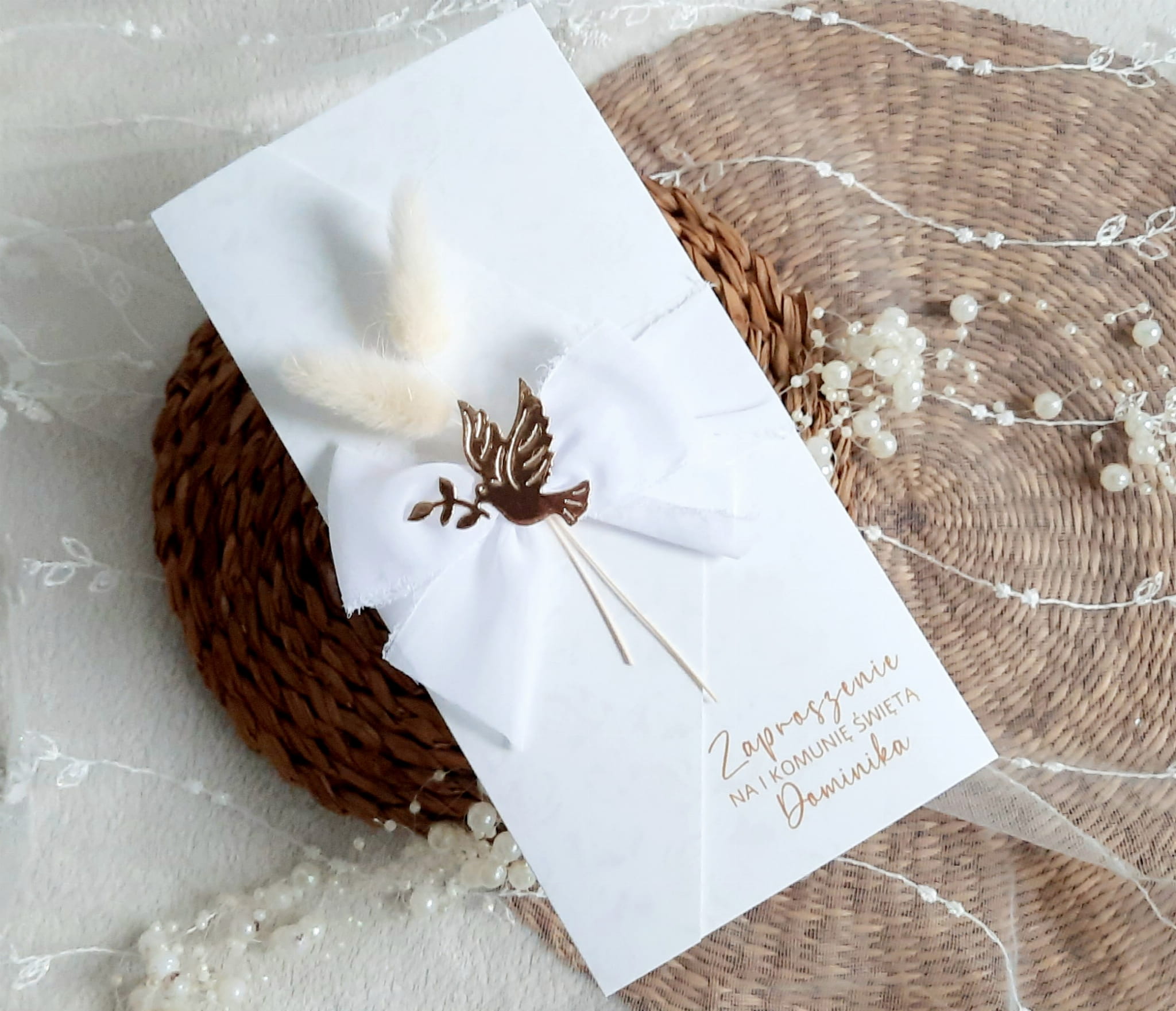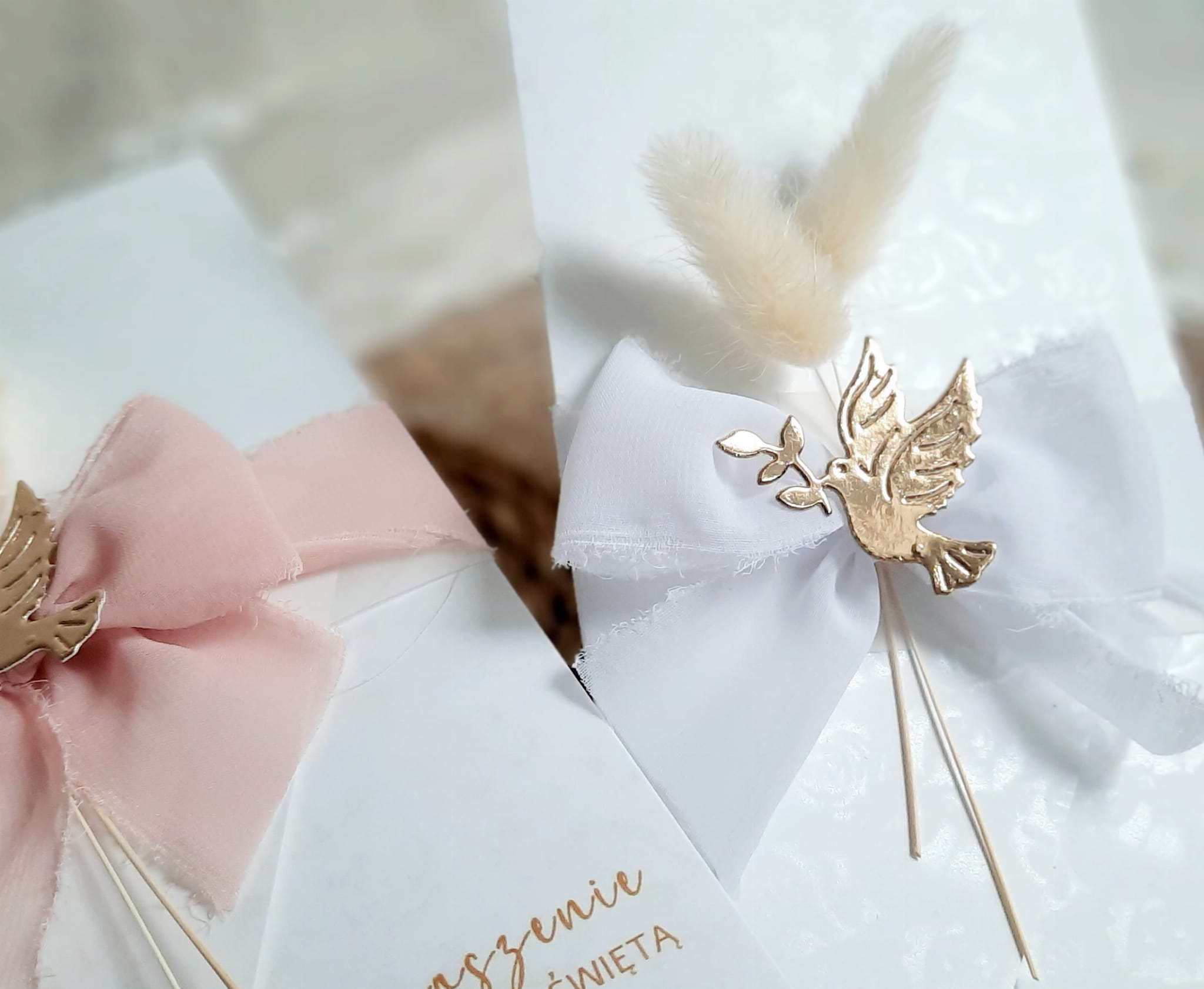 Eleganckie zaproszenia na komunię z pięknym papierem w różyczki, z szyfonową wstążeczką, suszkami i papierem lustrzanym w kolorze złotym lub srebrnym oraz z motywami religijnymi.