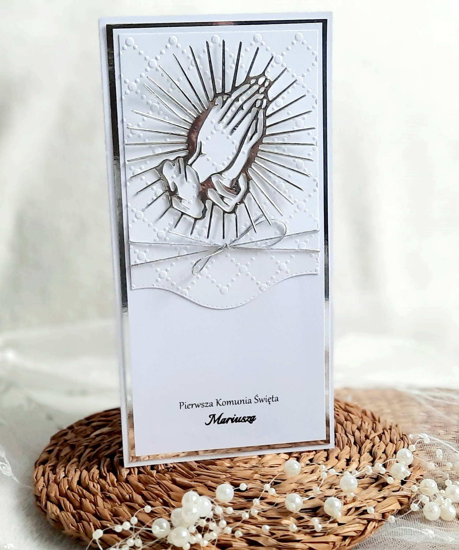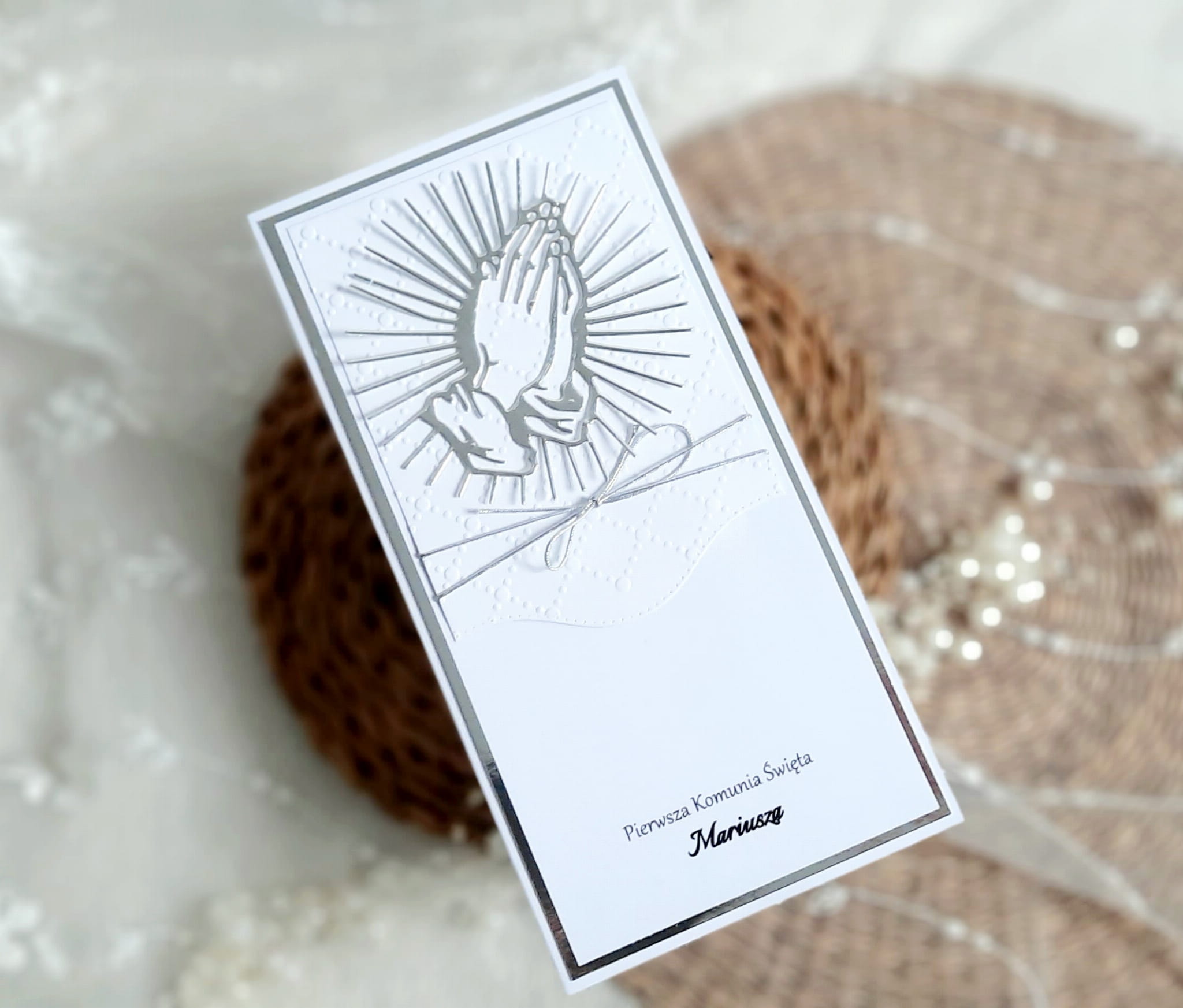 Eleganckie zaproszenia na komunię z papierem lustrzanym w kolorze złotym lub srebrnym, z asymetrycznym wycięciem, tłoczeniem oraz z motywem religijnym