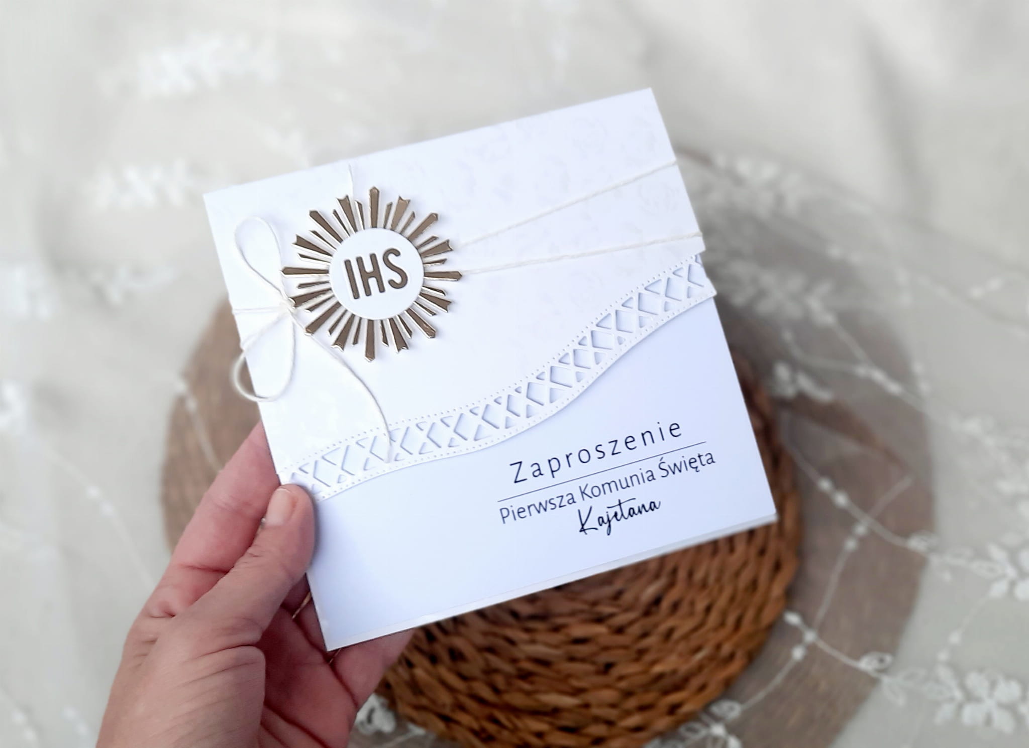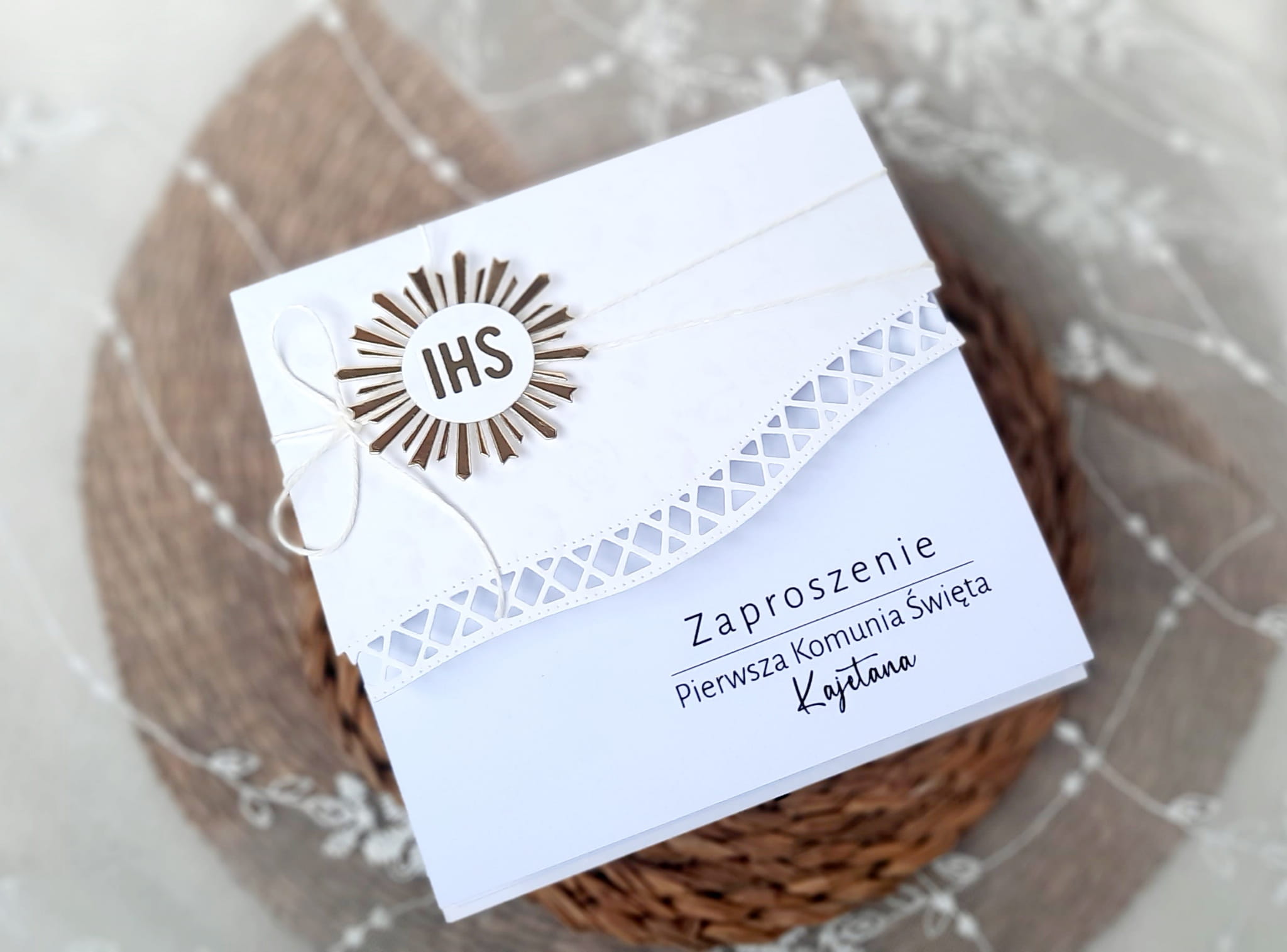 Eleganckie zaproszenia na komunię z białym papierem w różyczki.