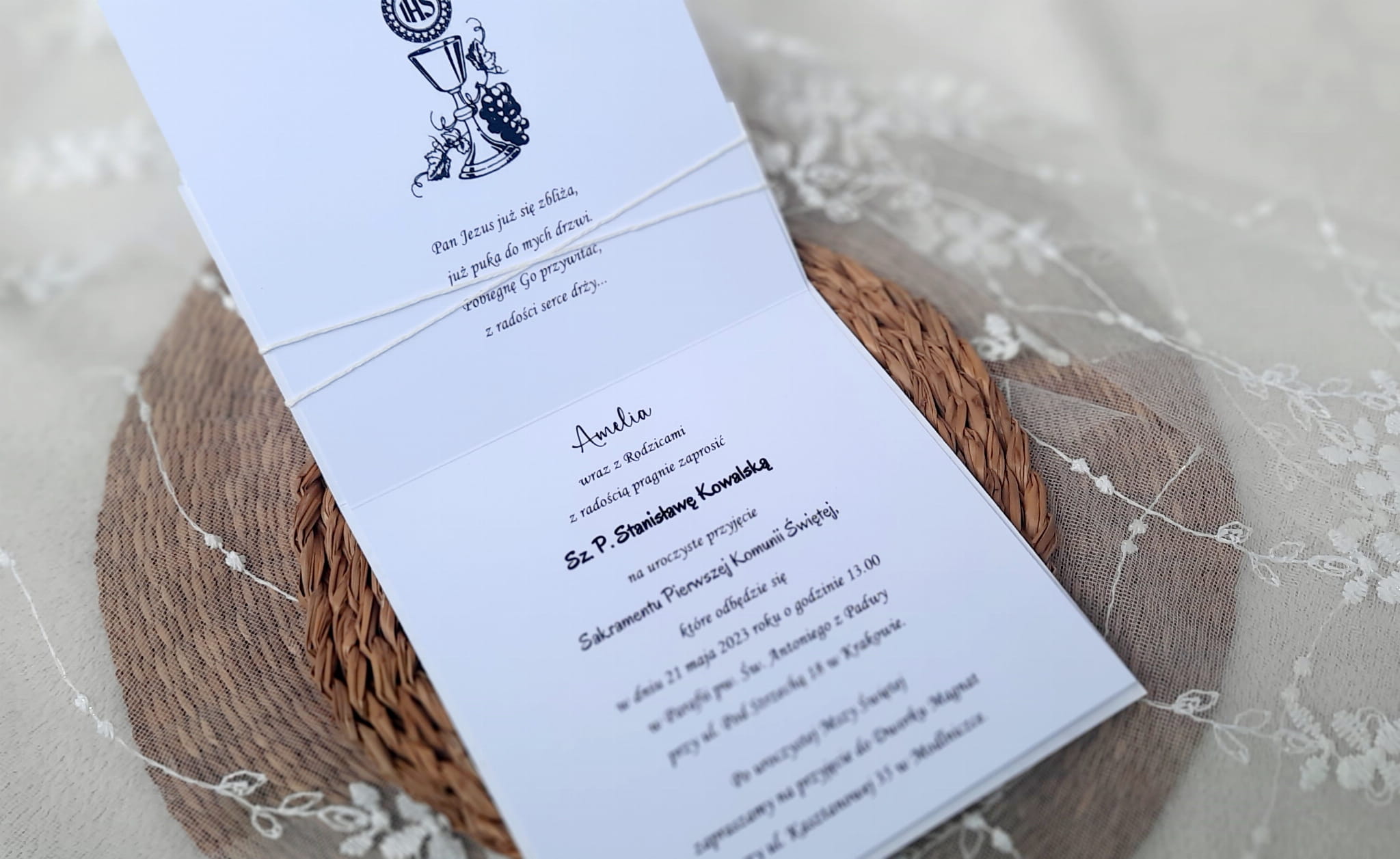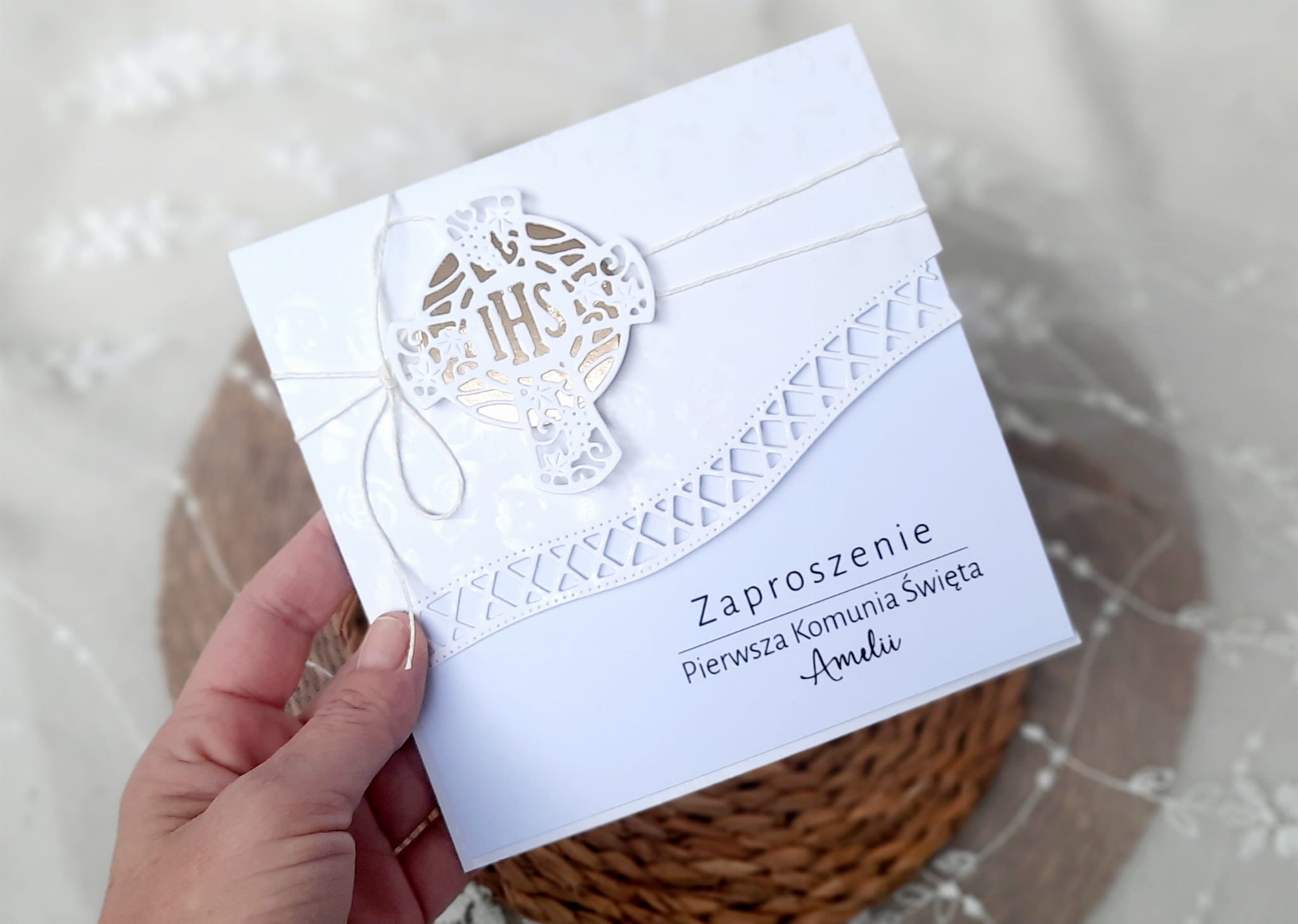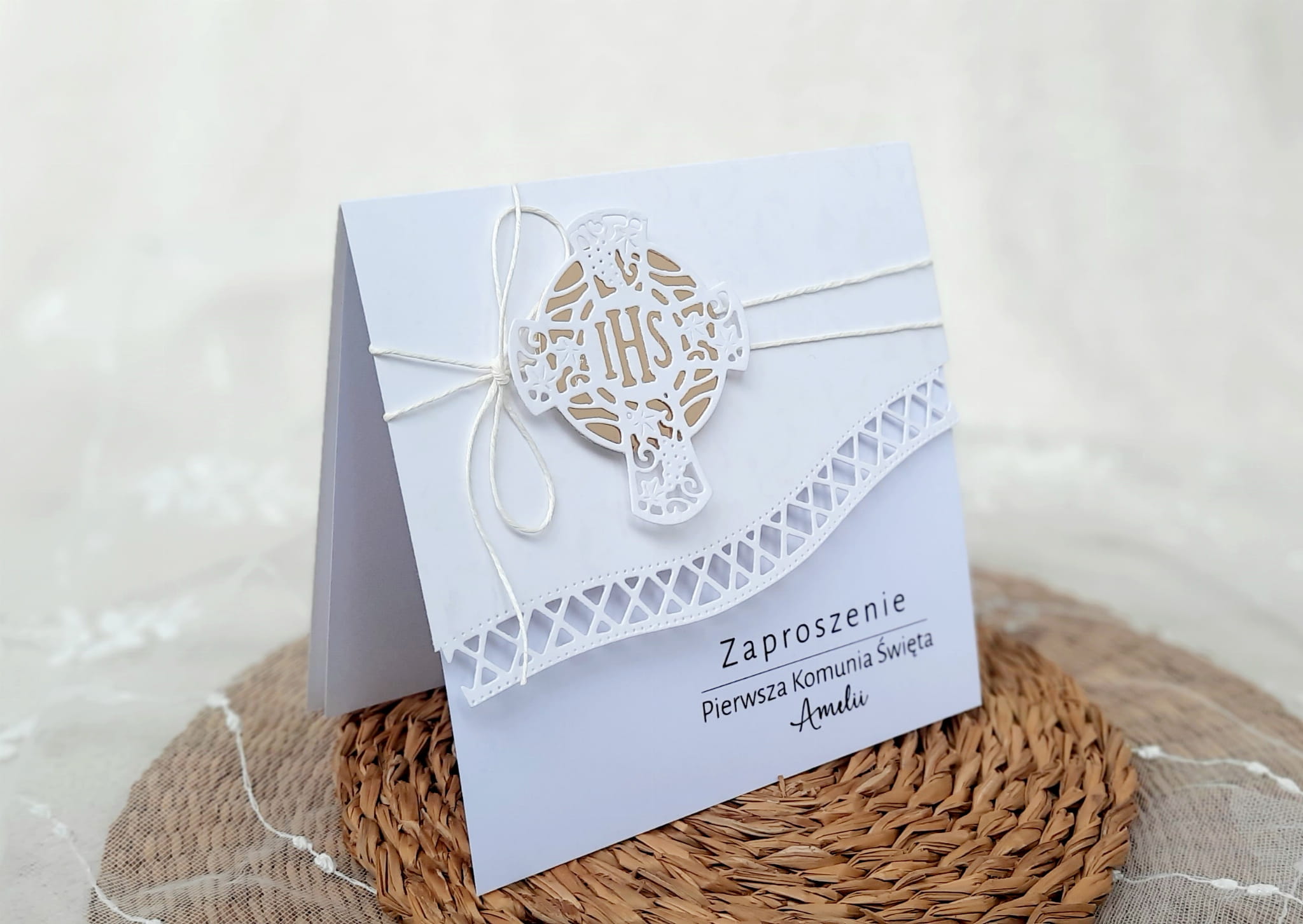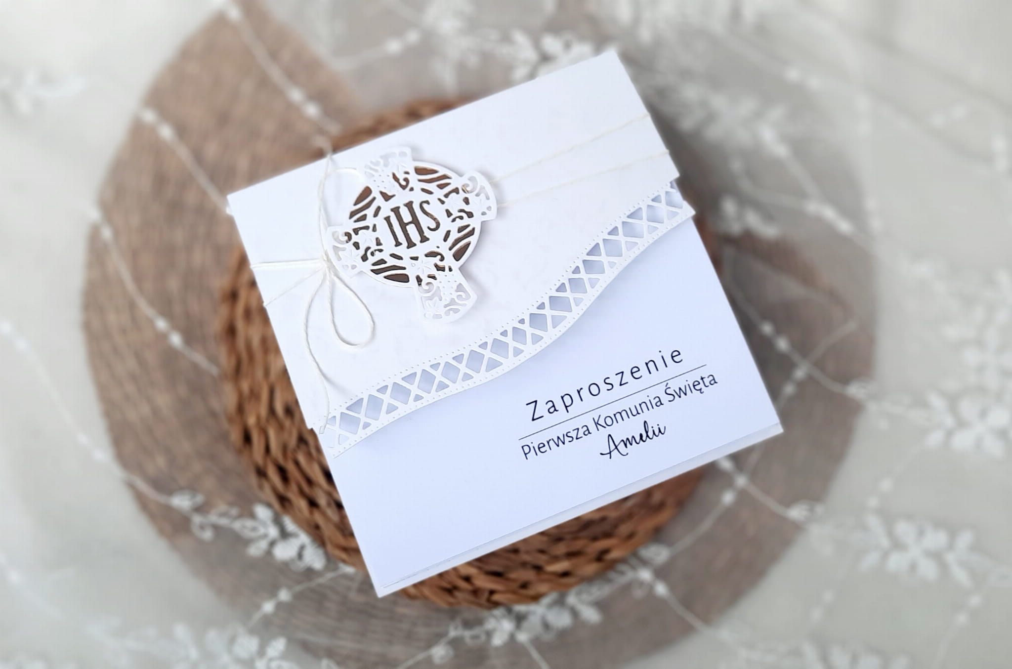 Eleganckie zaproszenia na komunię z białym papierem w różyczki.