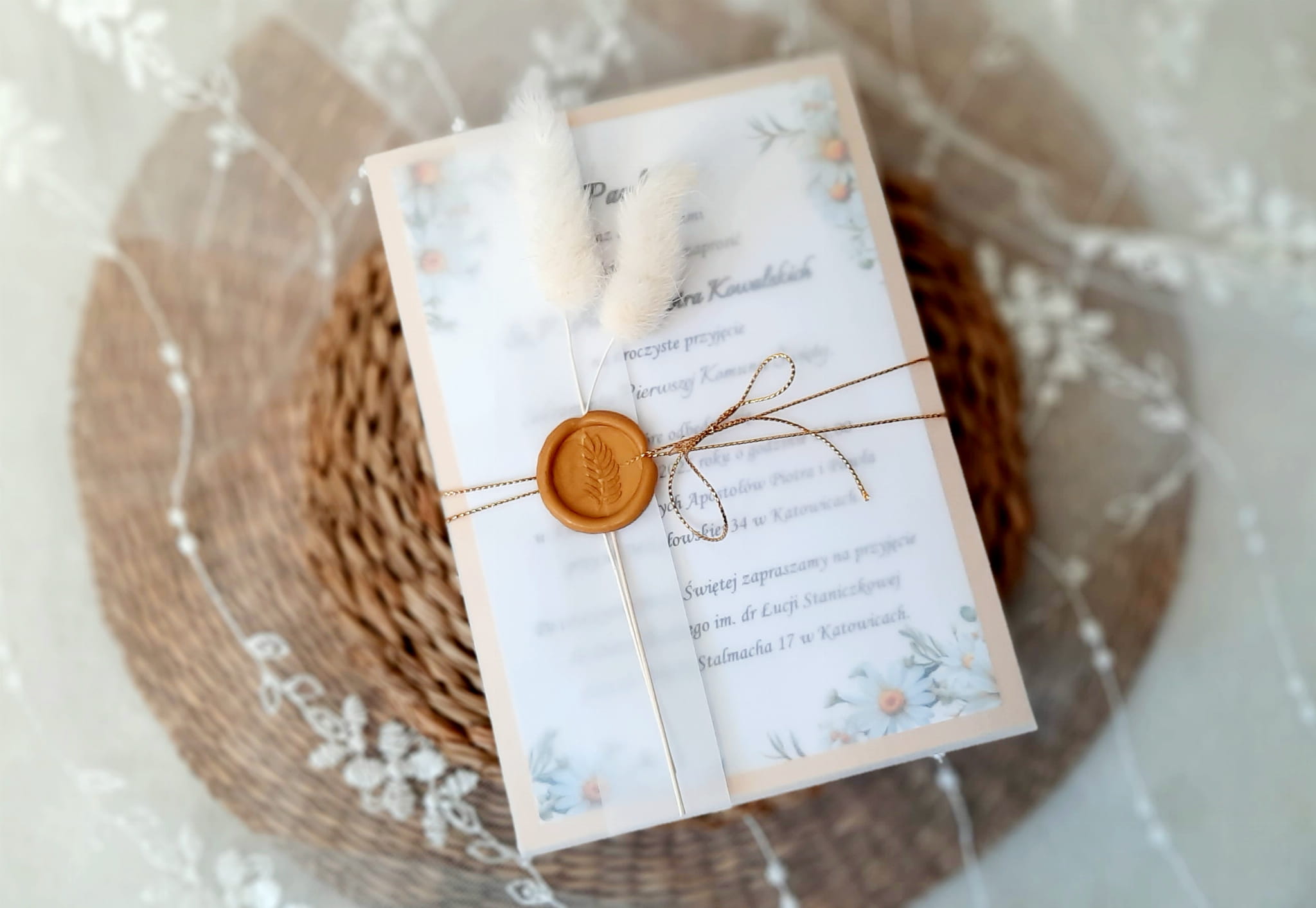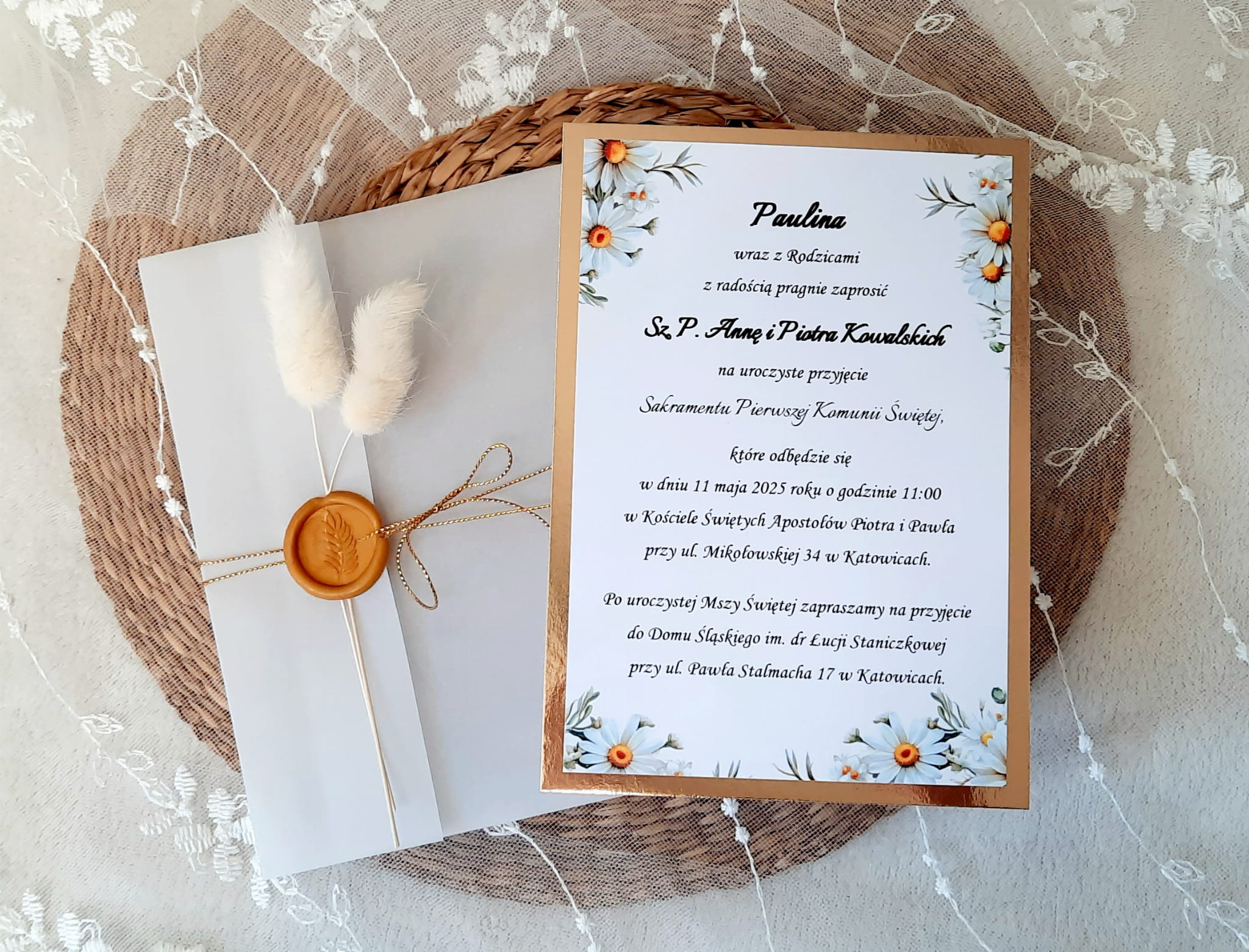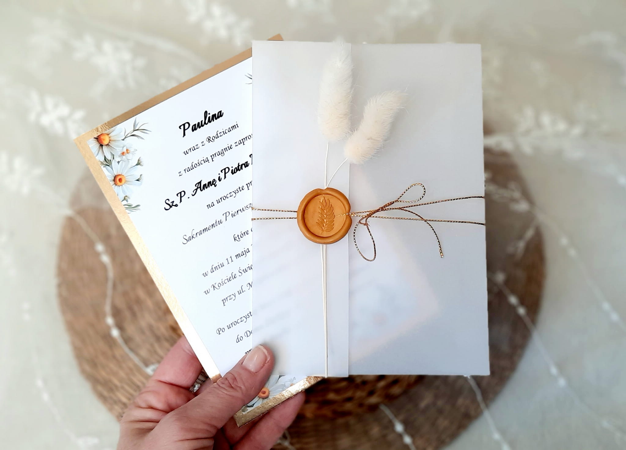 Eleganckie zaproszenia na komunię z motywem stokrotki, z delikatną kalką, papierem lustrzanym w kolorze złotym lub srebrnym, odbiciem lakowym i sznureczkiem.