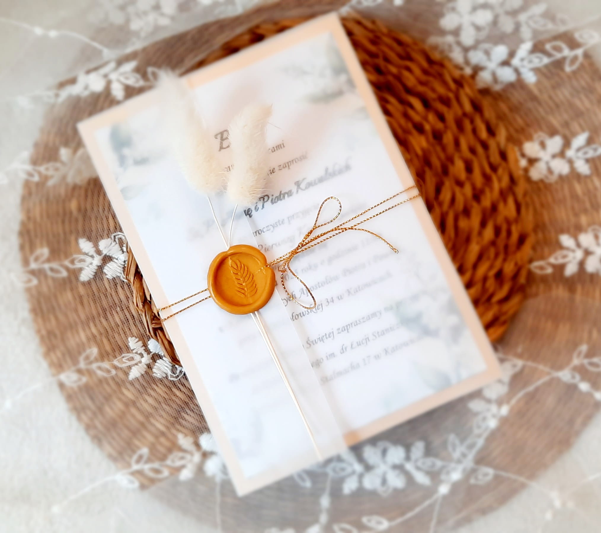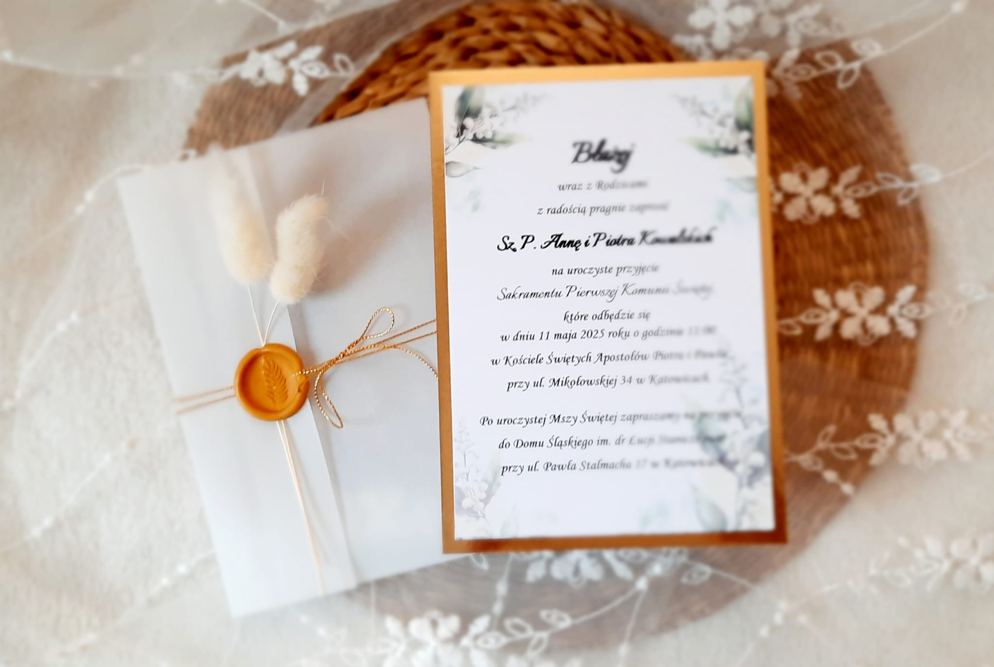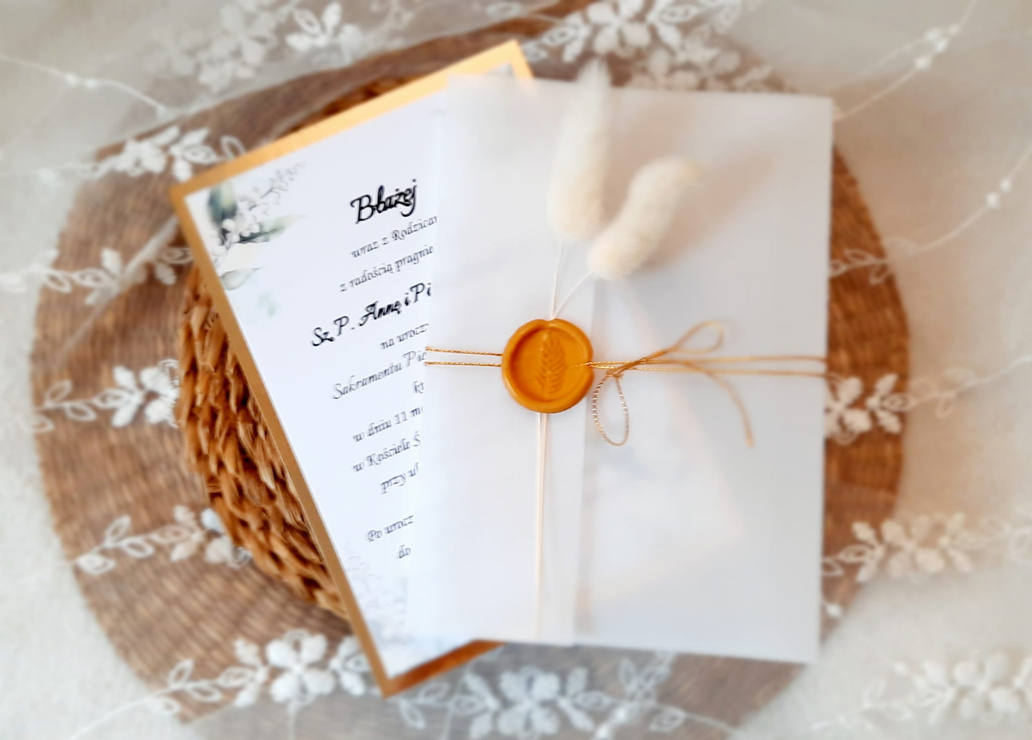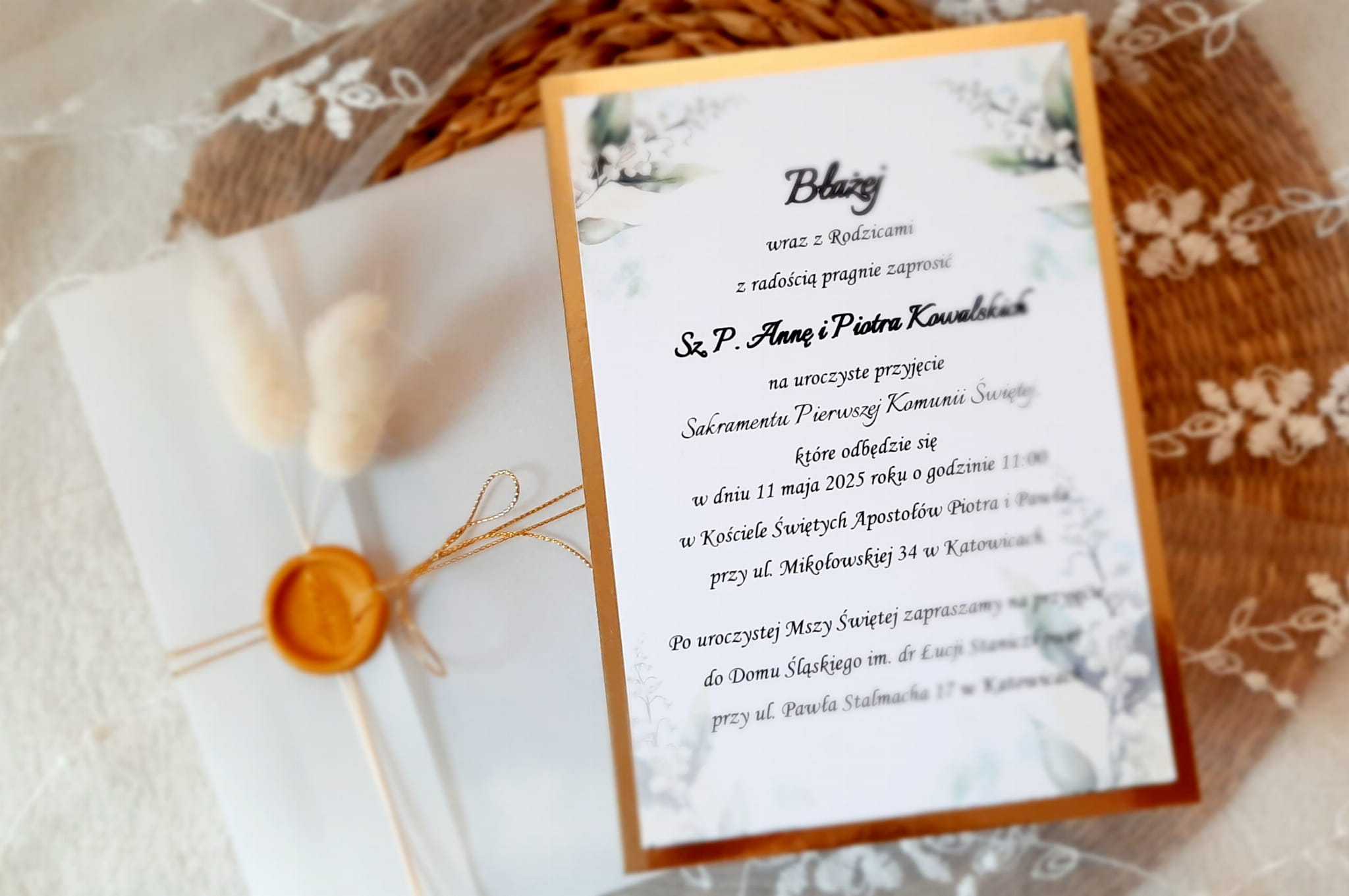 Eleganckie zaproszenia na komunię z motywem konwalii, z delikatną kalką, papierem lustrzanym w kolorze złotym lub srebrnym, odbiciem lakowym i sznureczkiem.