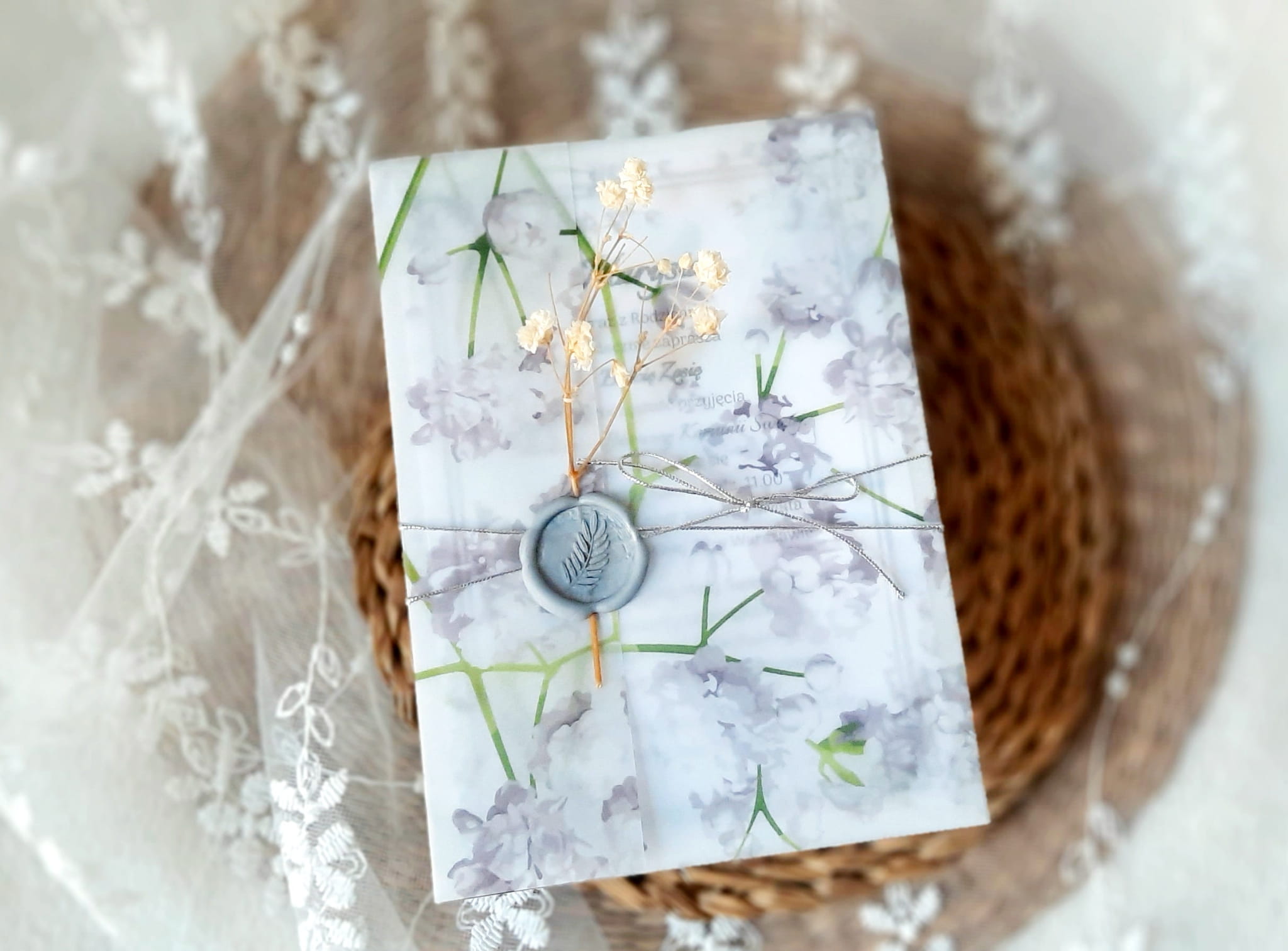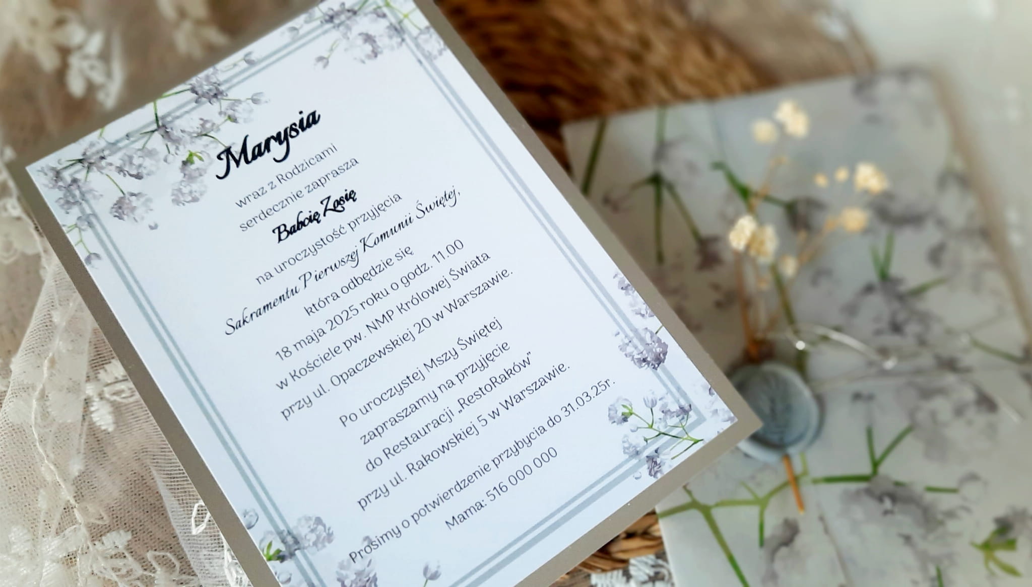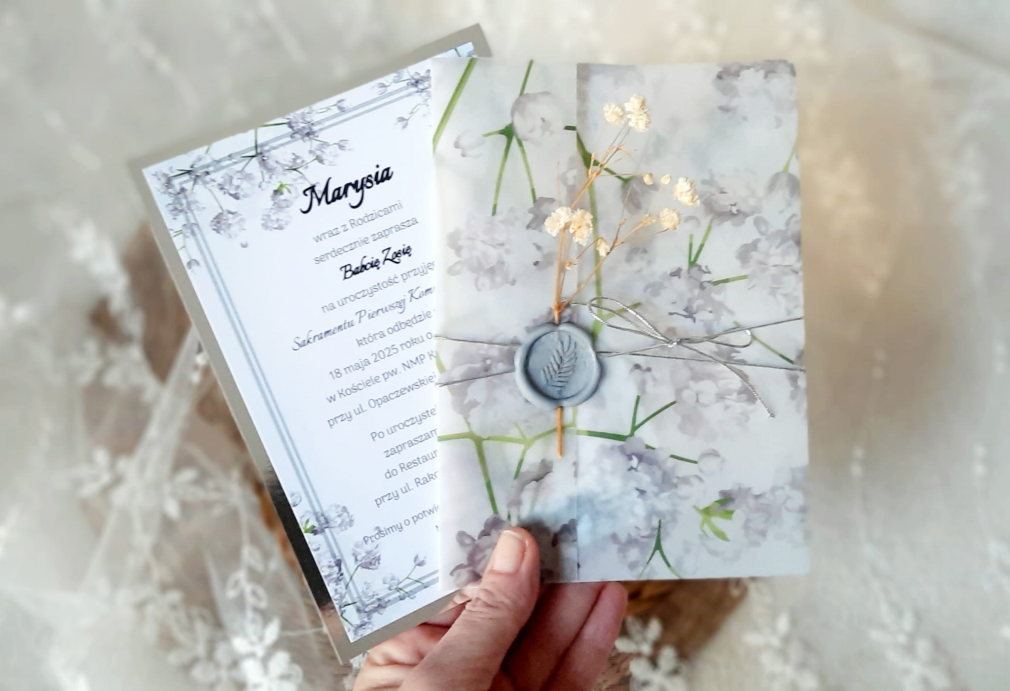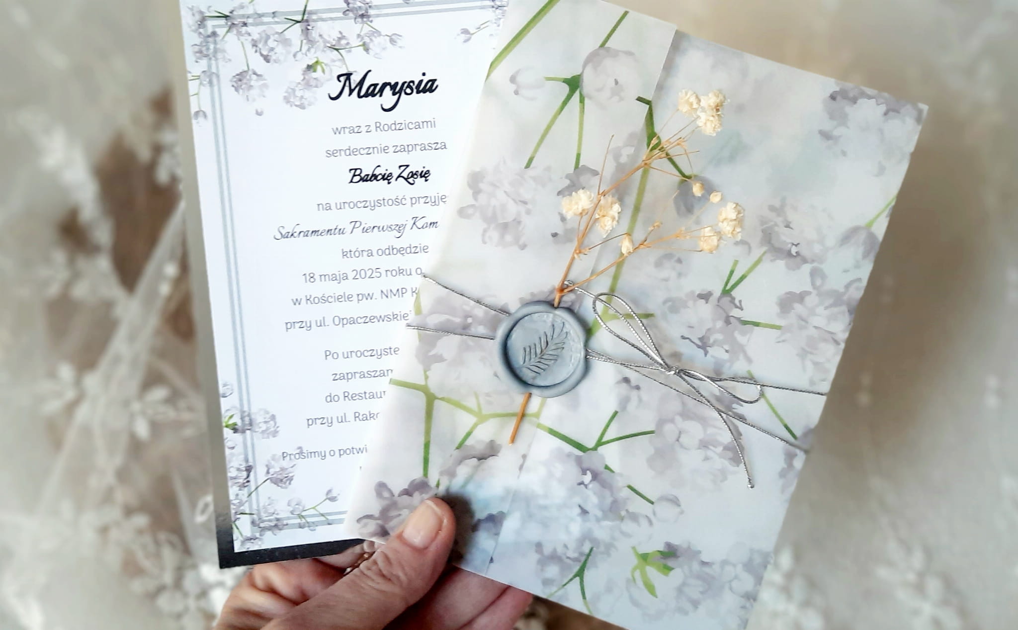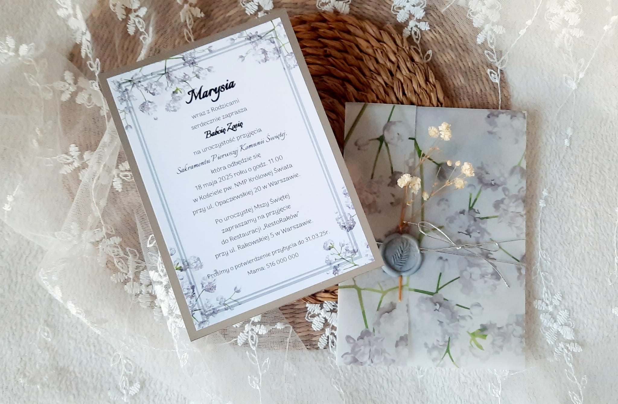 Eleganckie zaproszenia na komunię z delikatną kalką, papierem lustrzanym w kolorze złotym lub srebrnym, odbiciem lakowym i sznureczkiem.