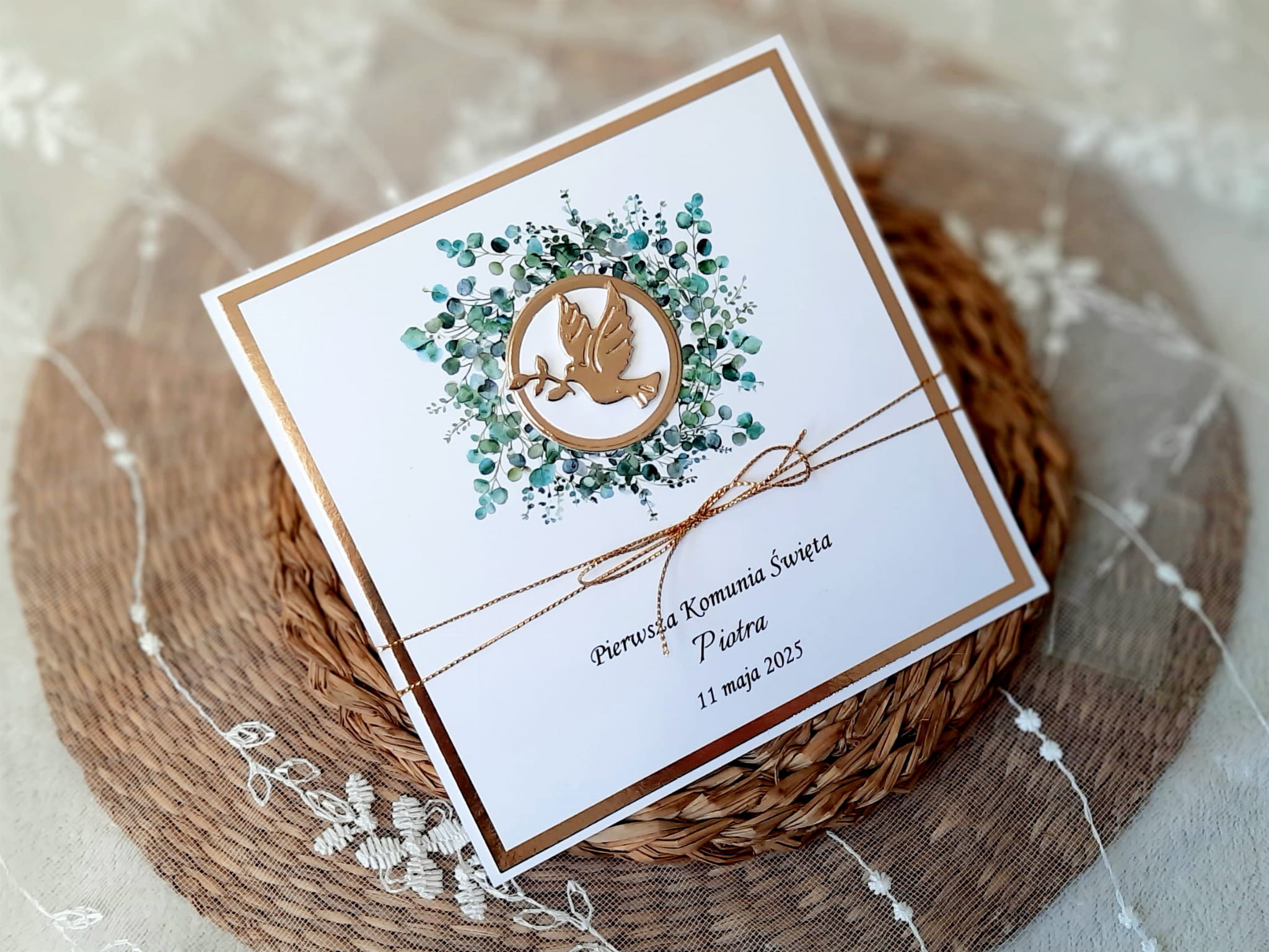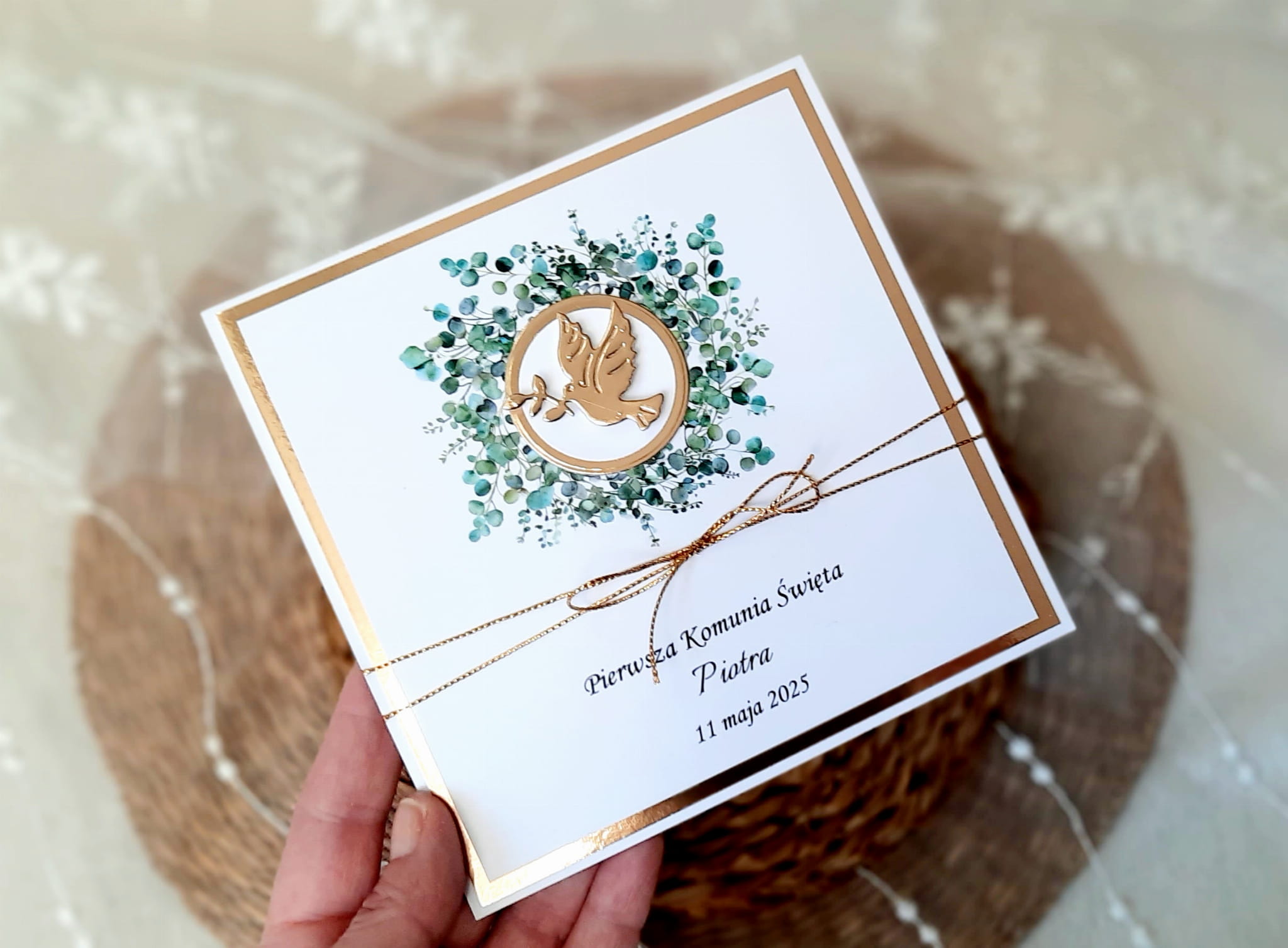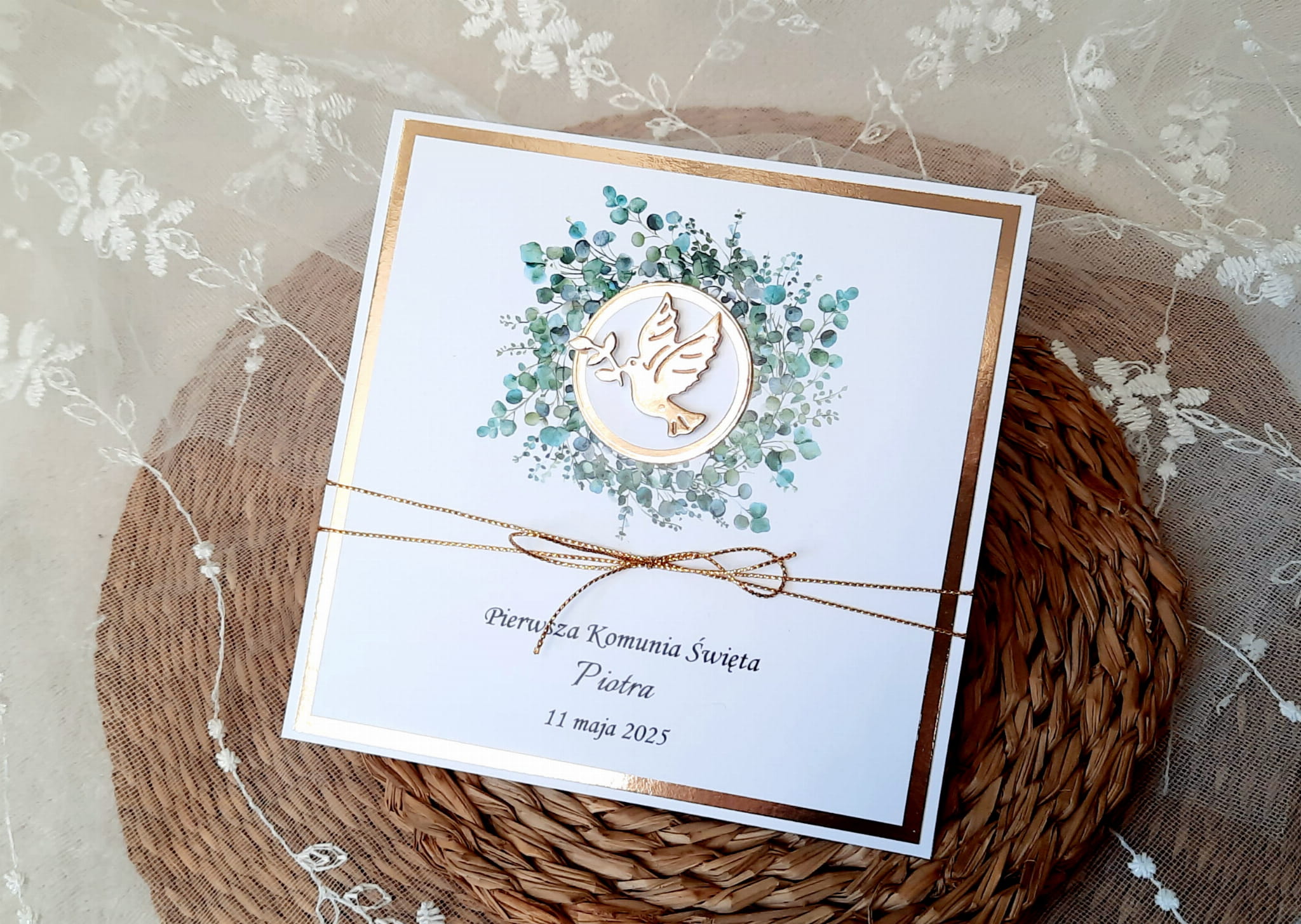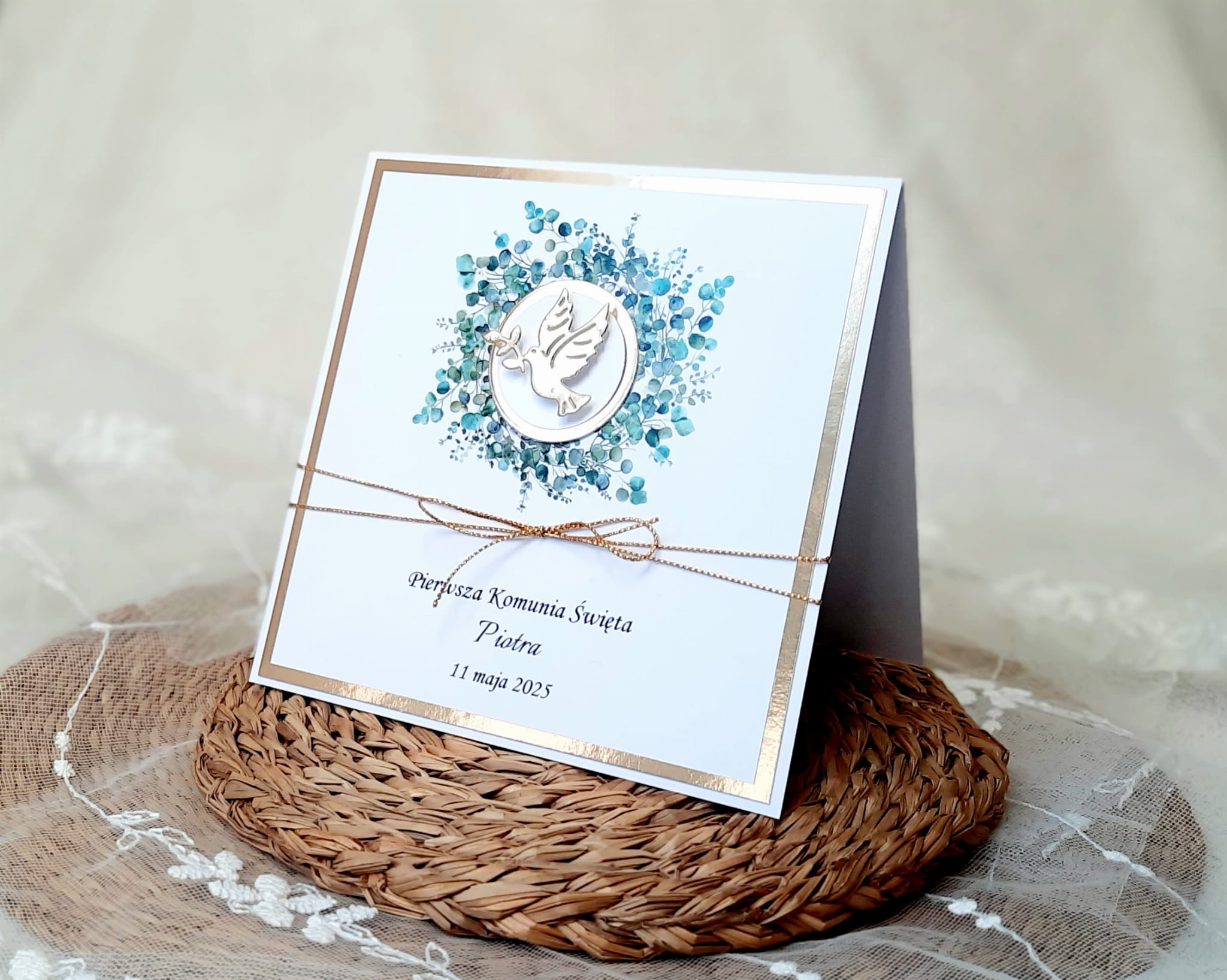 Zaproszenia na komunię z grafiką kwiatową, motywem gołąbka, sznureczkiem i papierem lustrzanym.