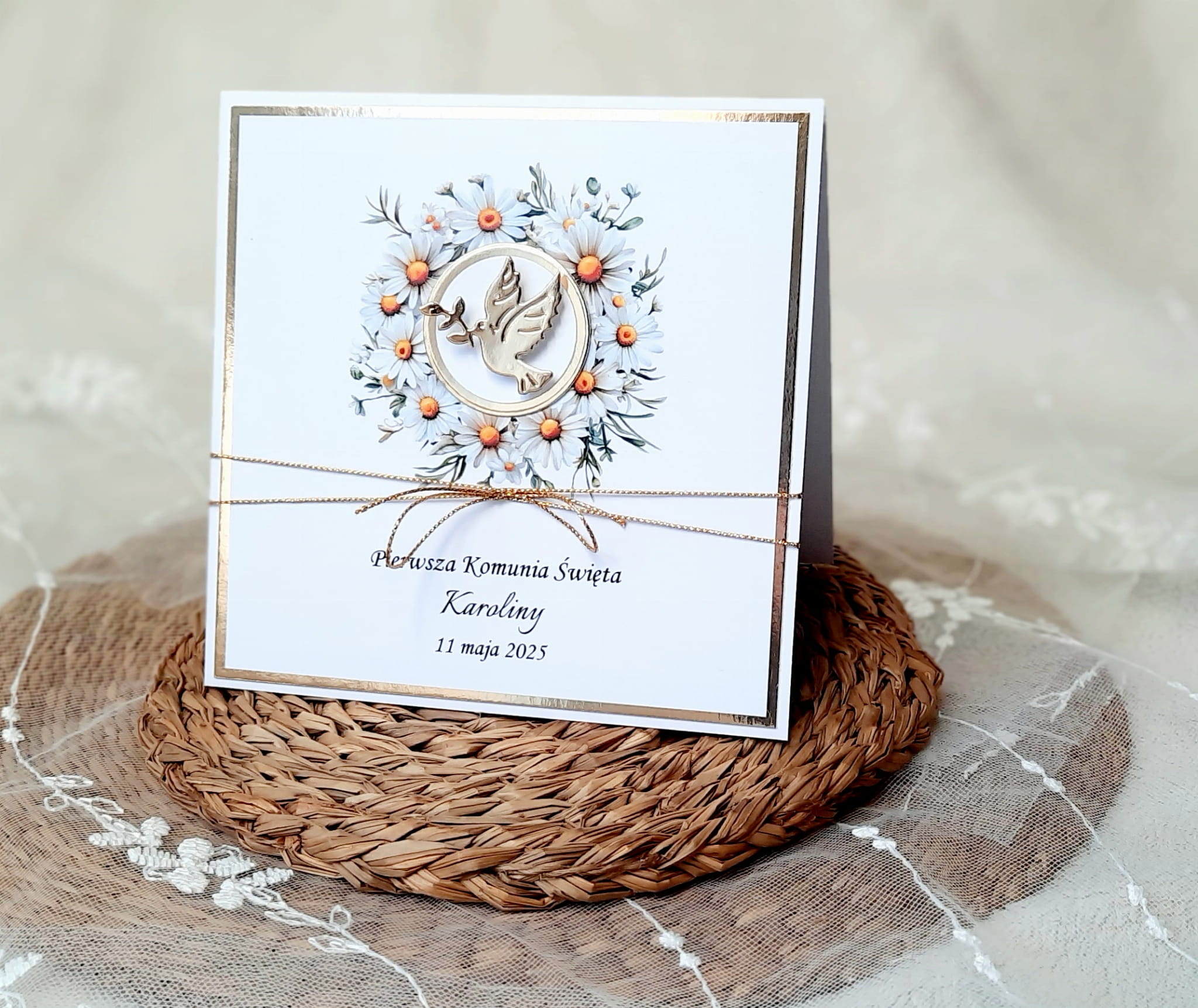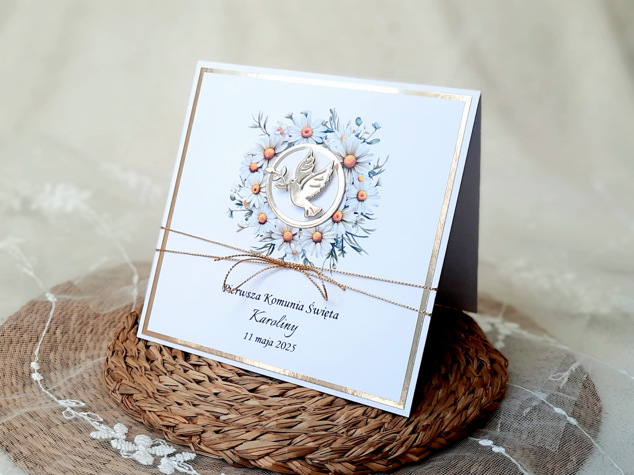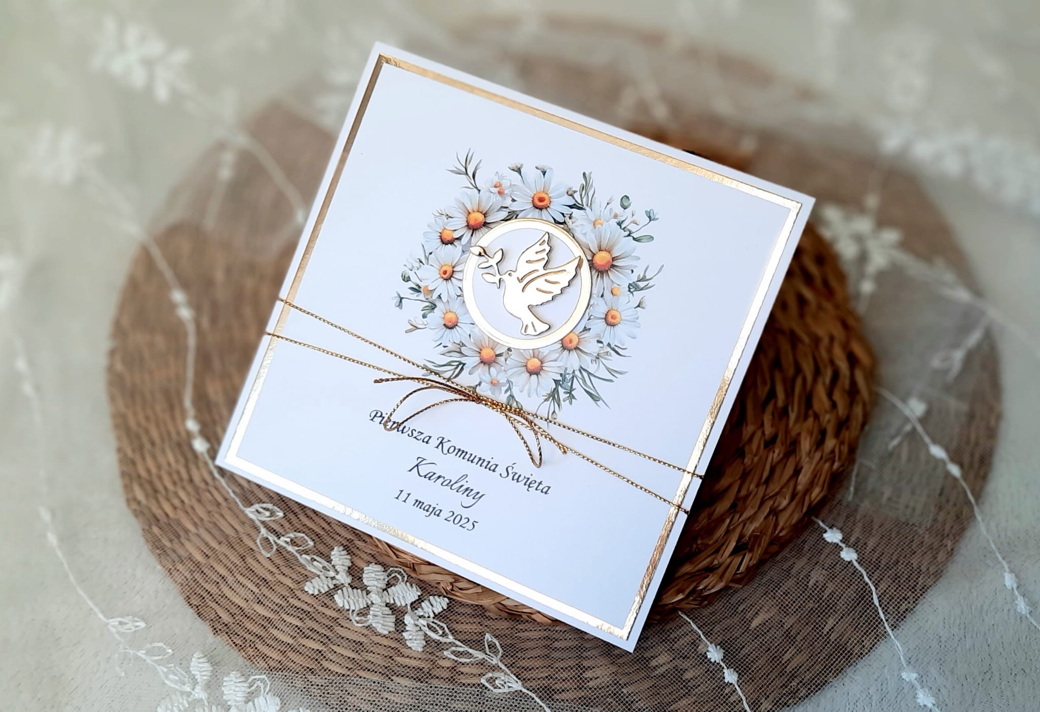 Zaproszenia na komunię z grafiką kwiatową, motywem gołąbka, sznureczkiem i papierem lustrzanym.