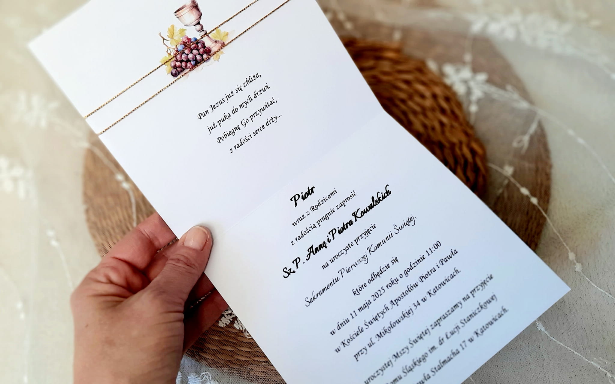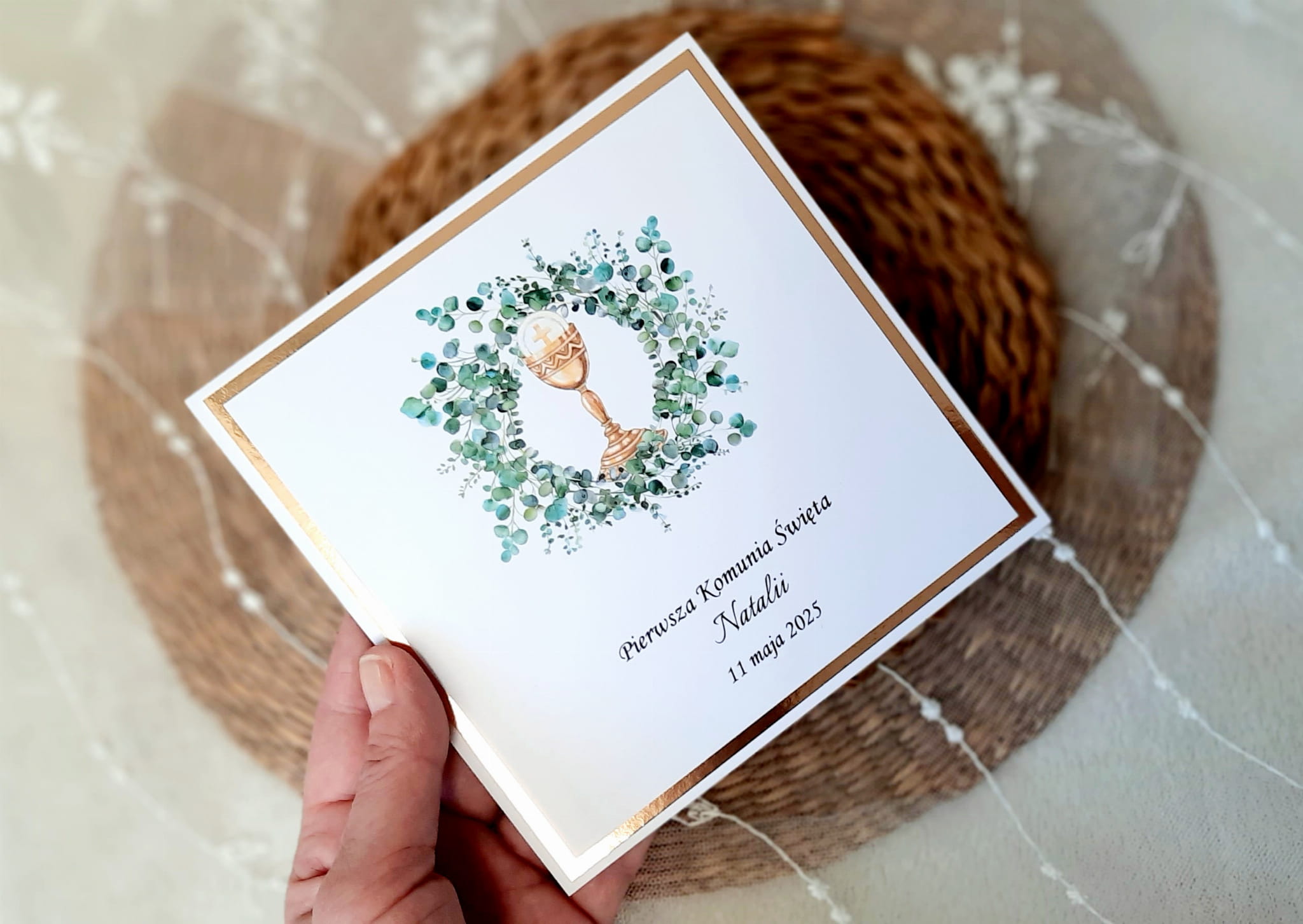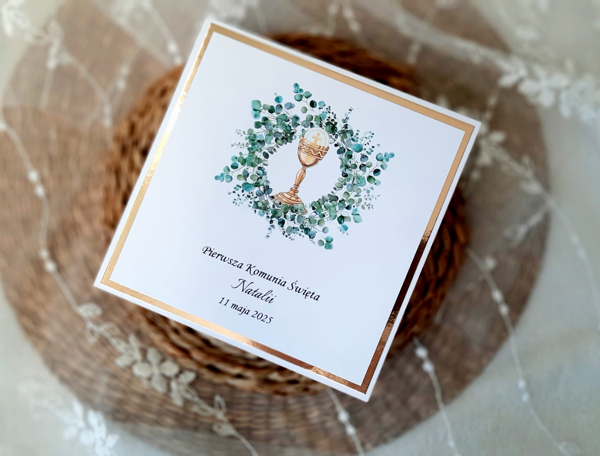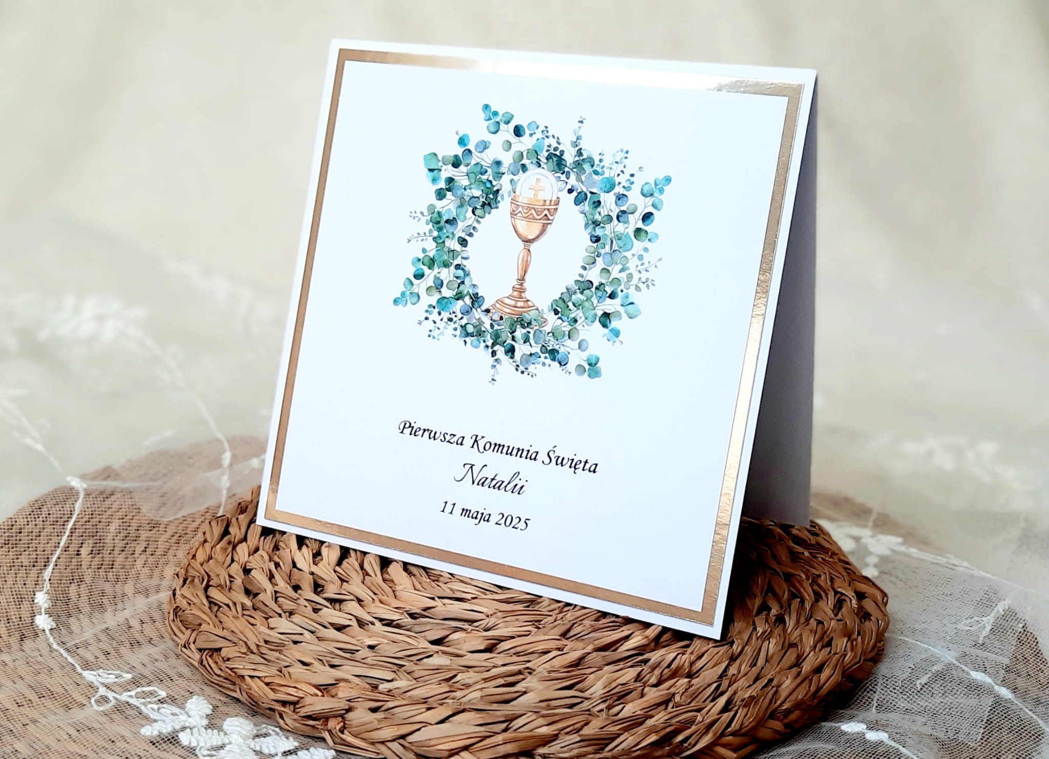 Zaproszenia na komunię z grafiką wianka oraz kielicha oraz papierem lustrzanym.