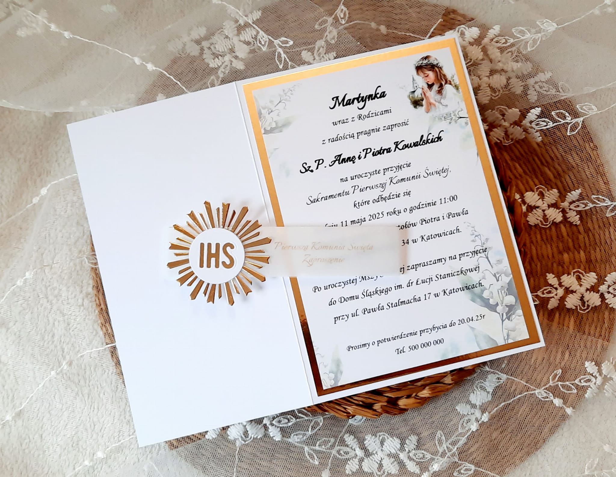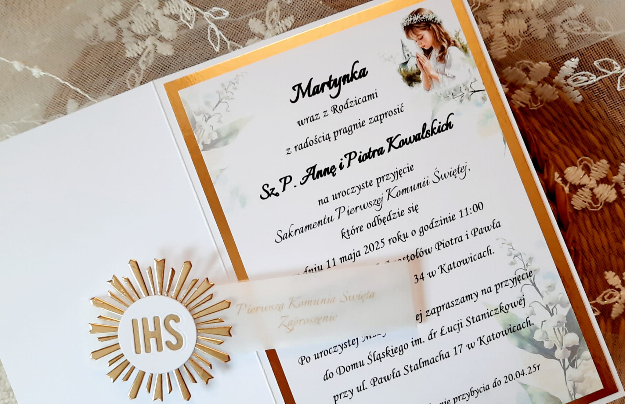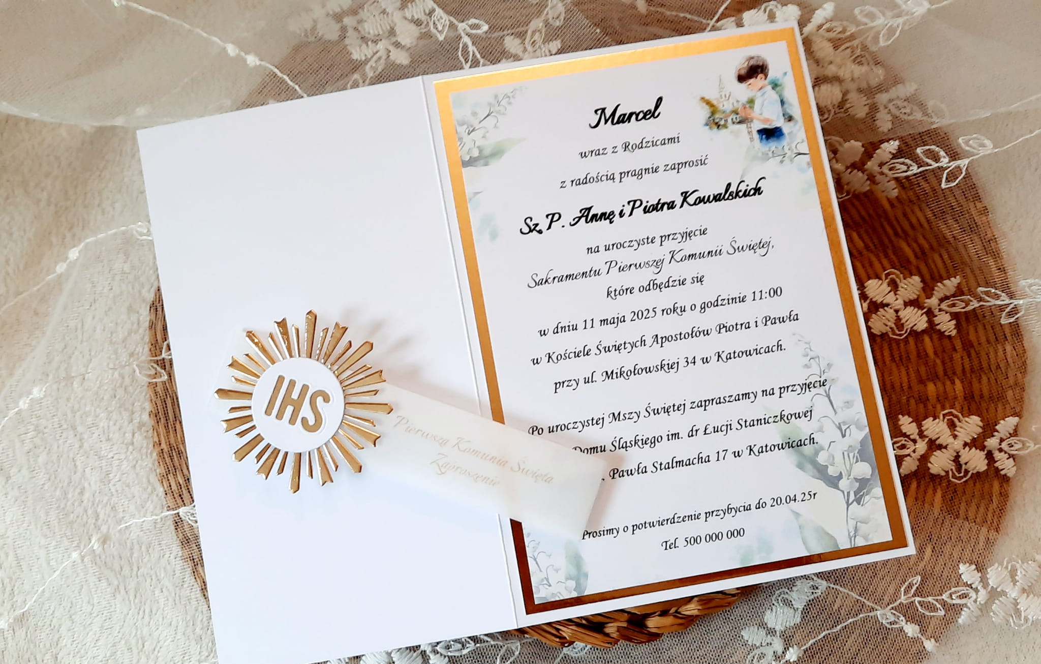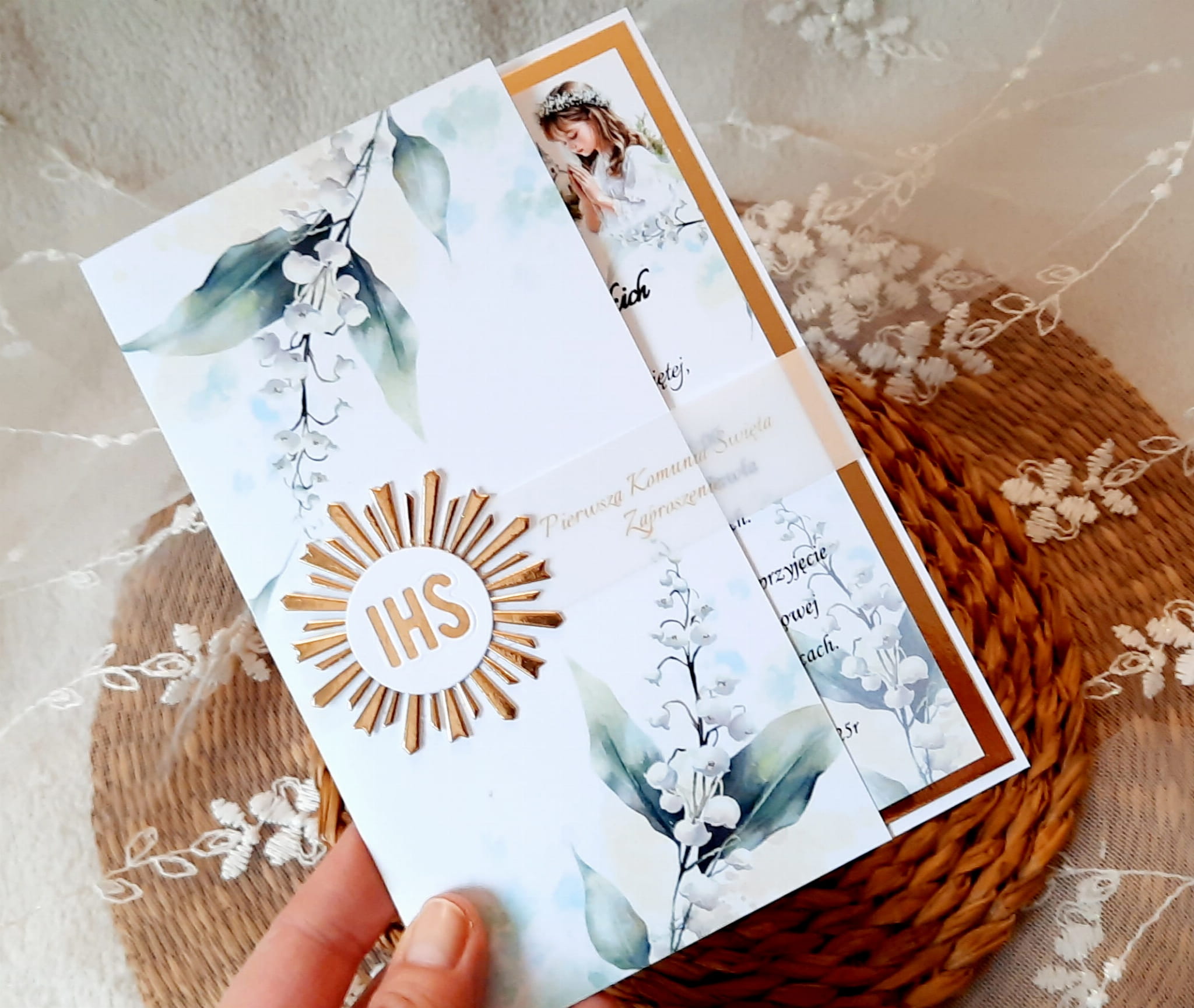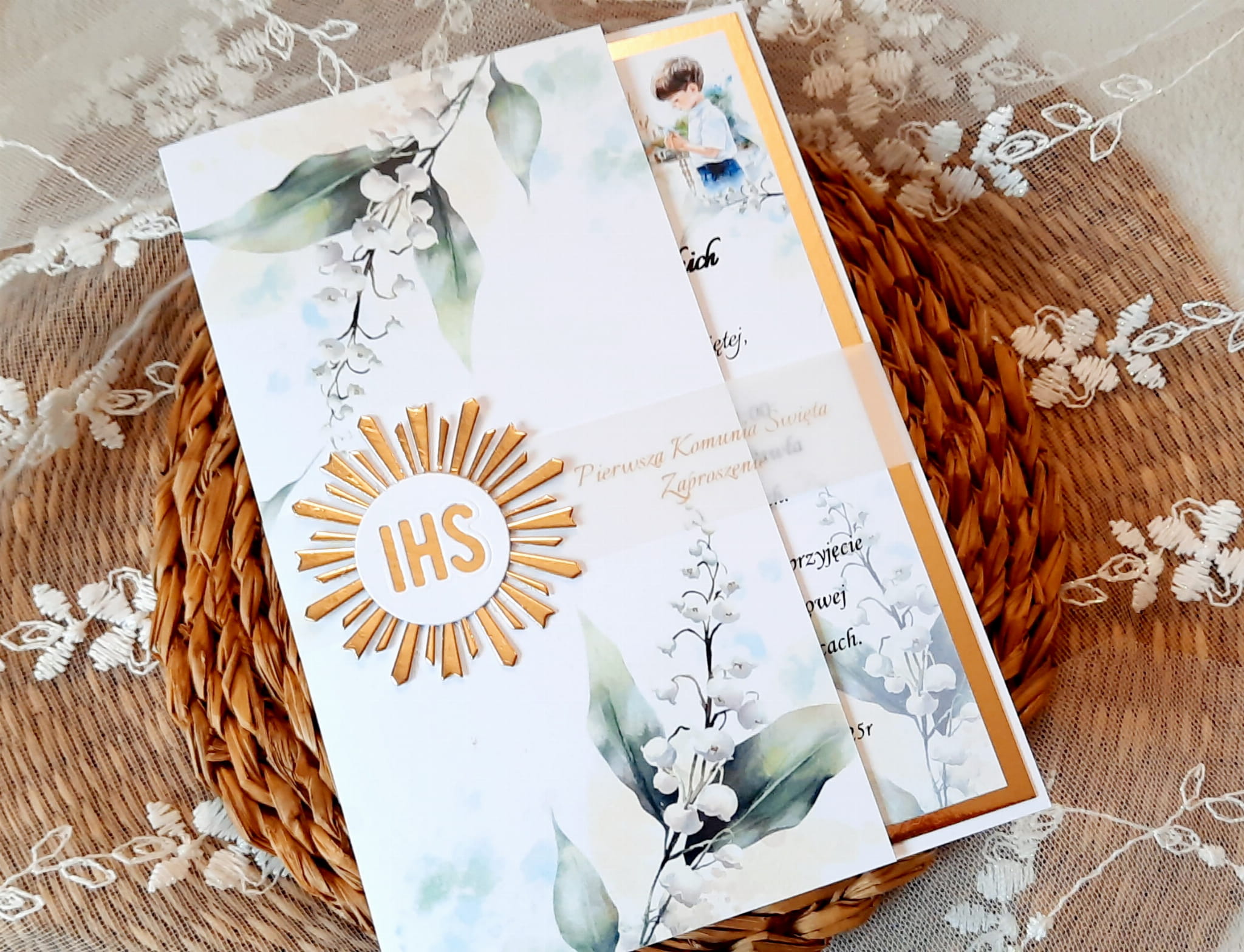 Zaproszenia na komunię z motywem konwalii - wersja dla chłopca lub dziewczynki.