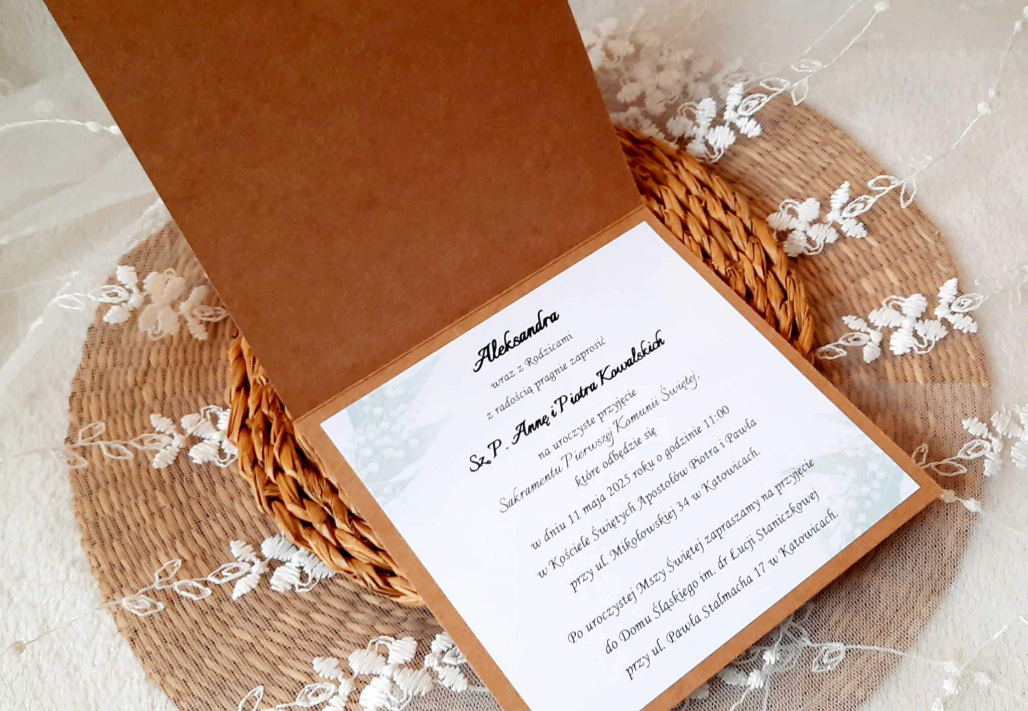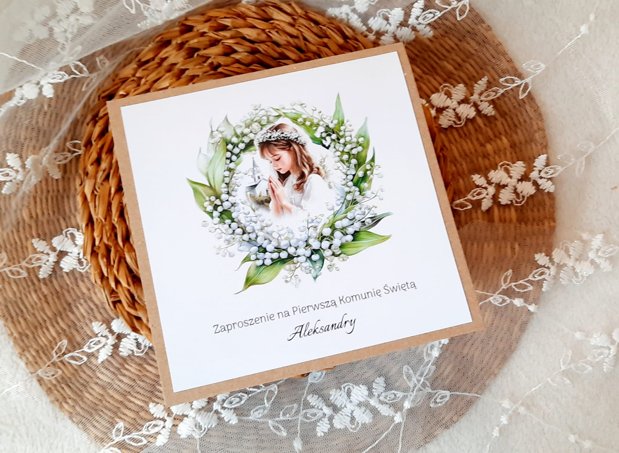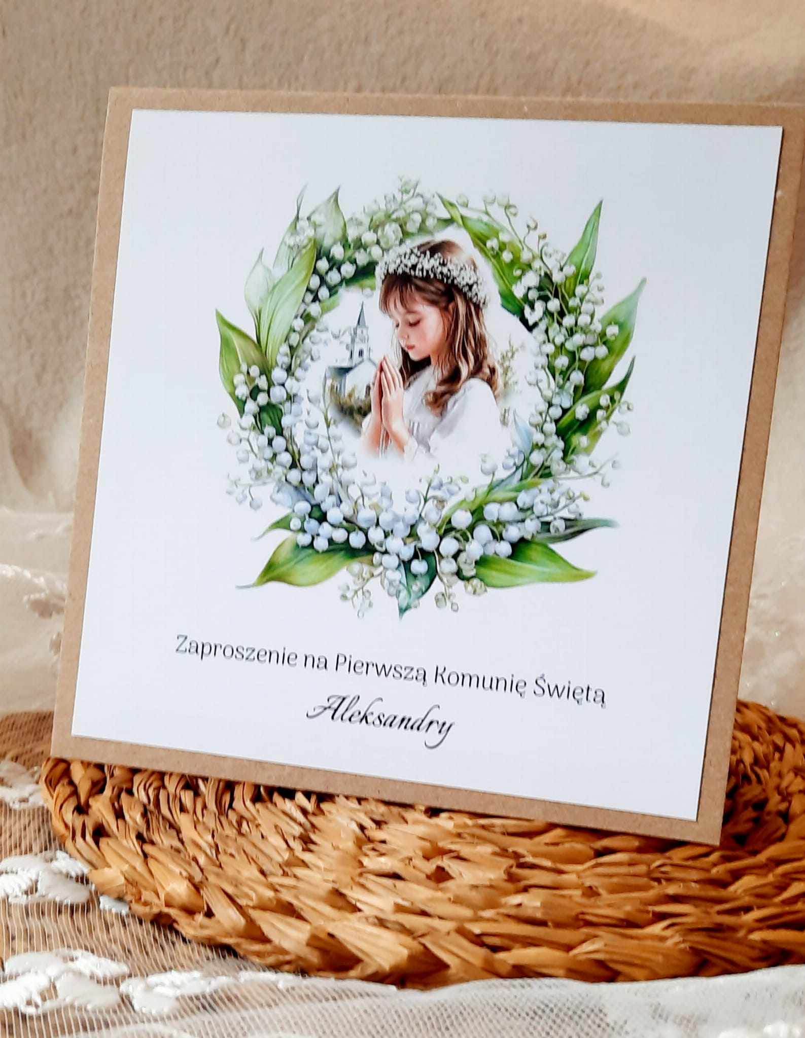 Zaproszenia na komunię z piękną grafiką wianuszka z konwalii na papierze eko.