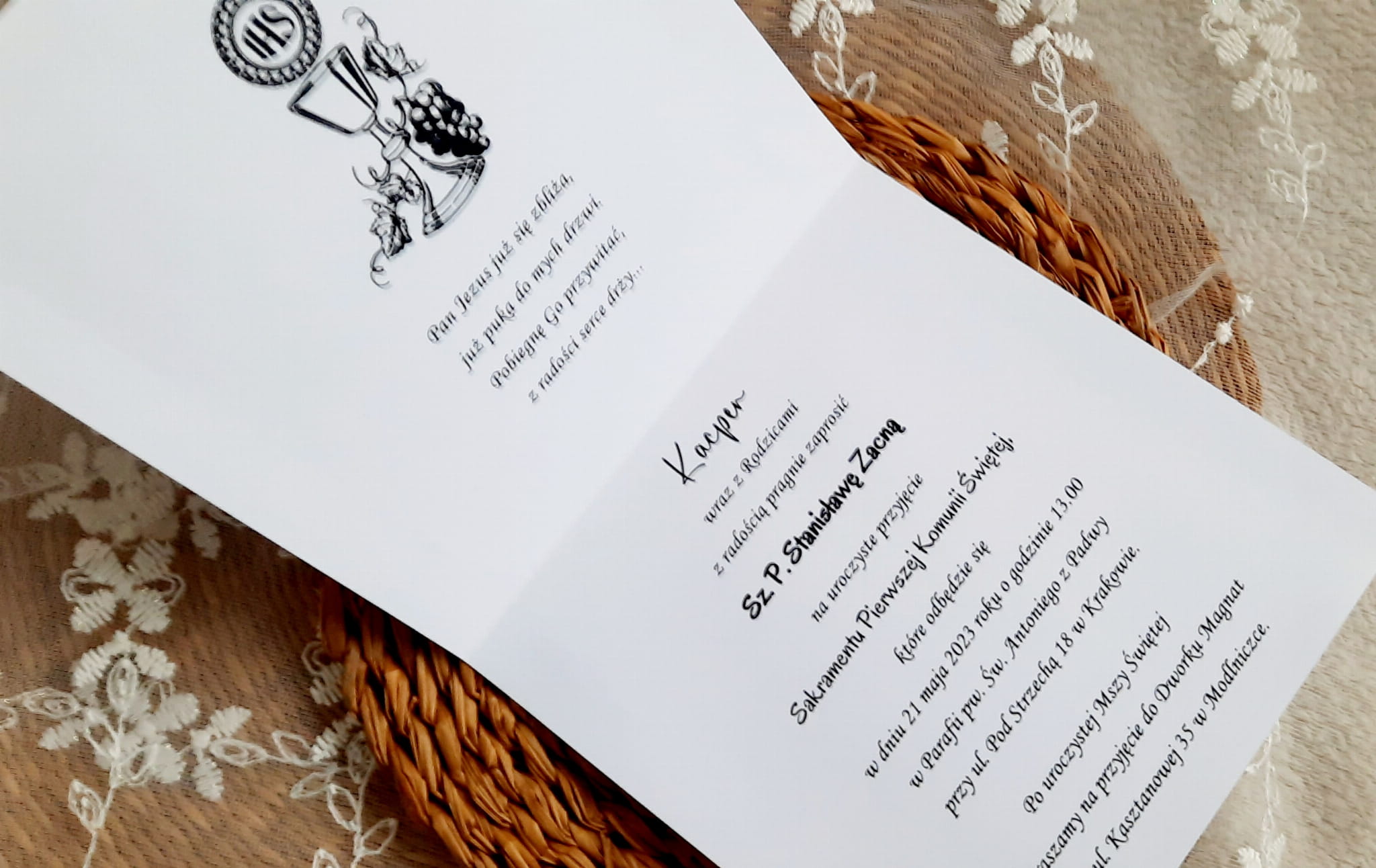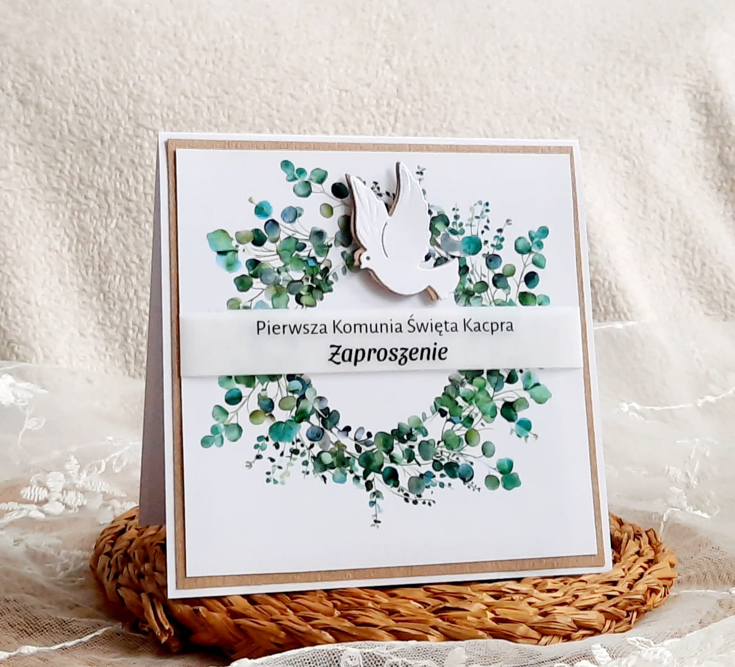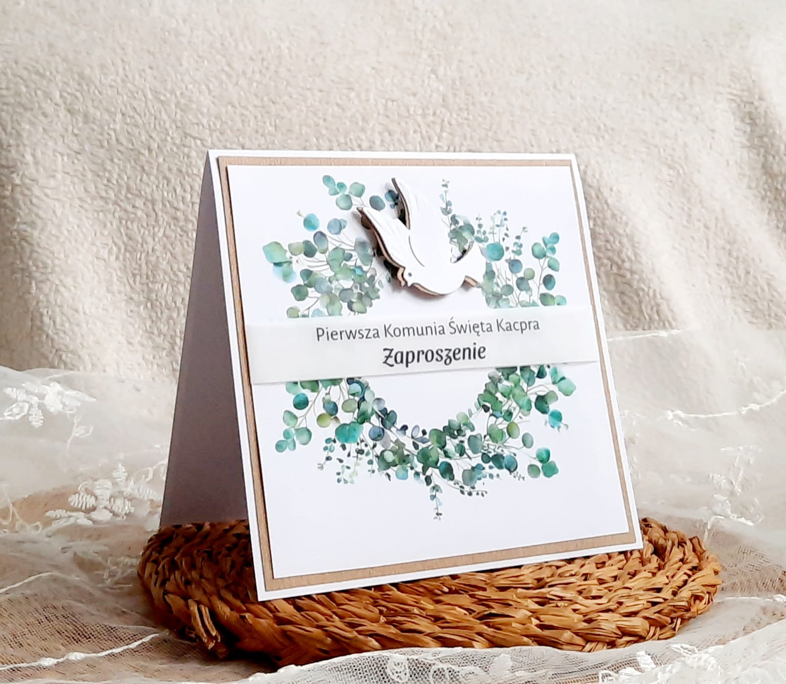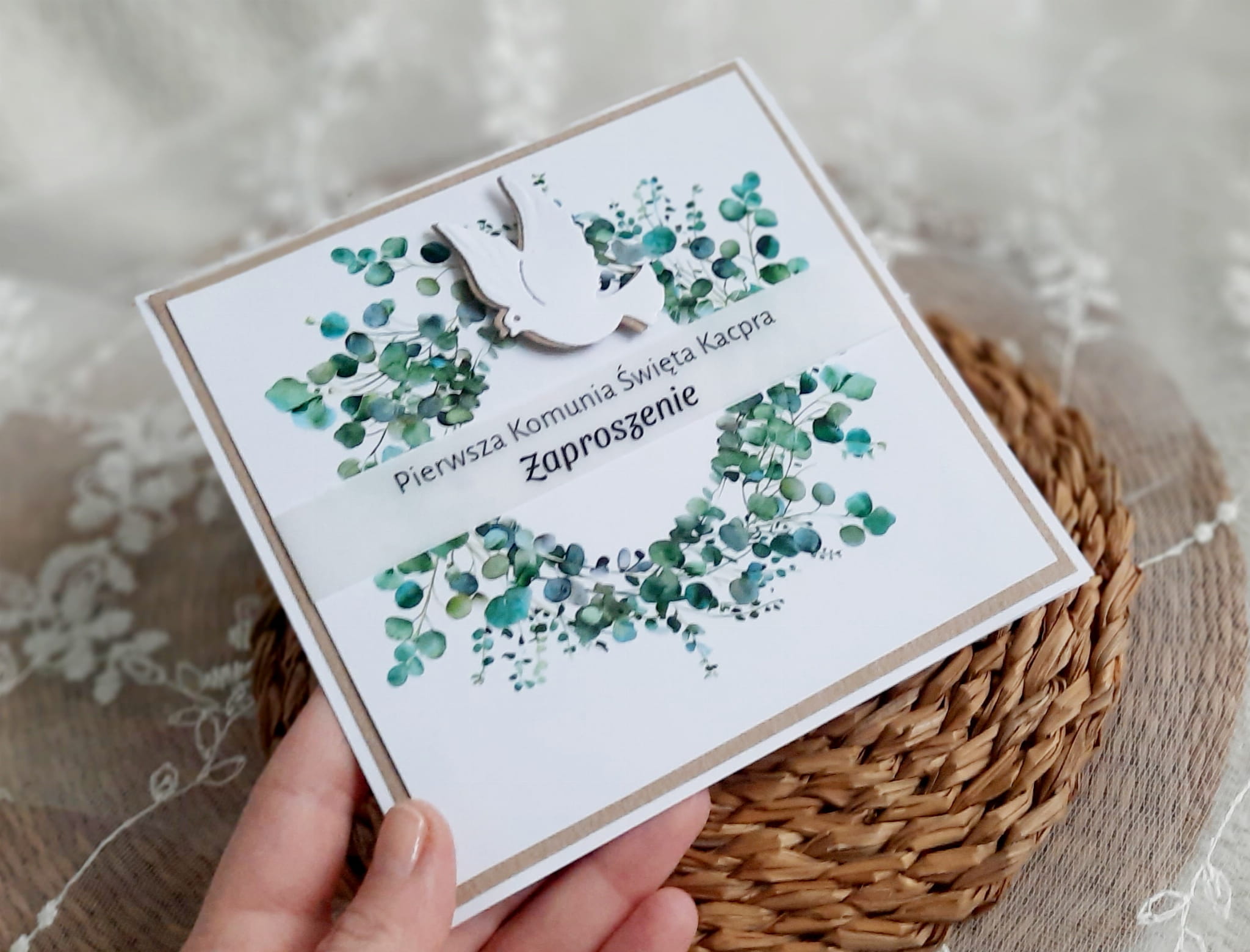 Zaproszenia na komunię z piękną grafiką kwiatową oraz papierem ekologicznym.