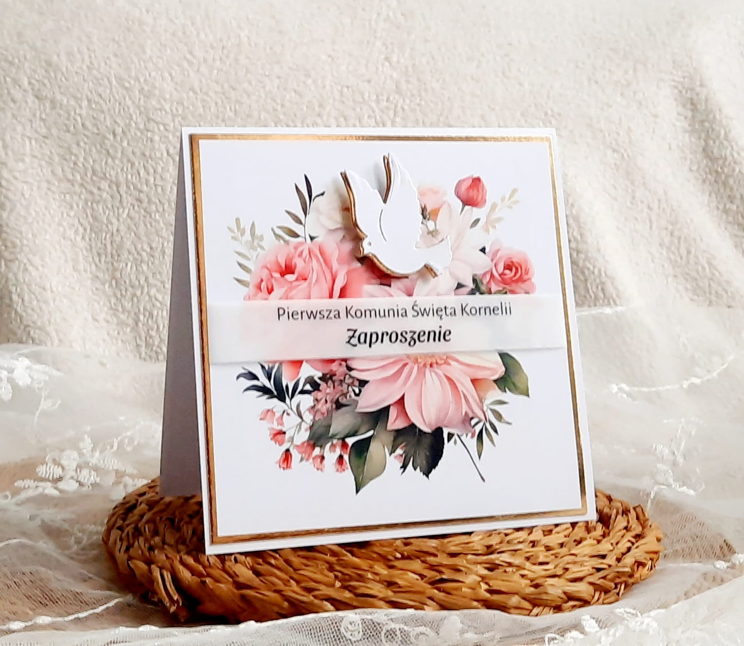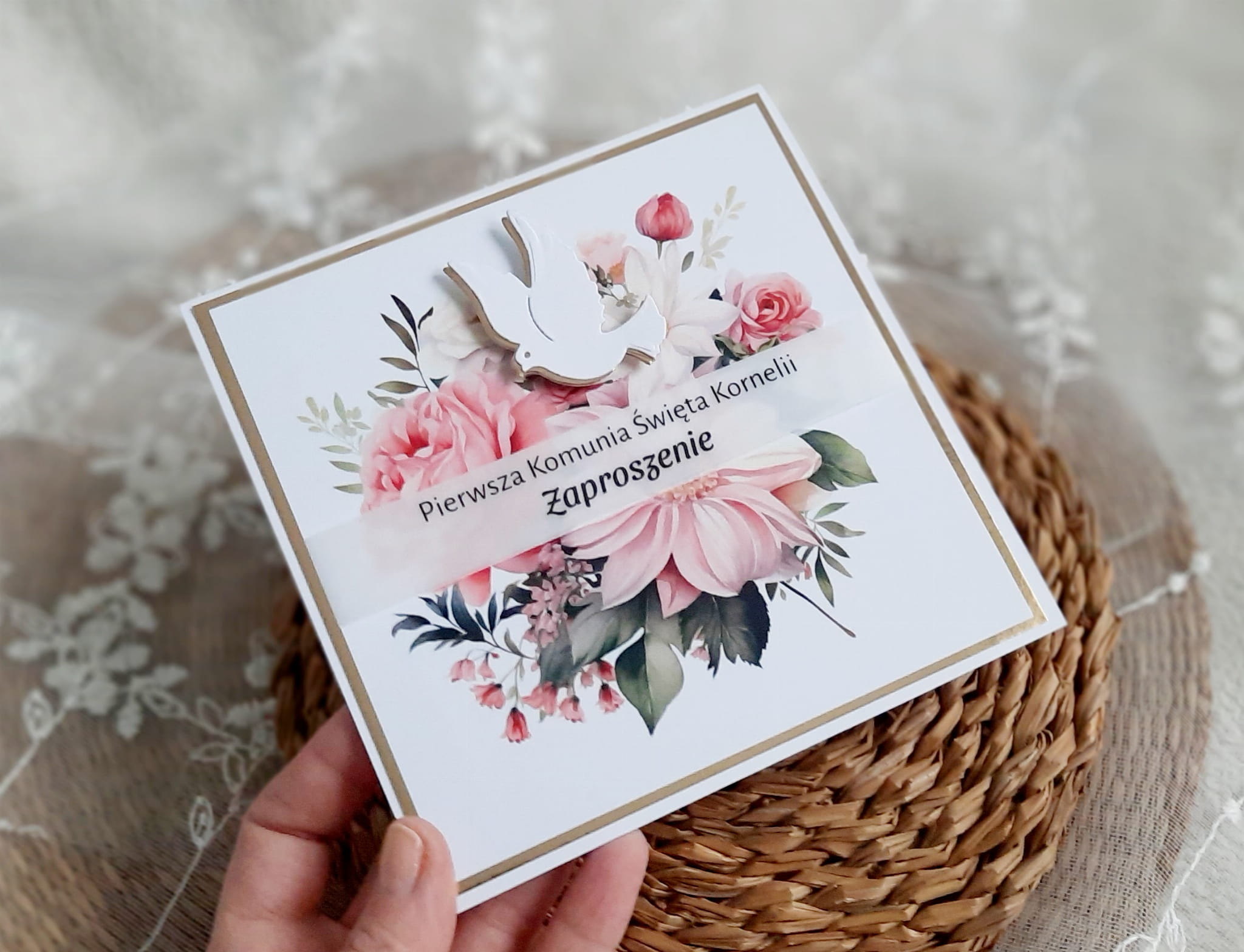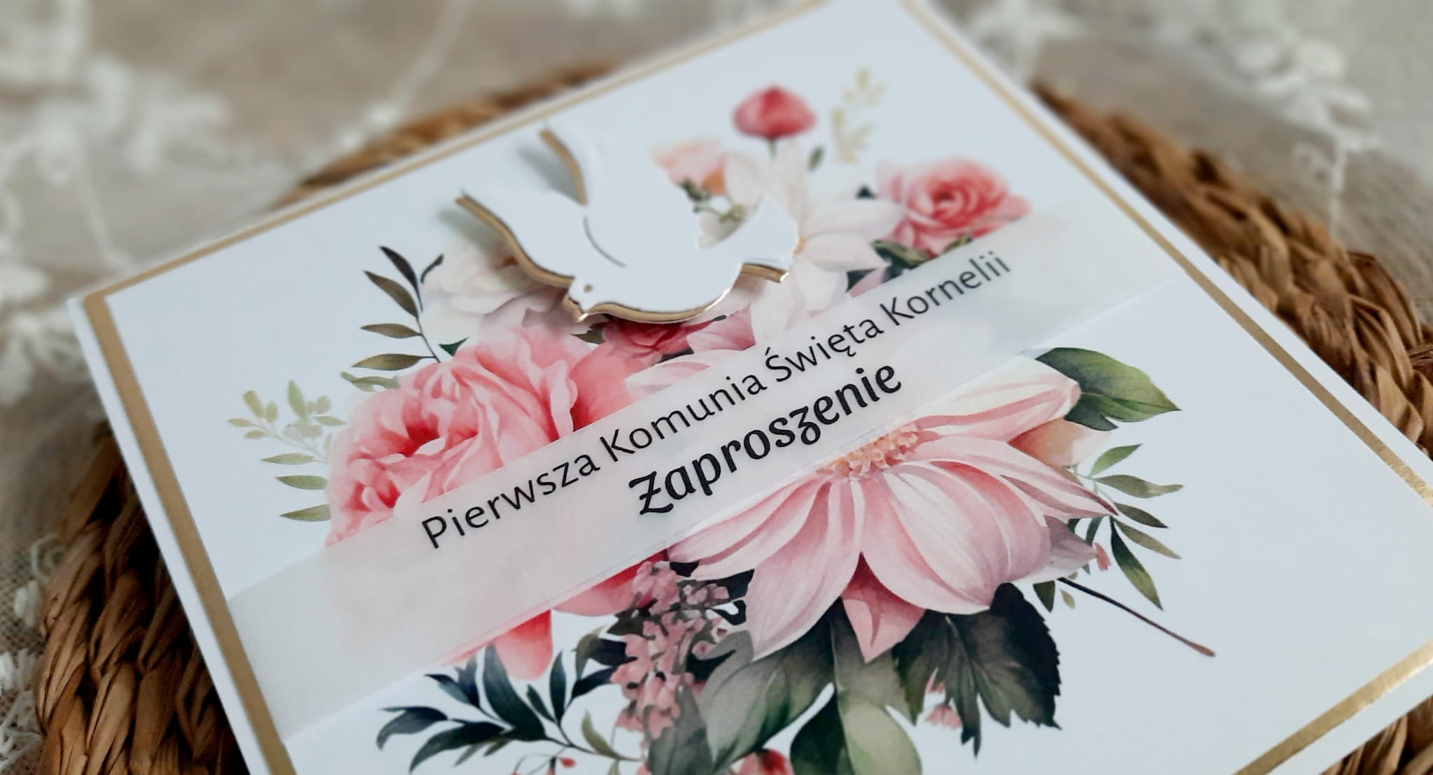 Zaproszenia na komunię z piękną grafiką kwiatową oraz papierem lustrzanym.
