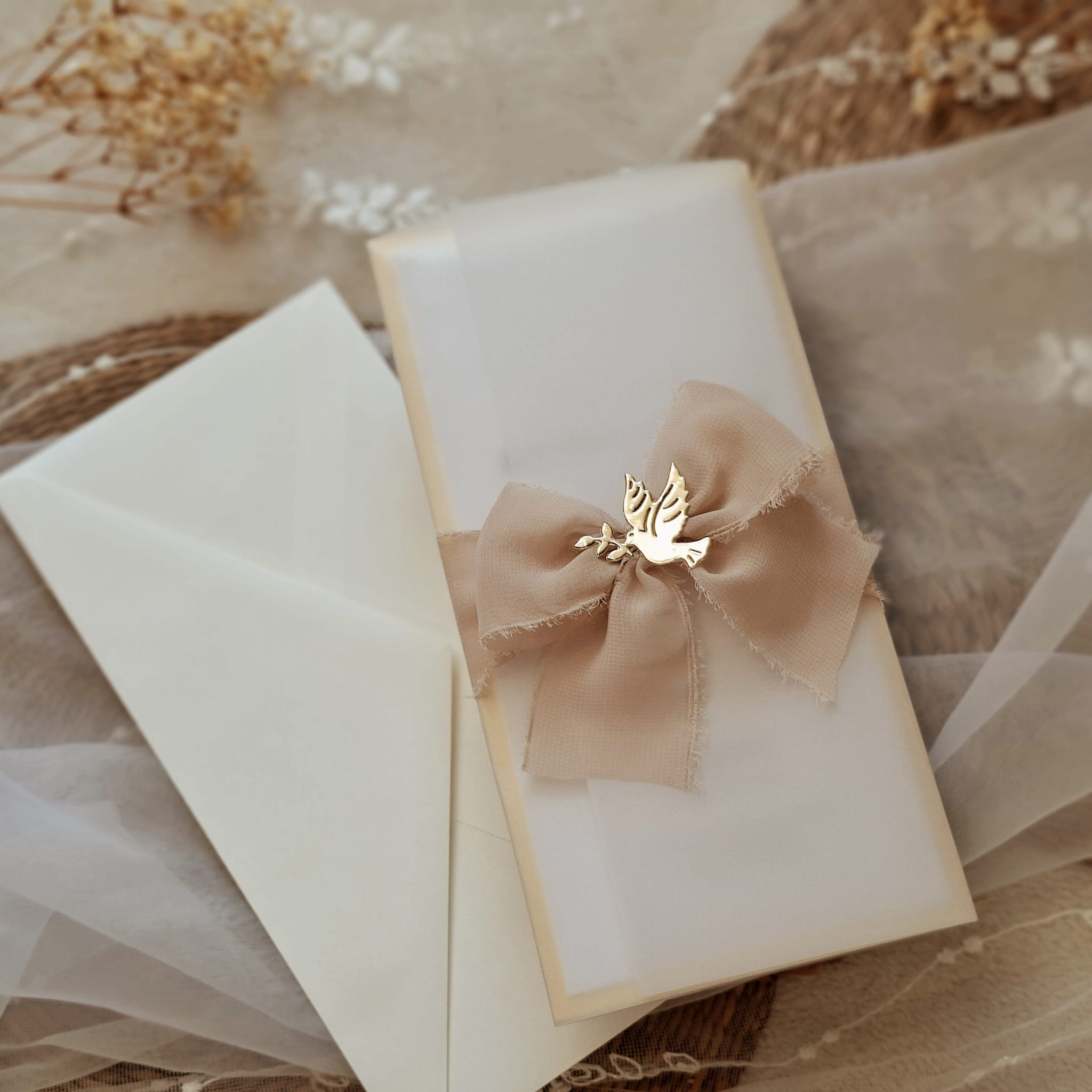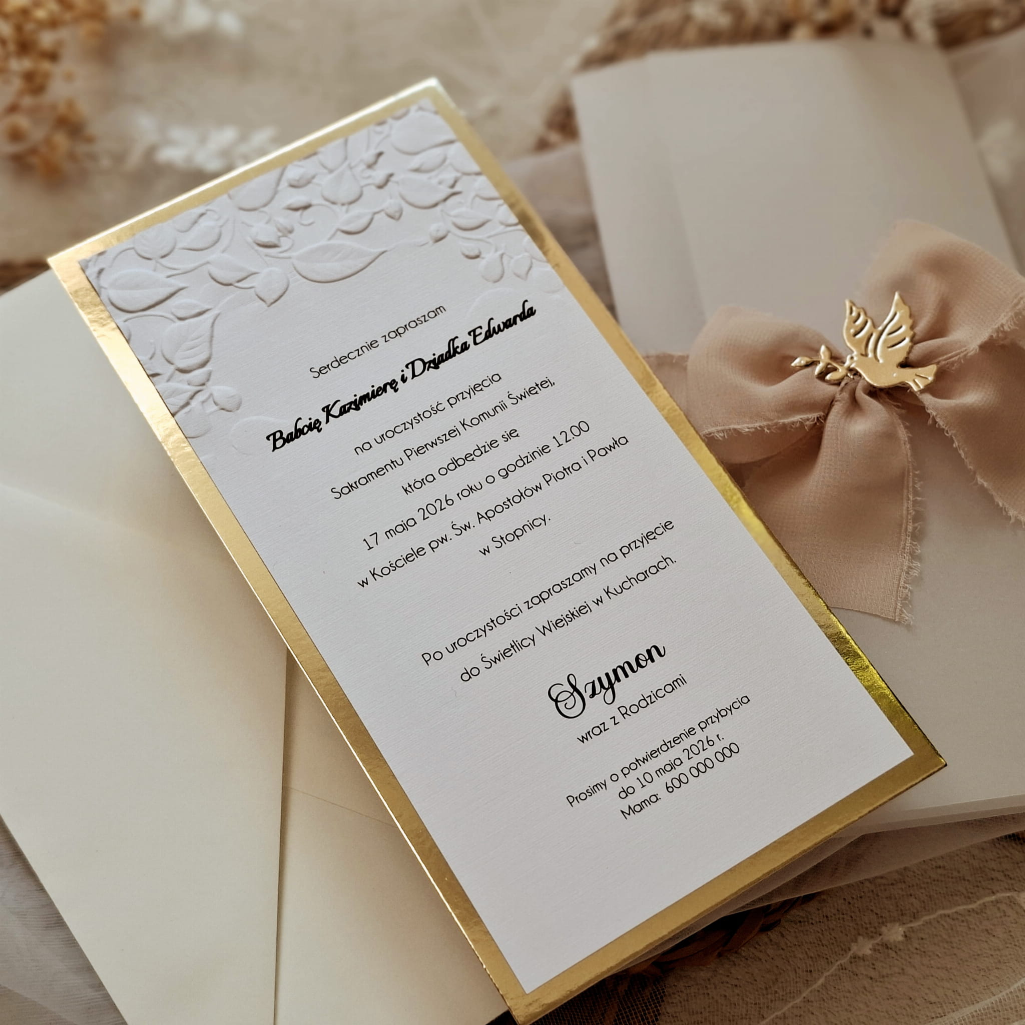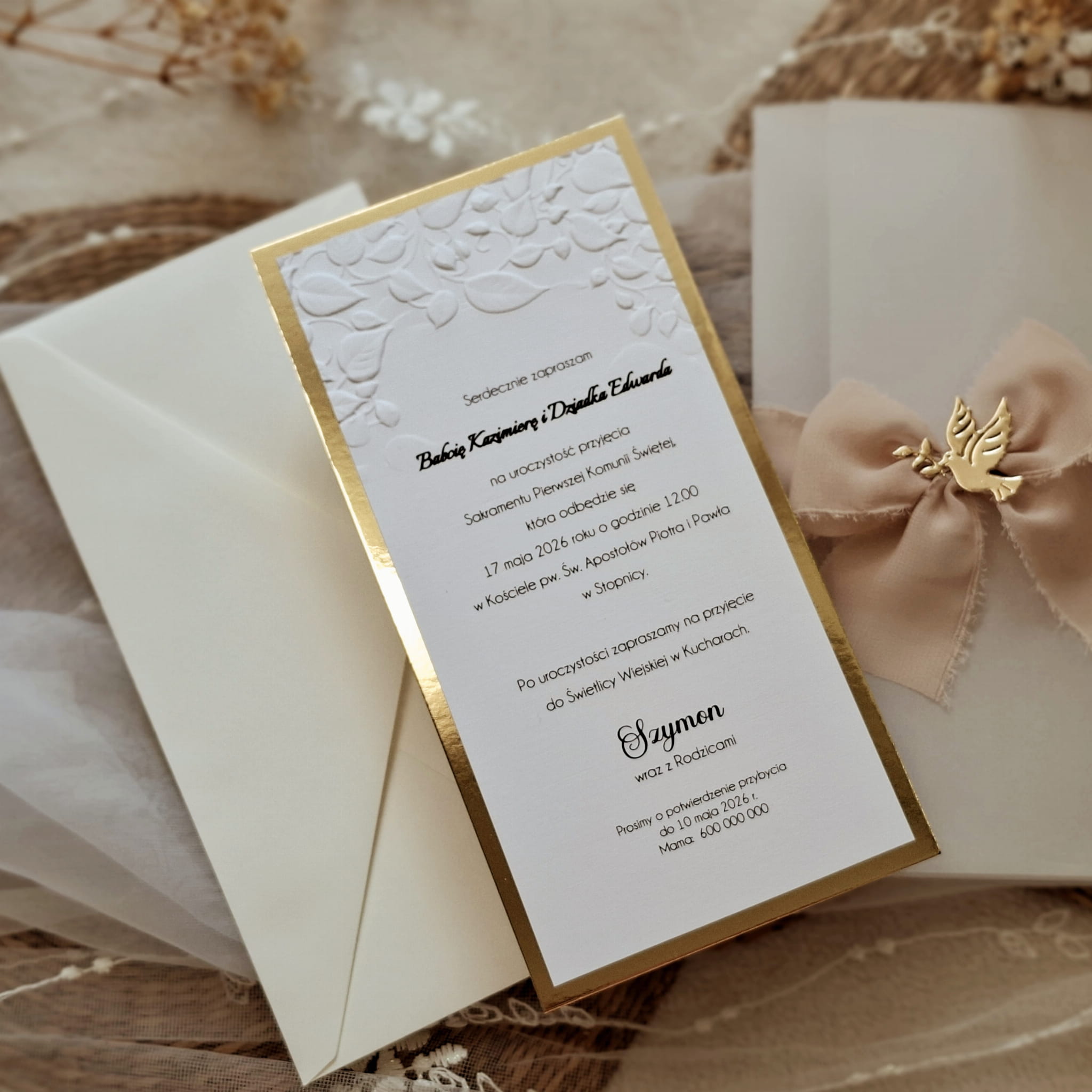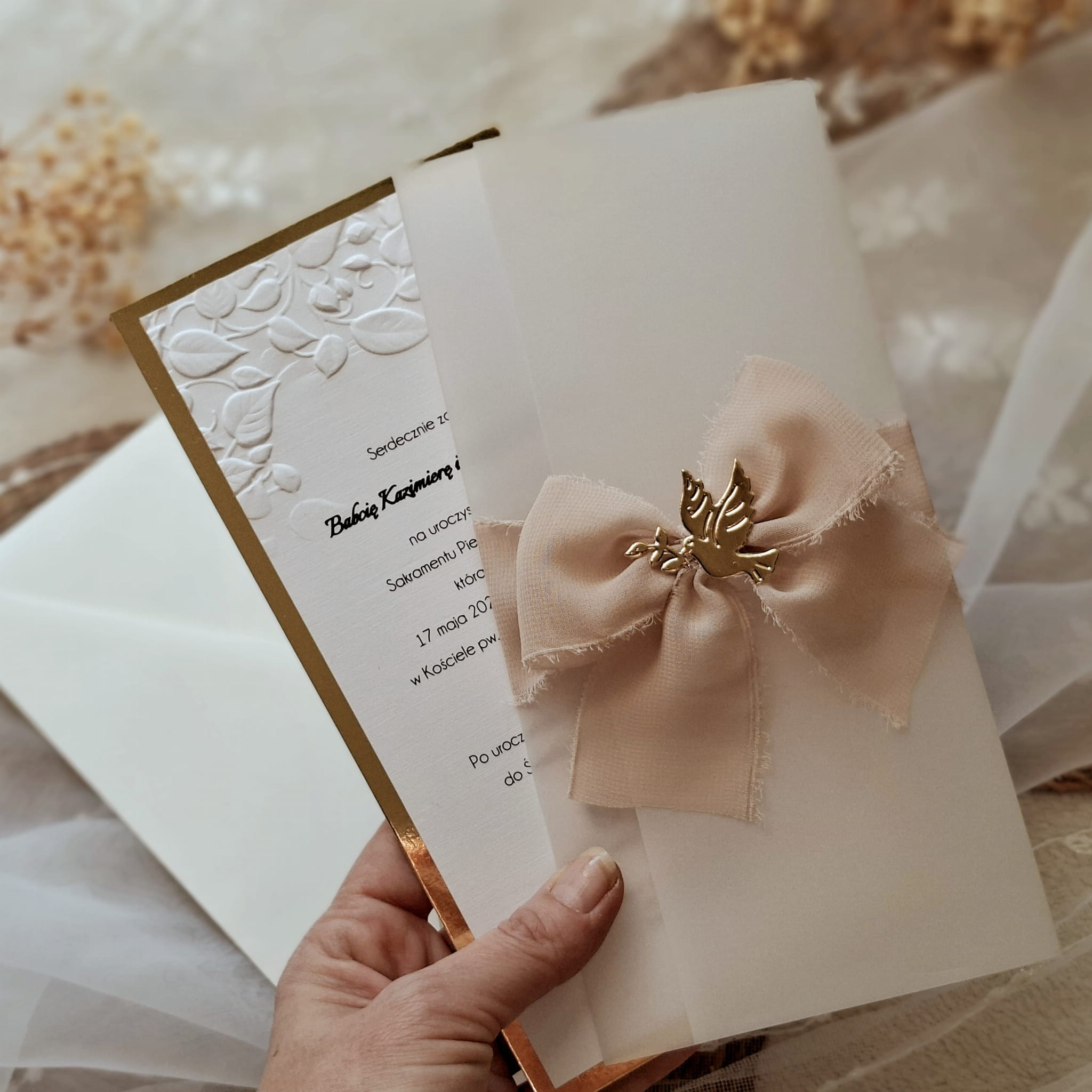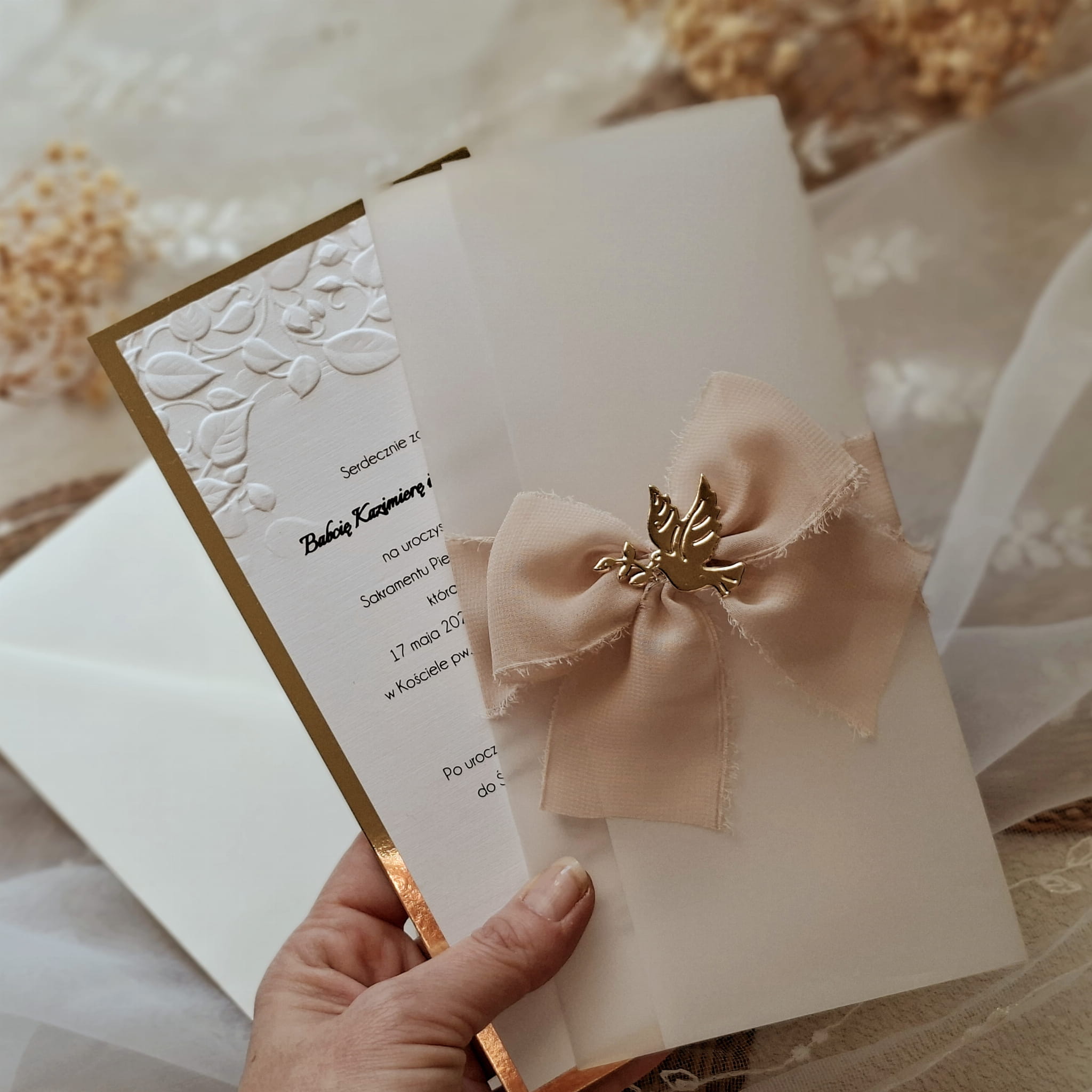 Zaproszenia na komunię z tłoczeniem, z kalką, wstążeczką jedwabną oraz podkładem z papieru lustrzanego.