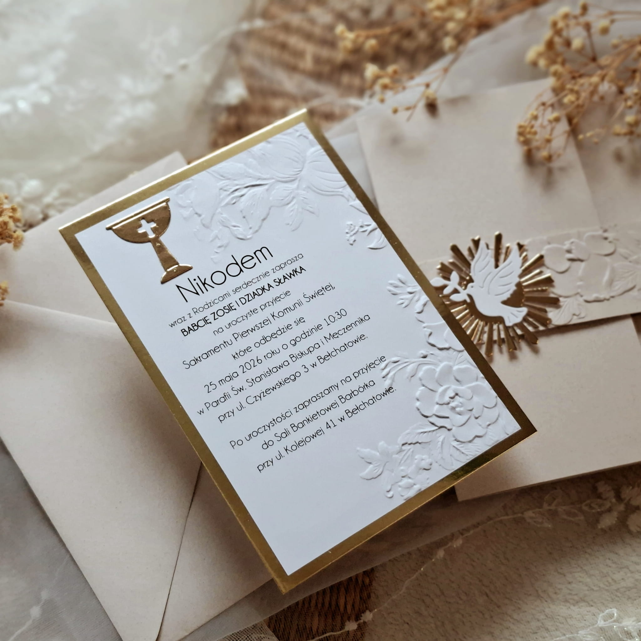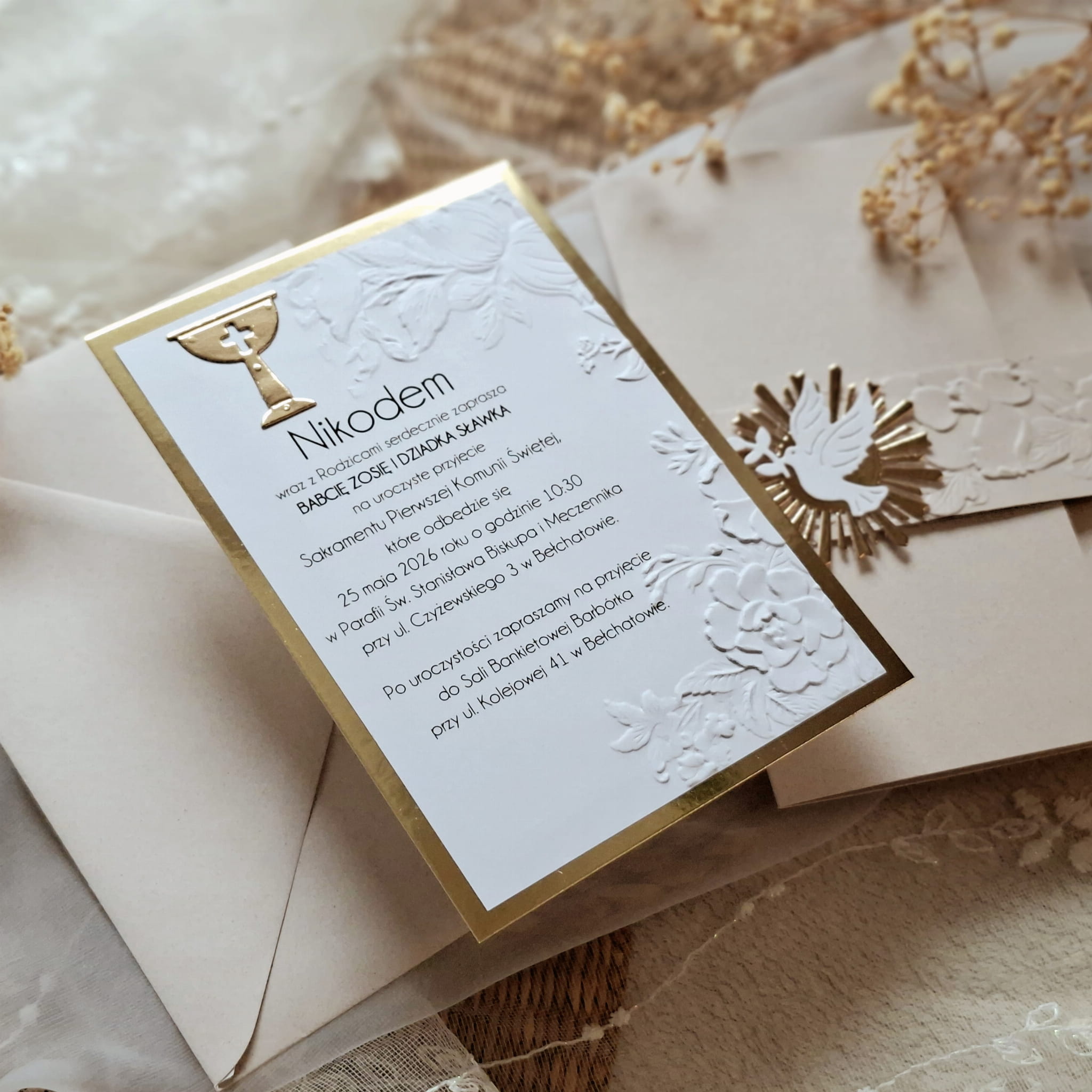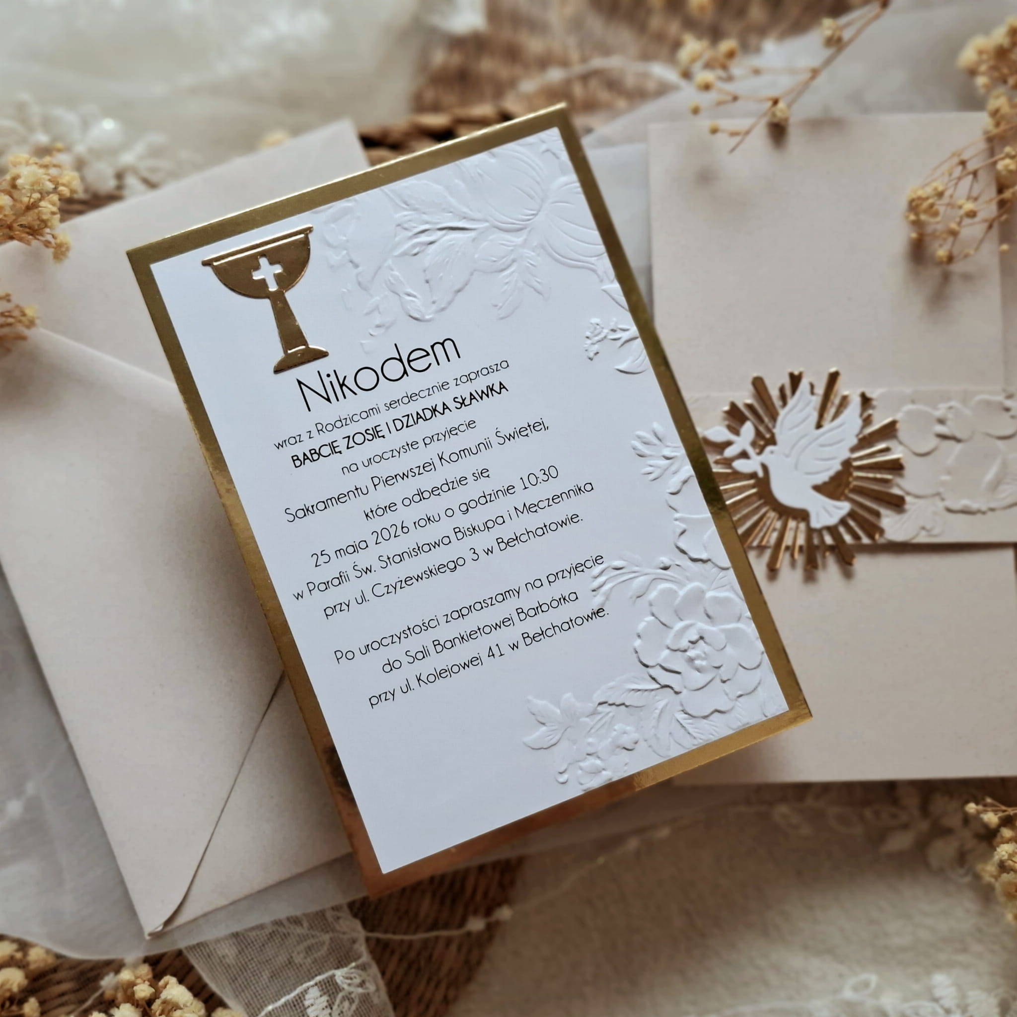 Eleganckie zaproszenia na komunię z tłoczeniem, papierem lustrzanym w kolorze złotym lub srebrnym oraz motywem religijnym.