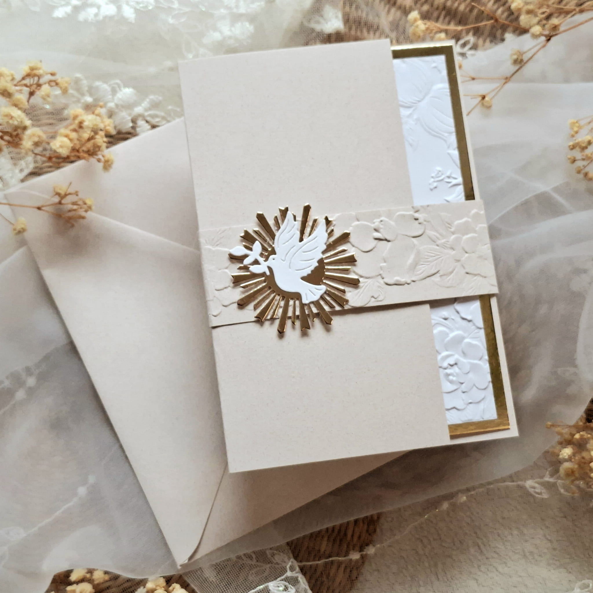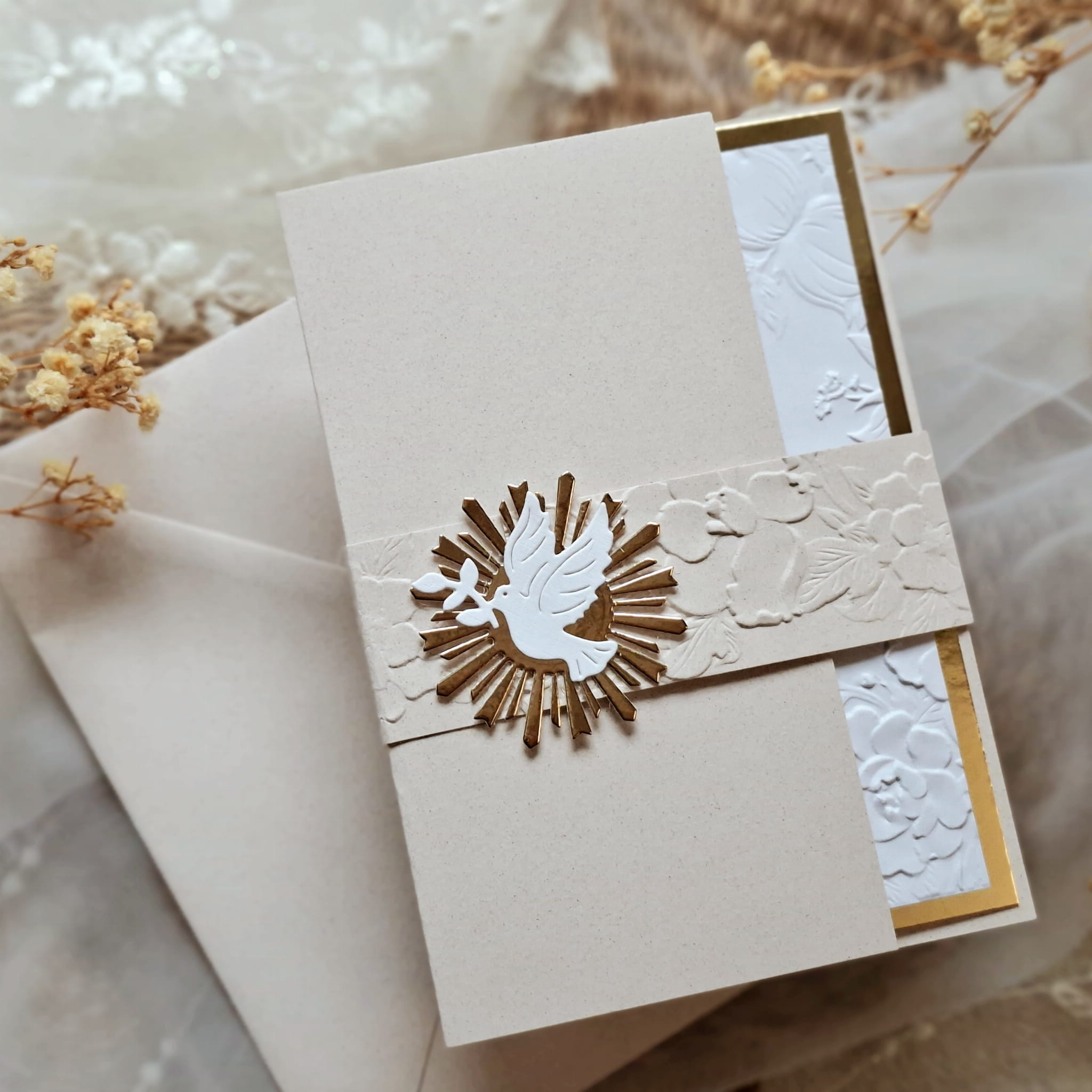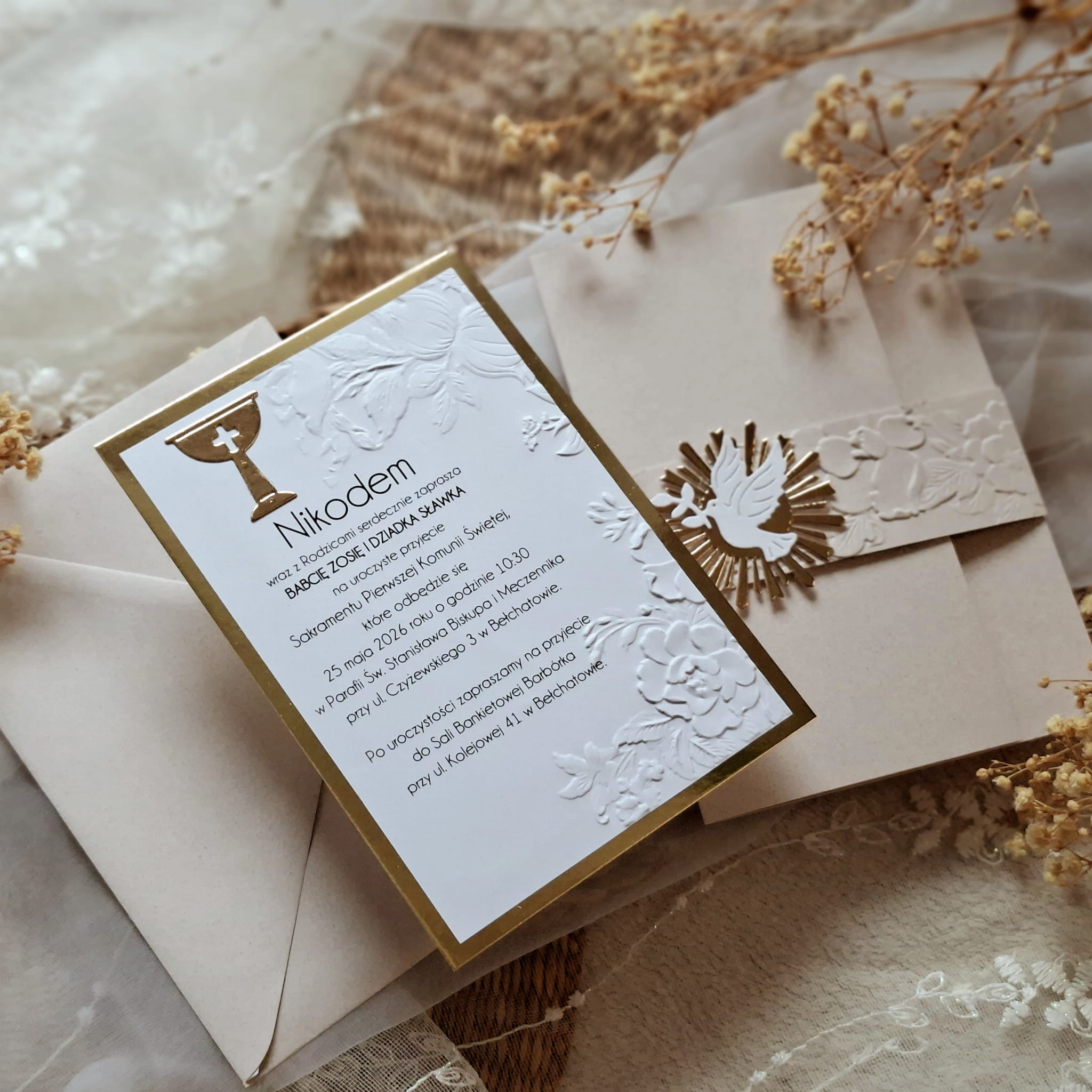 Eleganckie zaproszenia na komunię z tłoczeniem, papierem lustrzanym w kolorze złotym lub srebrnym oraz motywem religijnym.
