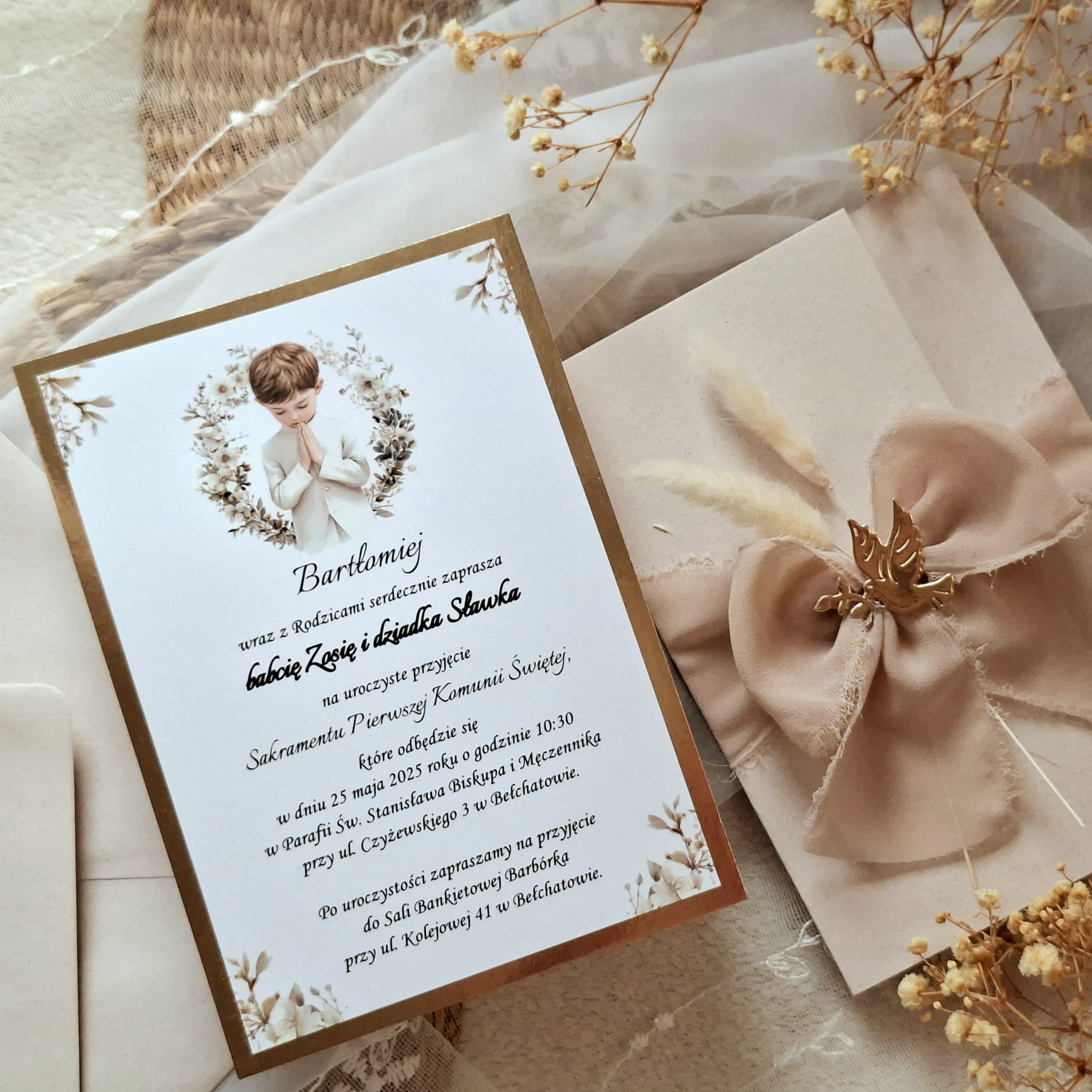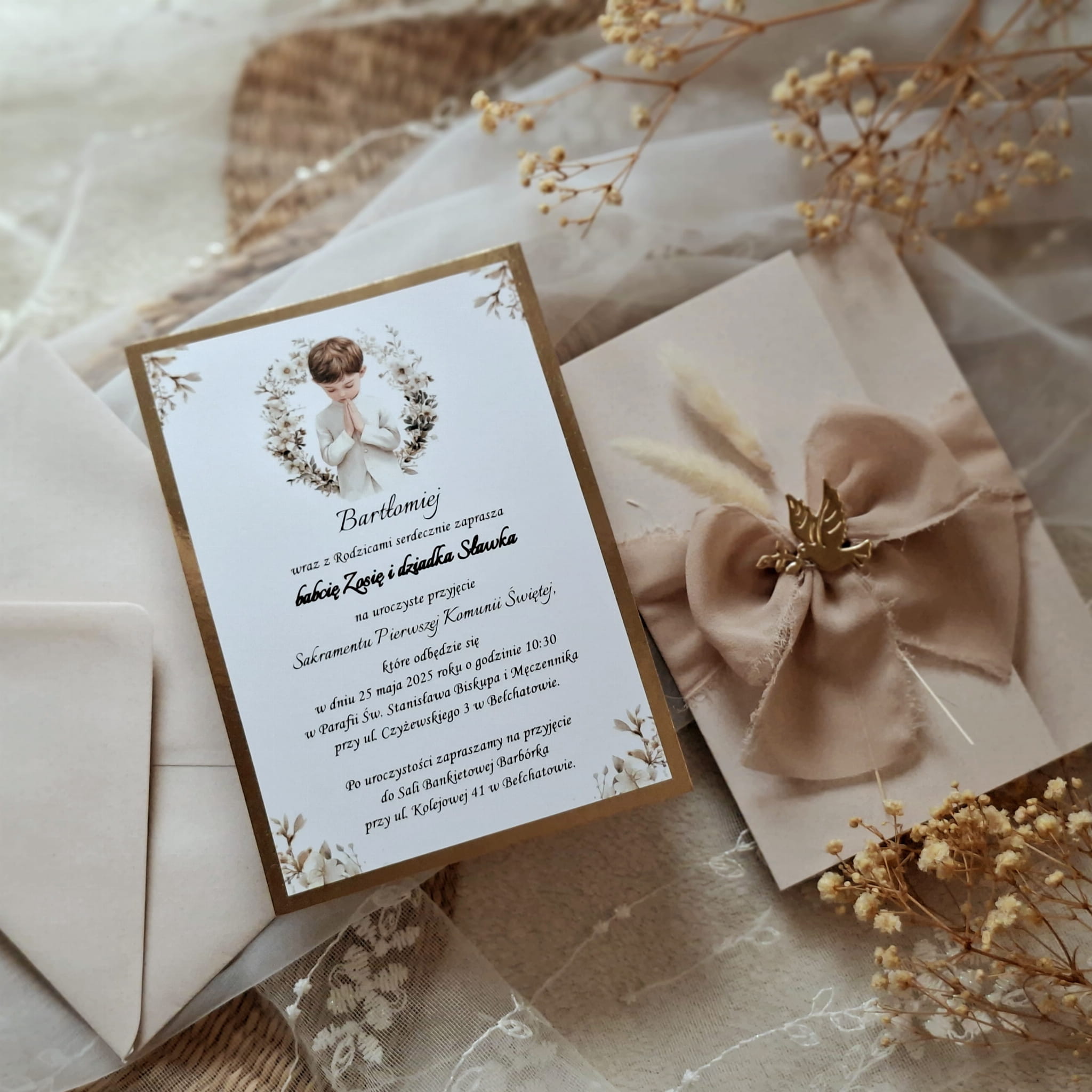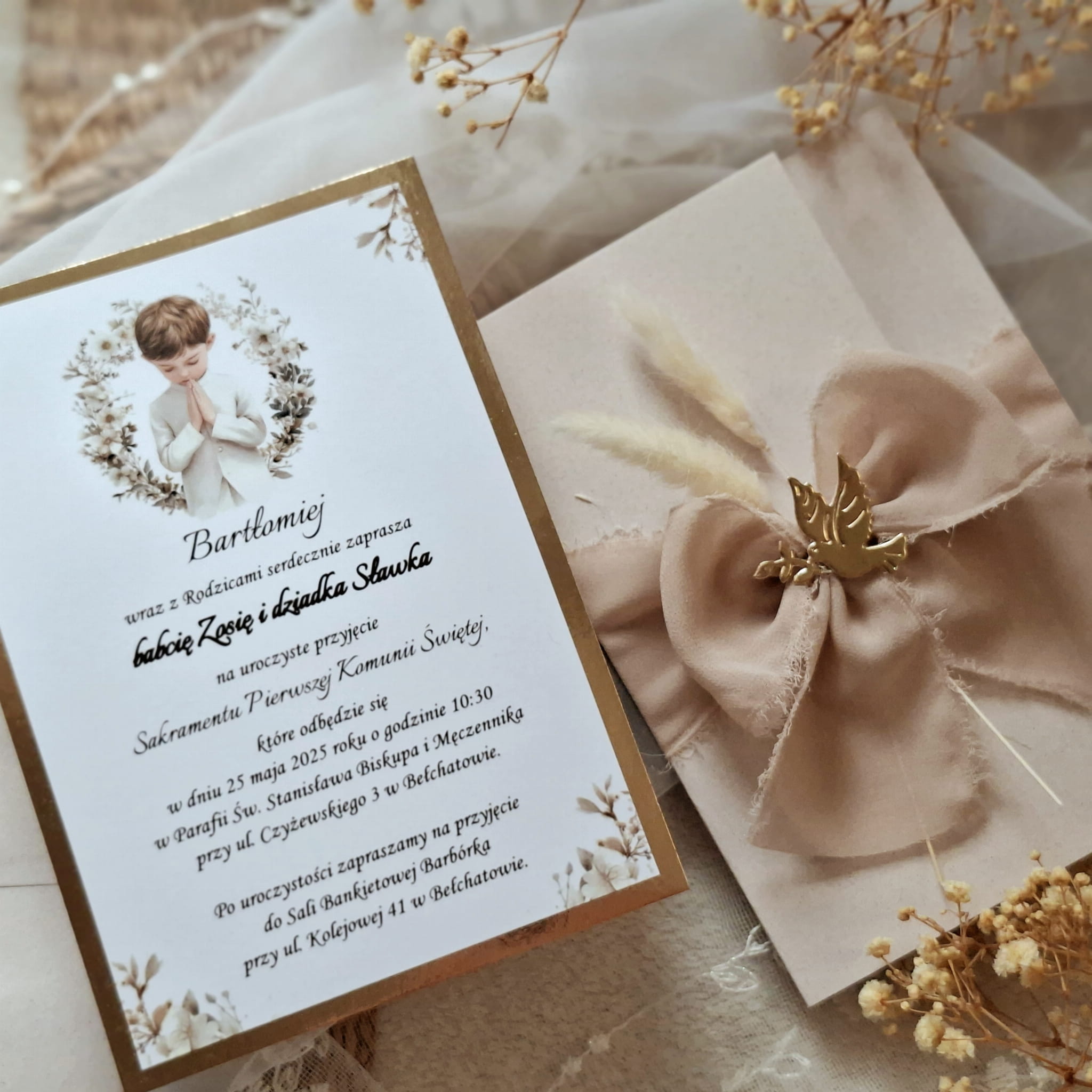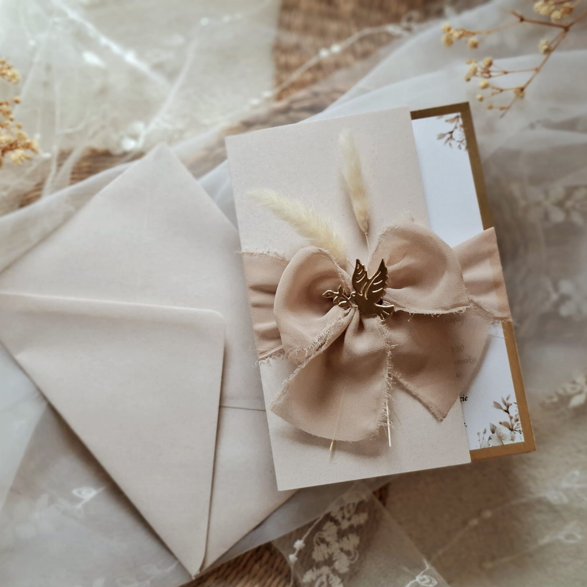 Eleganckie zaproszenia na komunię w okładce z kolorowego papieru, przewiązane wstążką szyfonową, z suszkami i motywem gołąbka.