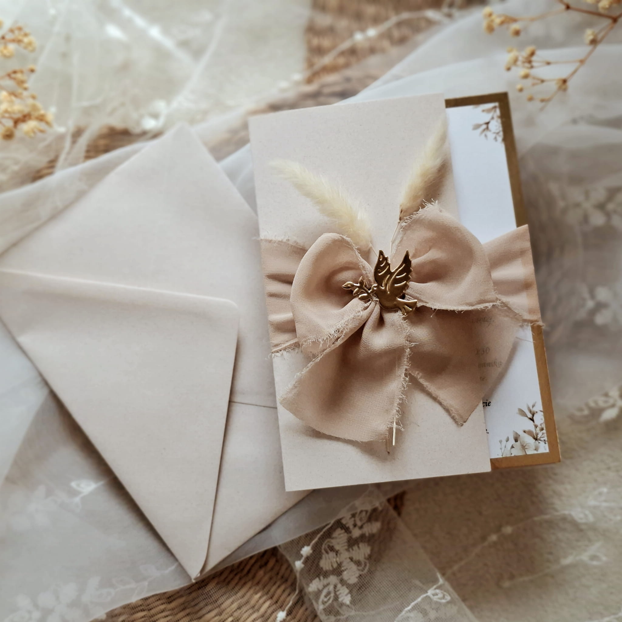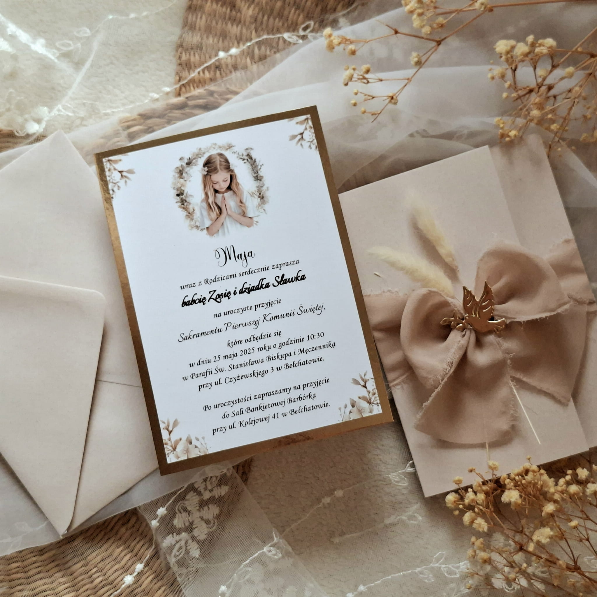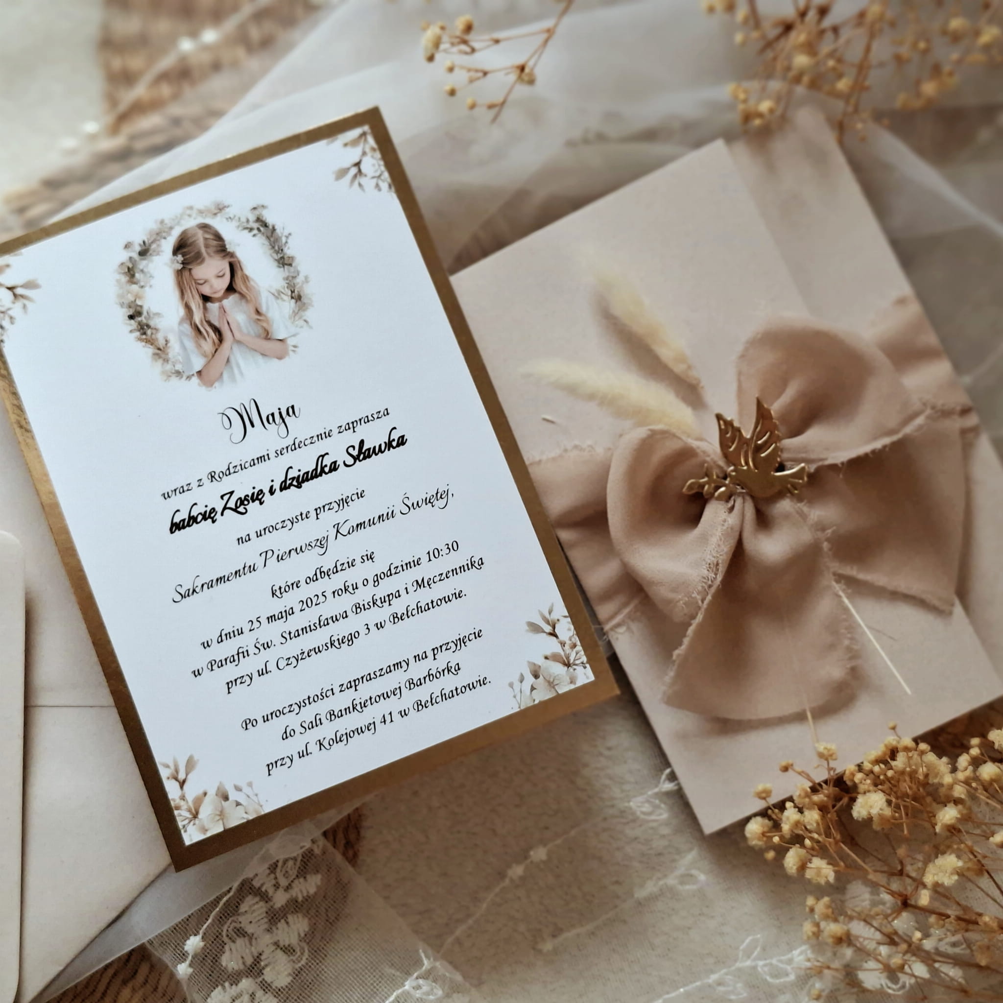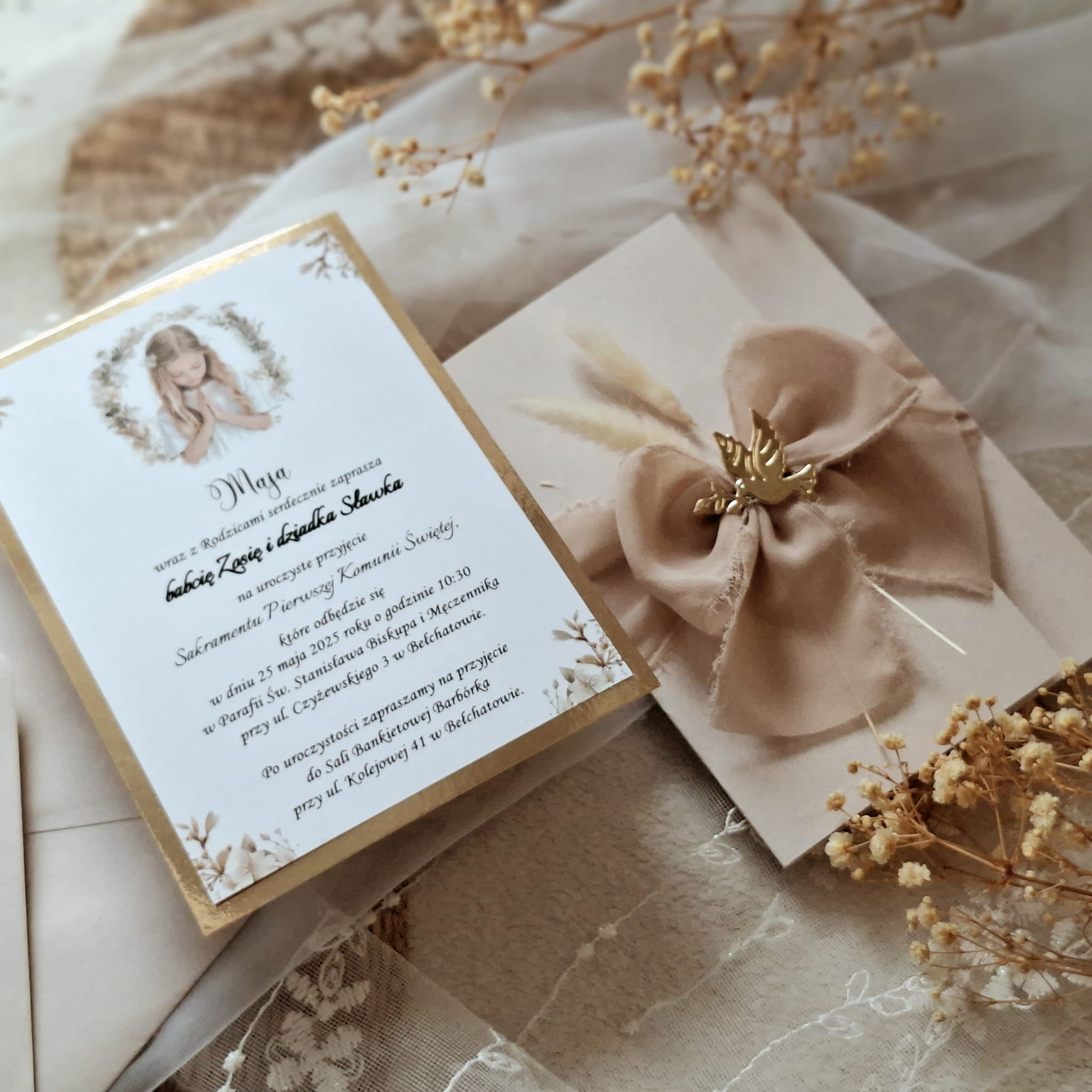 Eleganckie zaproszenia na komunię w okładce z kolorowego papieru, przewiązane wstążką szyfonową, z suszkami i motywem gołąbka.