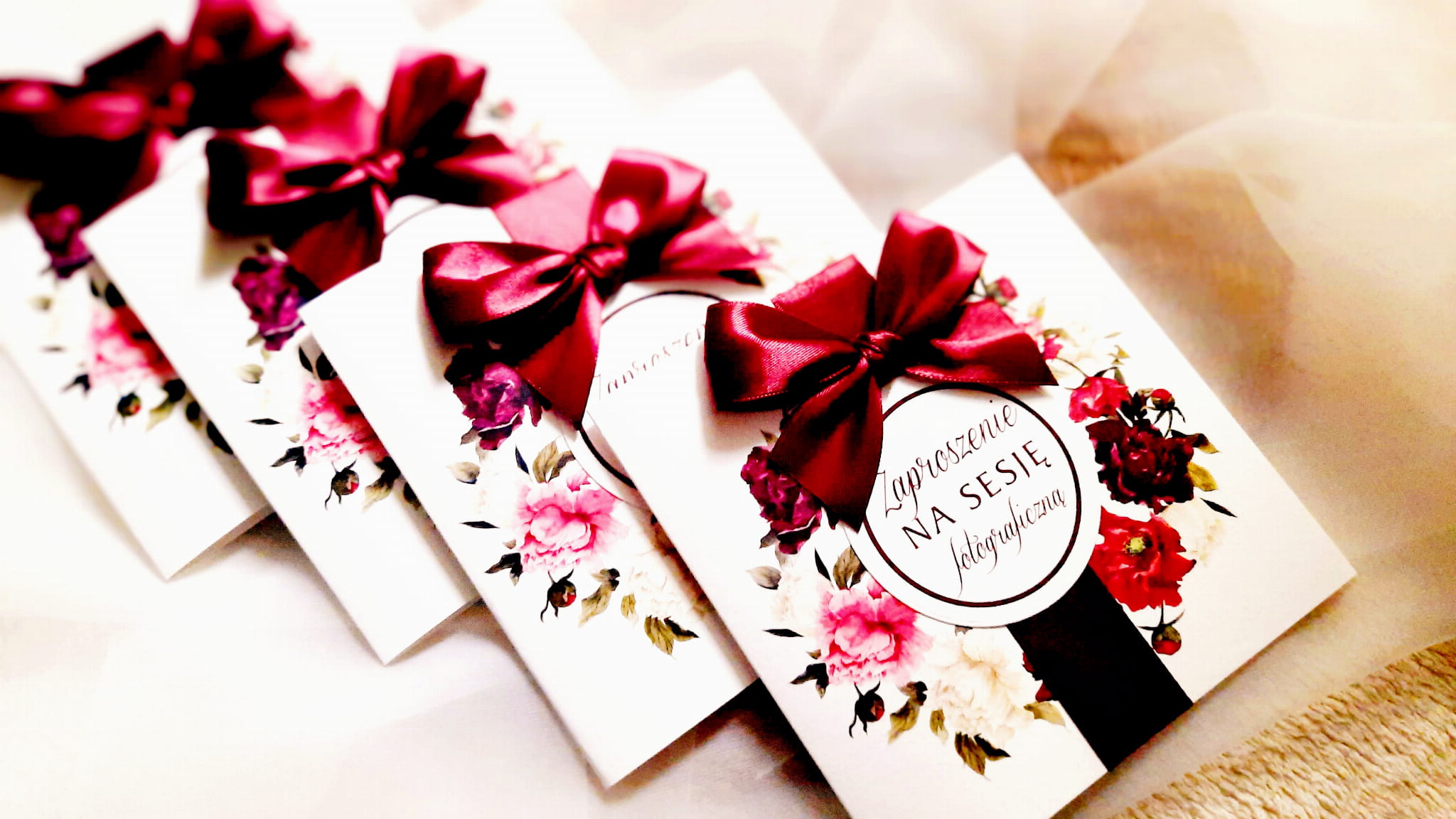 Zaproszenia na sesję z bordową kokardką. Format 13cm. W komplecie z kopertą