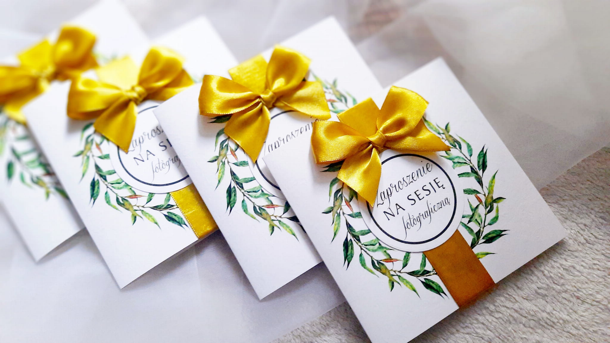 Zaproszenia na sesję ze złotą kokardką. Format 13cm. W komplecie z kopertą