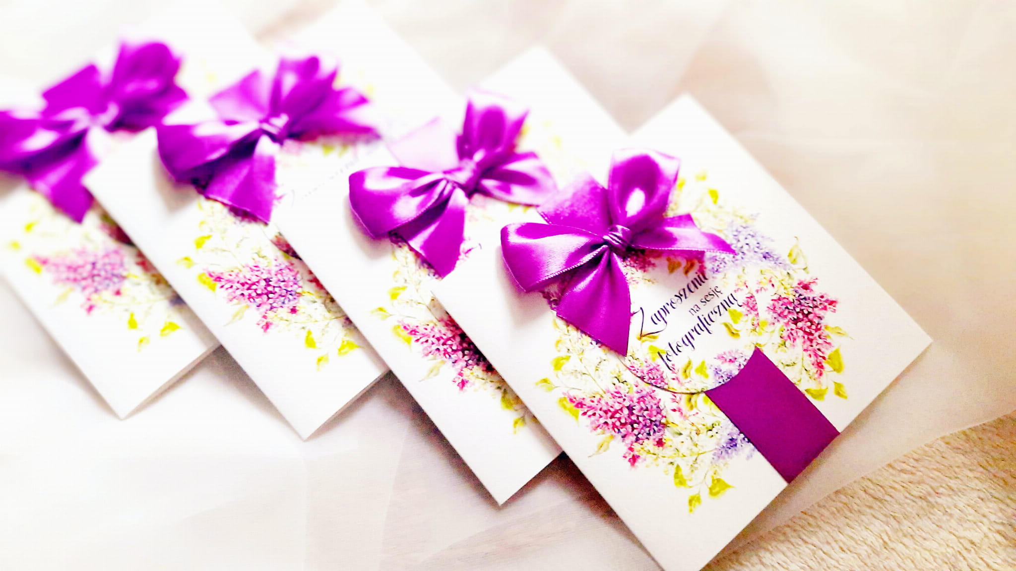 Zaproszenia na sesję z fioletową kokardką. Format 13cm. W komplecie z kopertą