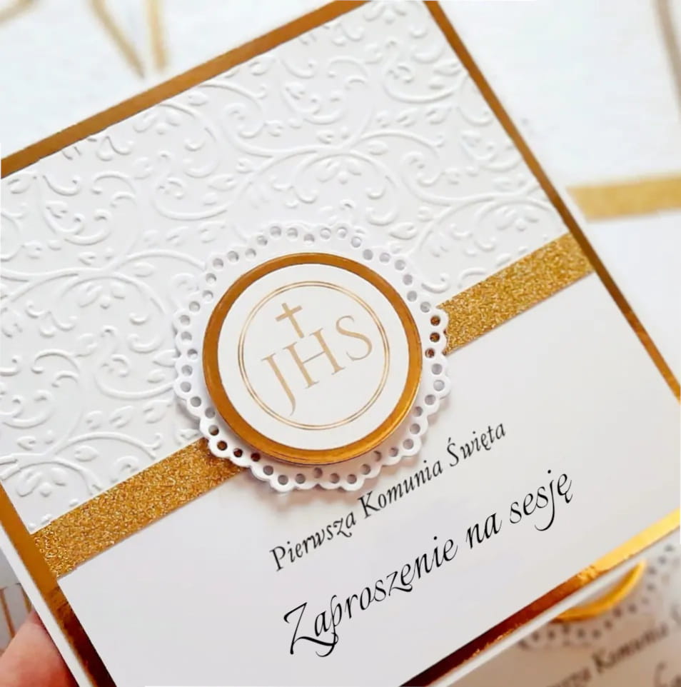 Eleganckie zaproszenia na sesję komunijną z wykorzystaniem papieru lustrzanego.