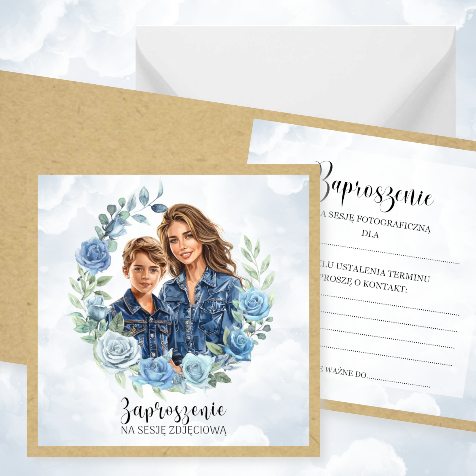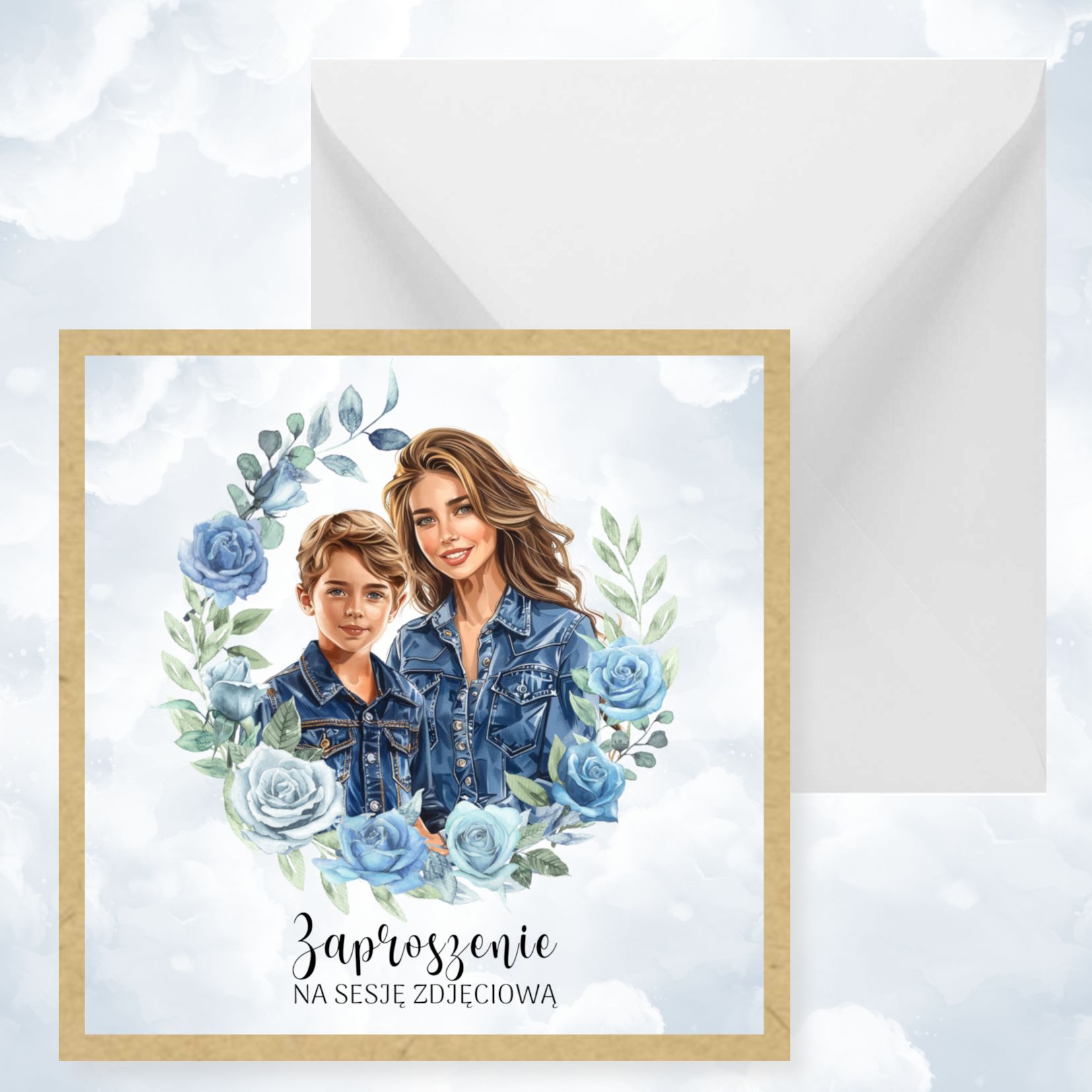 Zaproszenia na sesję na podkładzie eko z motywem graficznym. Format 14cm.