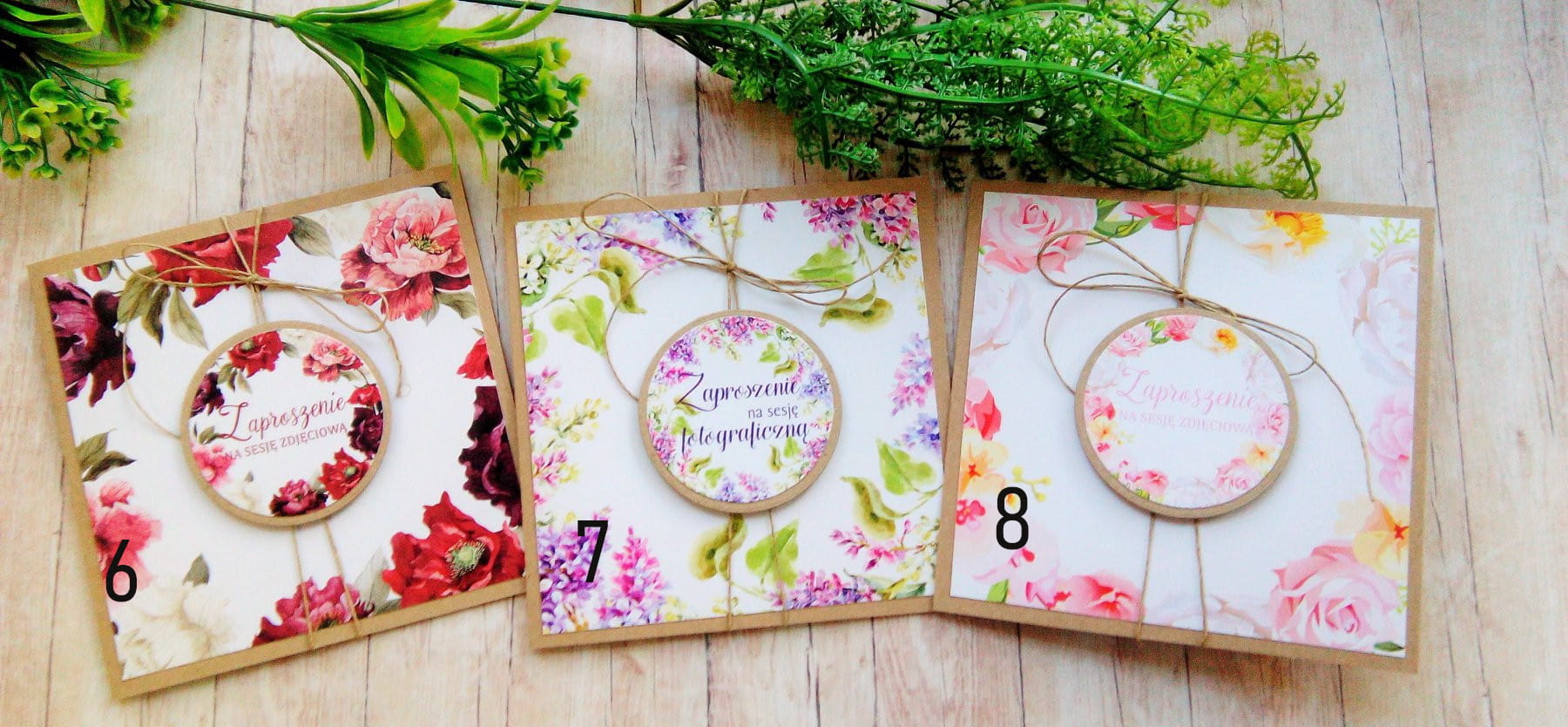 Zaproszenia na sesję na podkładzie eko z motywem graficznym bzu. Format 14cm.