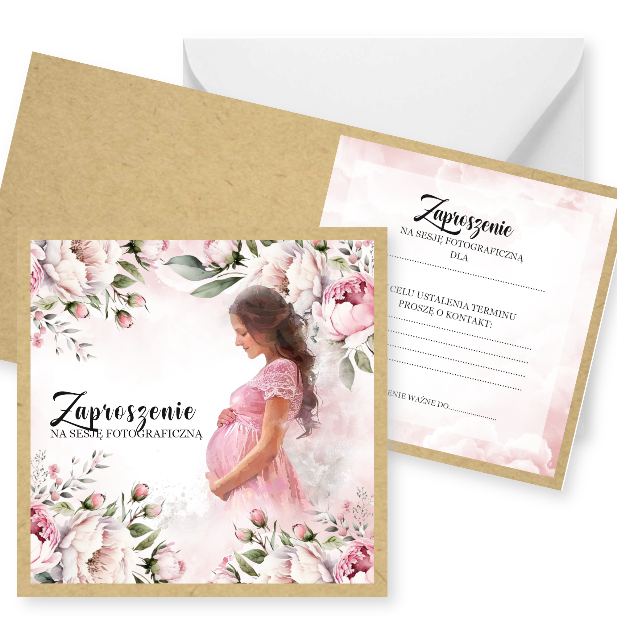 Zaproszenia na sesję na podkładzie eko z motywem graficznym. Format 14cm.
