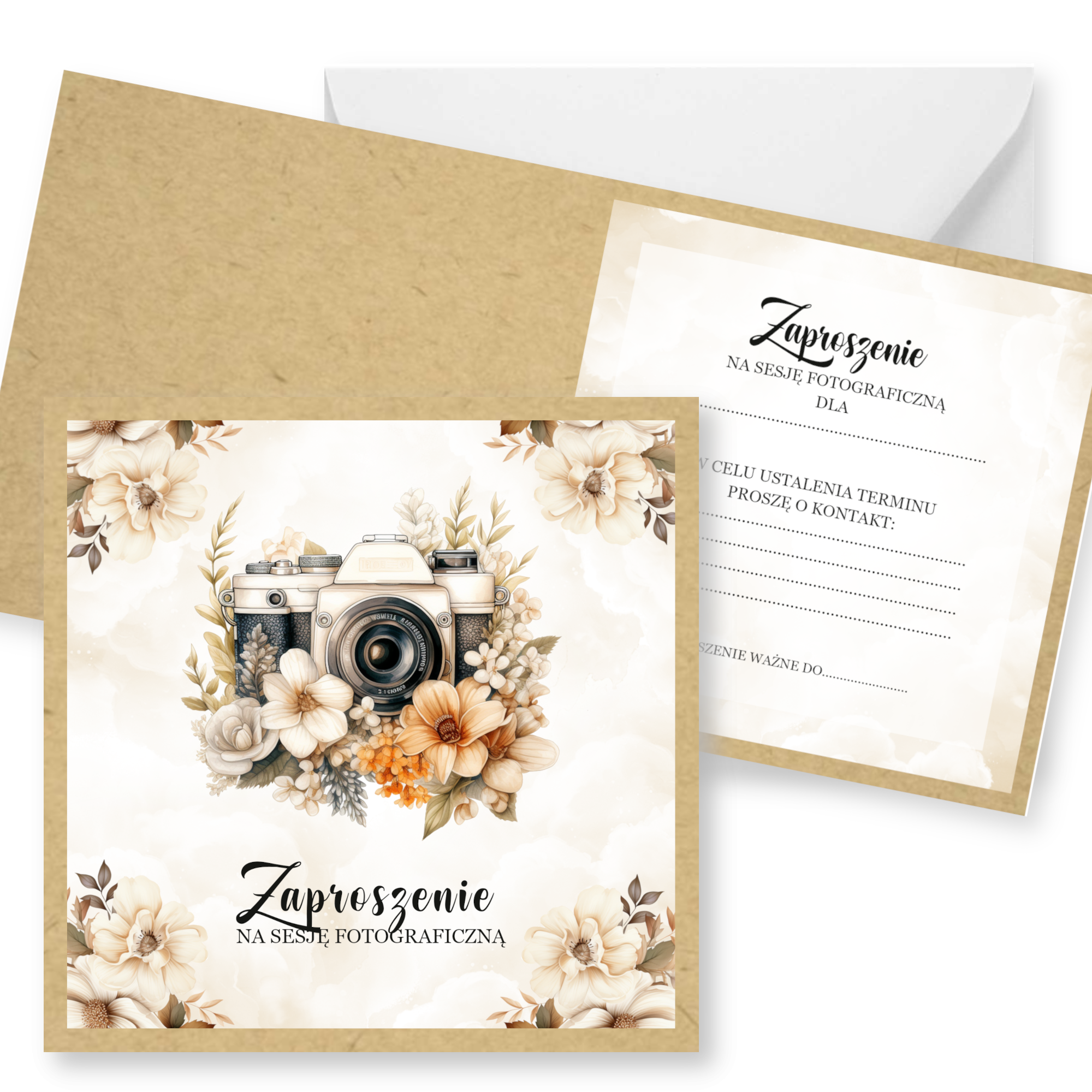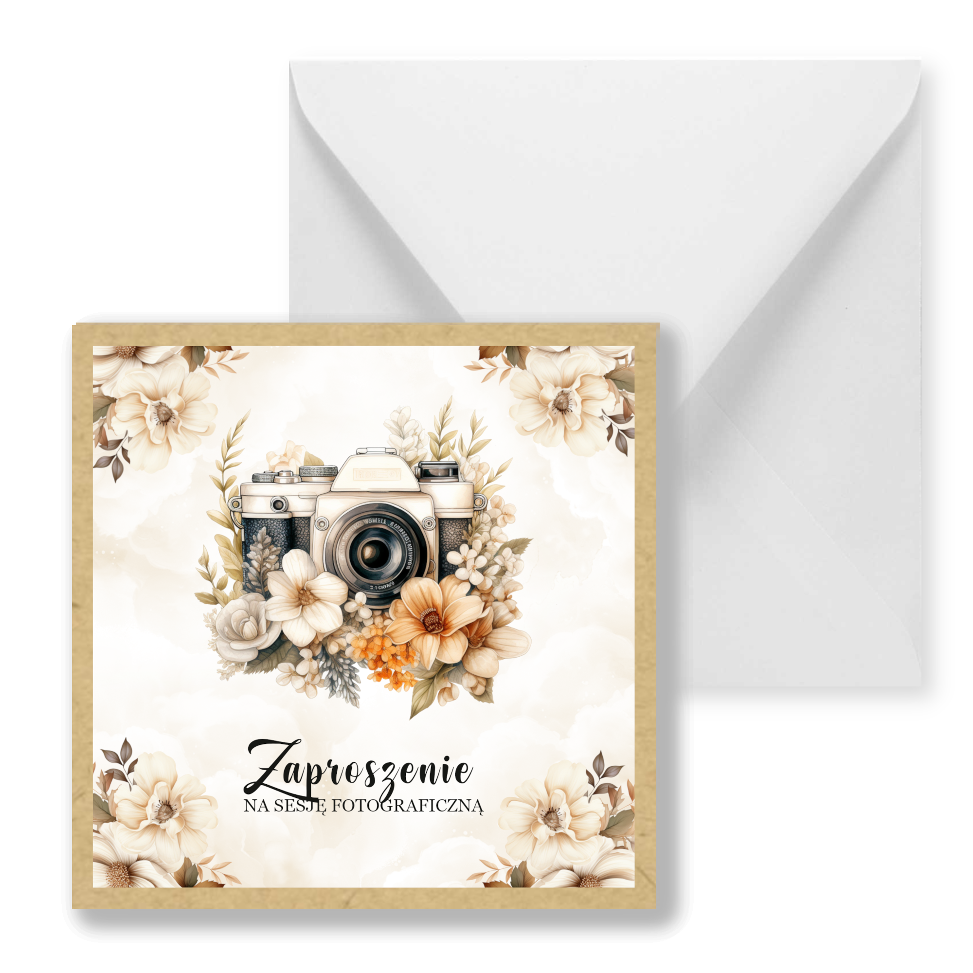 Zaproszenia na sesję na podkładzie eko z motywem graficznym. Format 14cm. W komplecie z białą kopertą.
