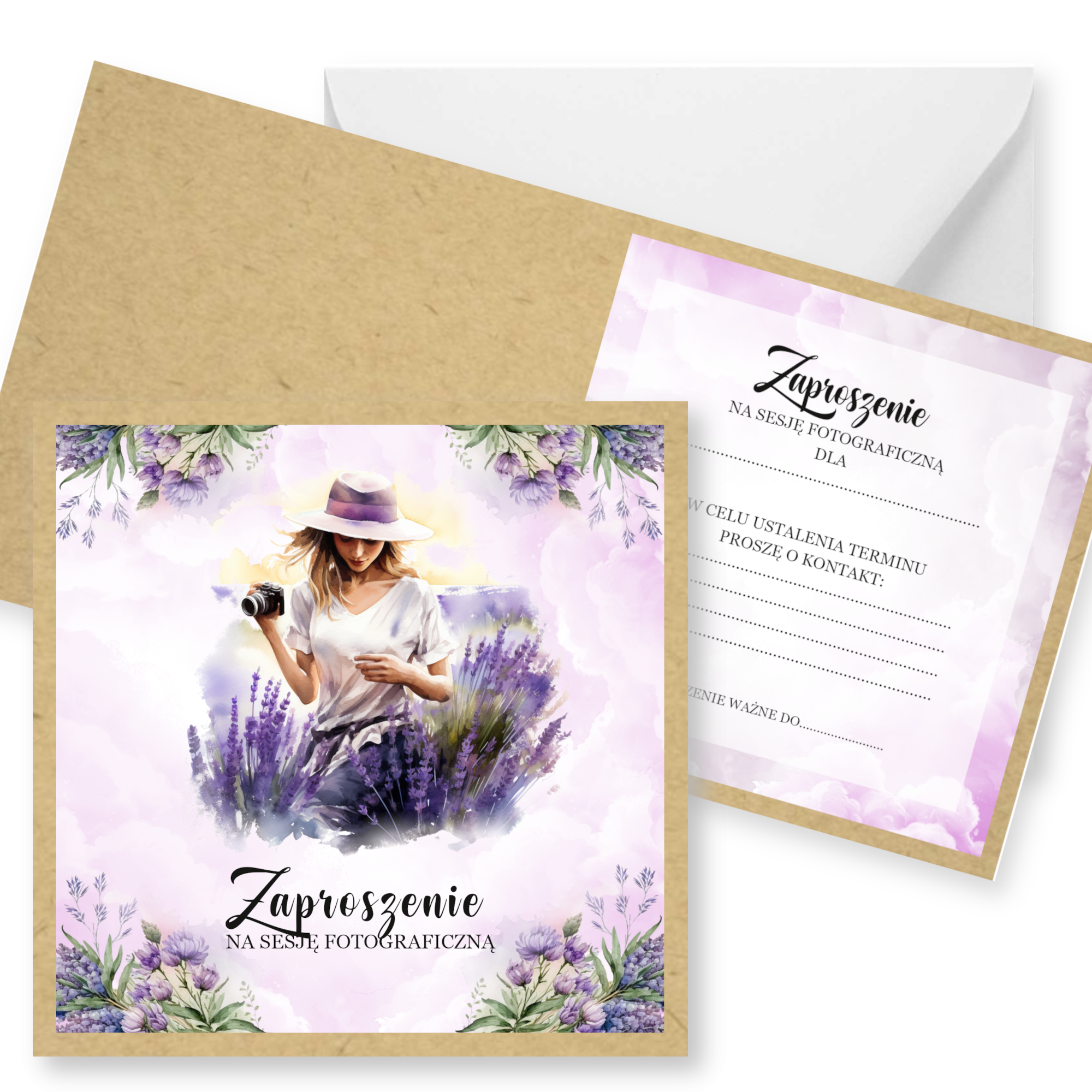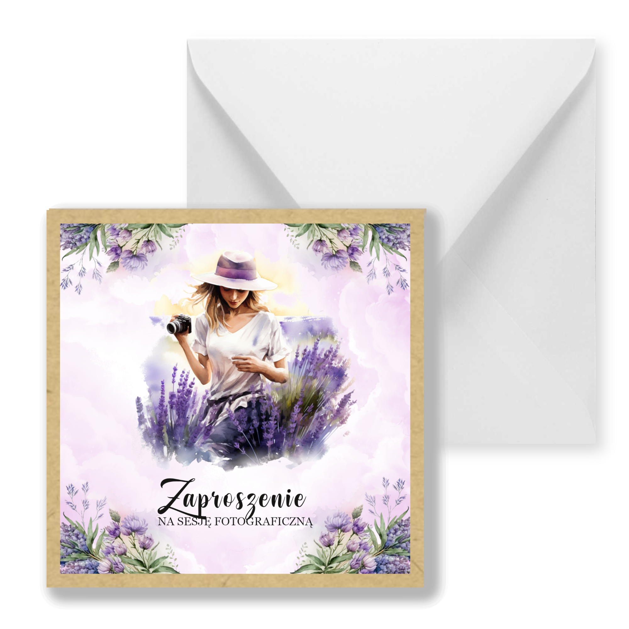 Zaproszenia na sesję na podkładzie eko z motywem graficznym. Format 14cm. W komplecie z białą kopertą.