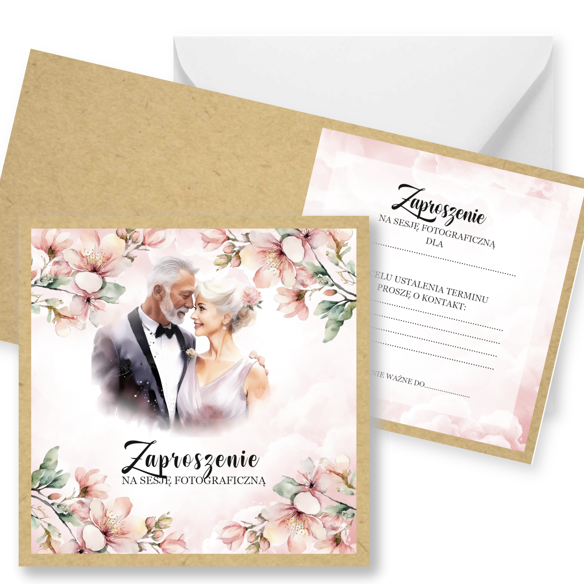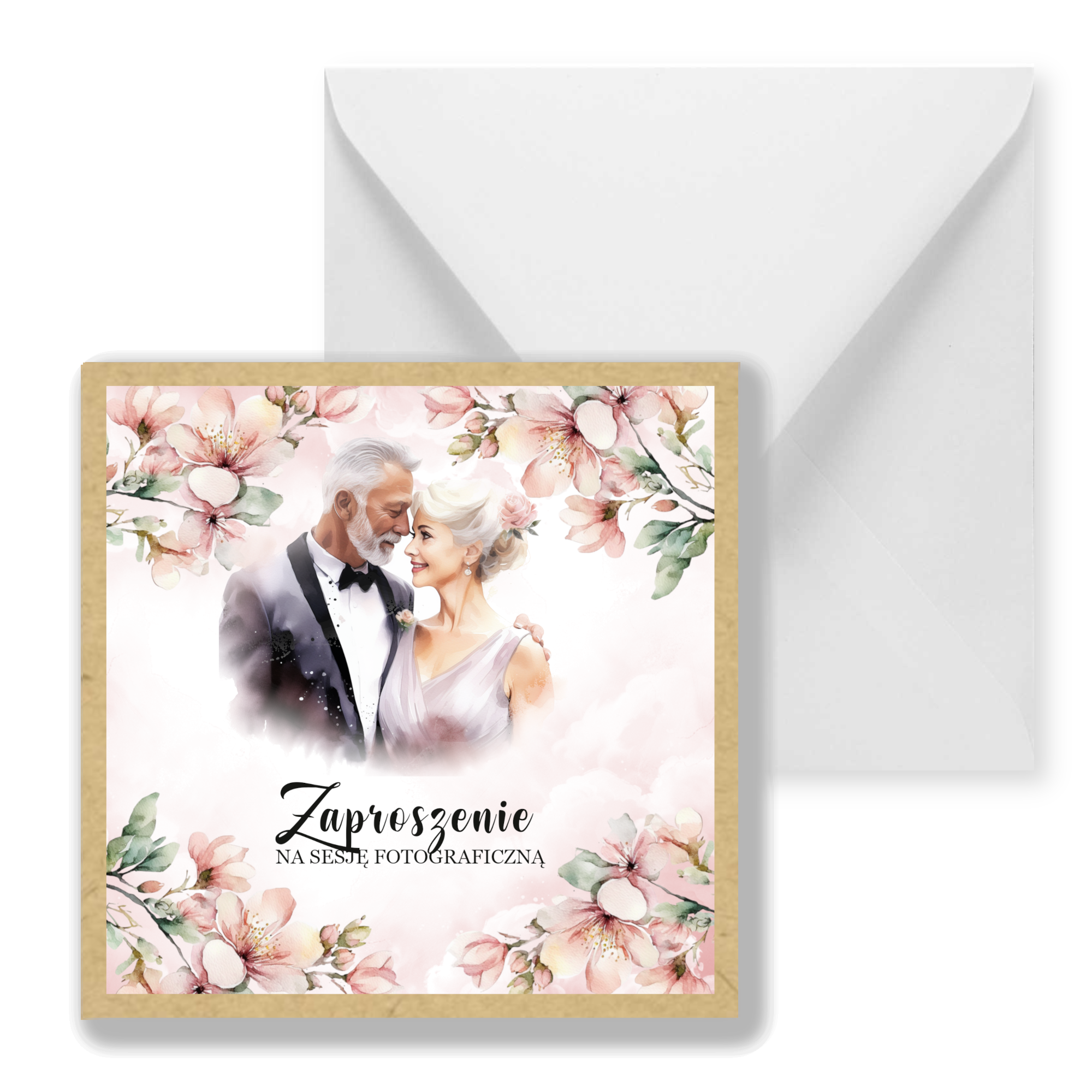 Zaproszenia na sesję na podkładzie eko z motywem graficznym. Format 14cm. W komplecie z białą kopertą.