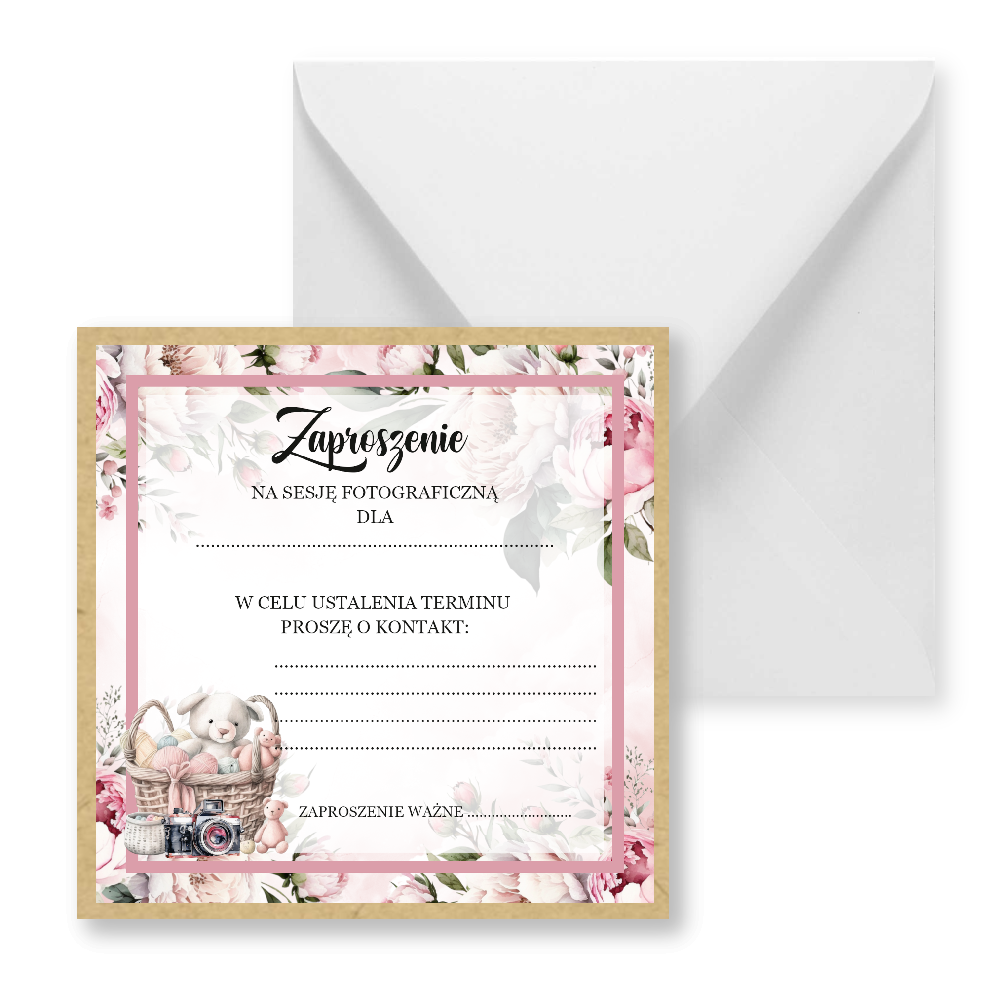 Jednokartkowe, jednostronne zaproszenia na sesję na podkładzie eko z motywem graficznym. Format 14,5cm. W komplecie z białą kopertą.