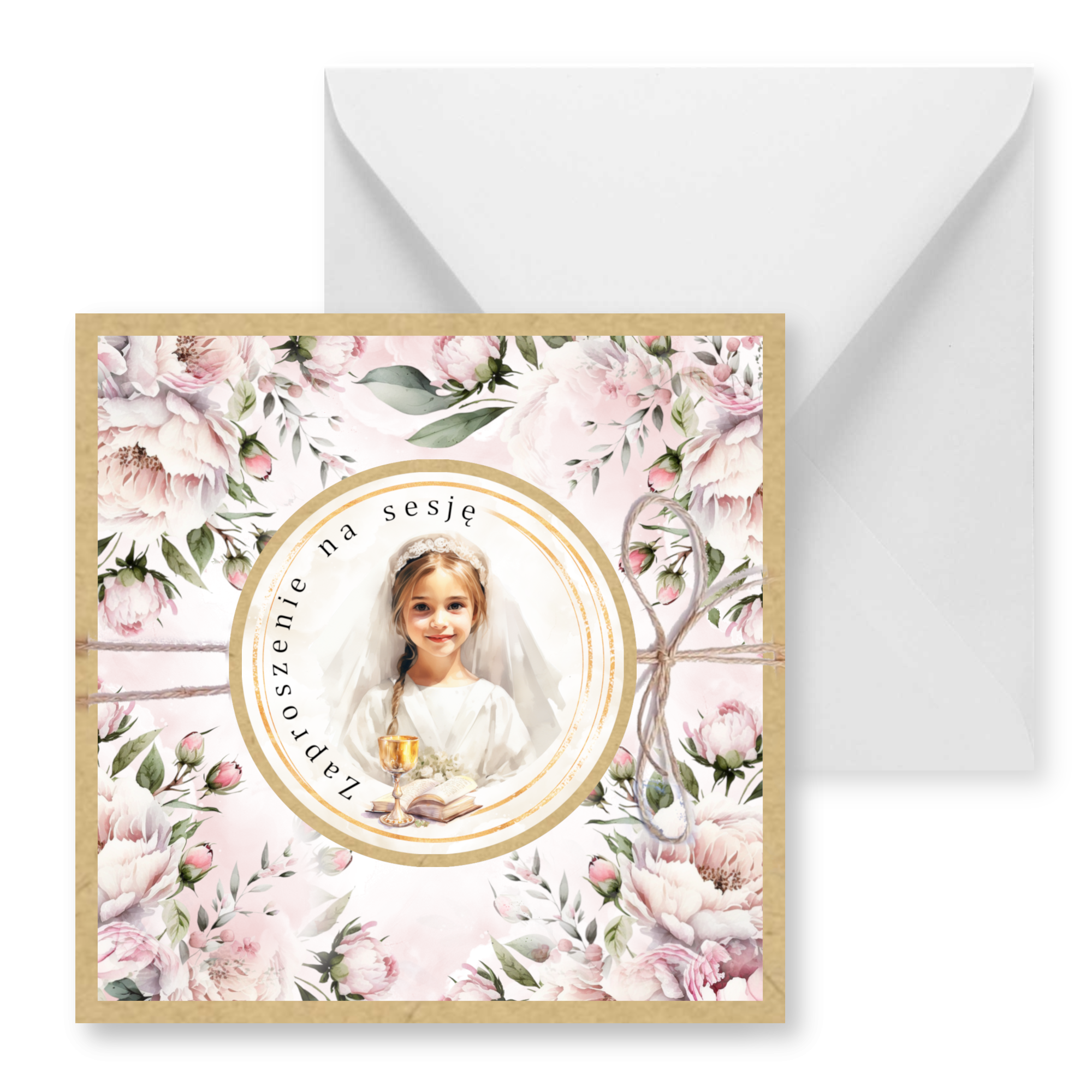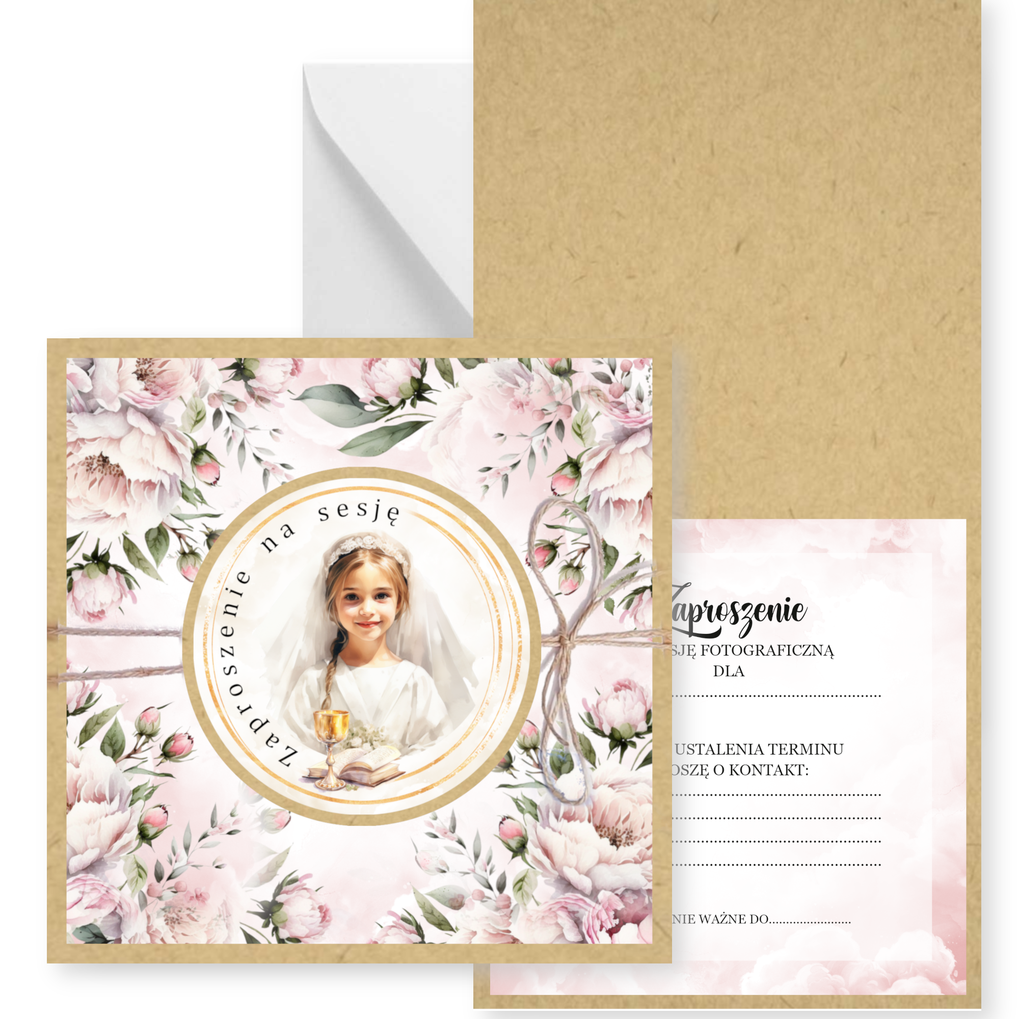 Zaproszenia na sesję na podkładzie eko z motywem graficznym. Przewiązane lnianym sznureczkiem. Format 14cm.