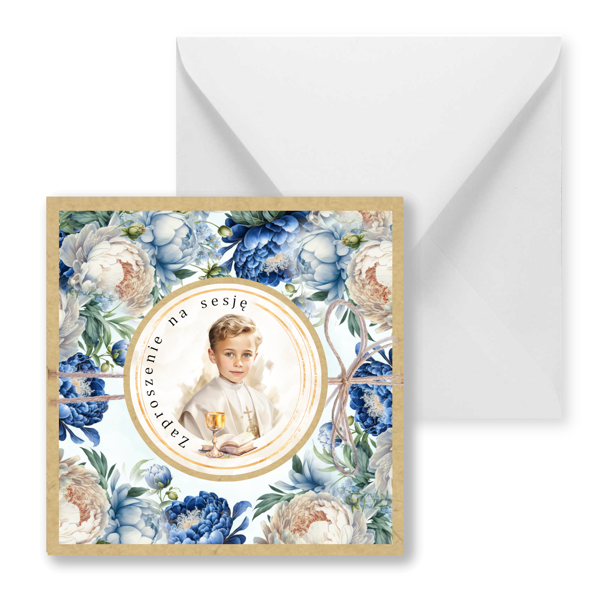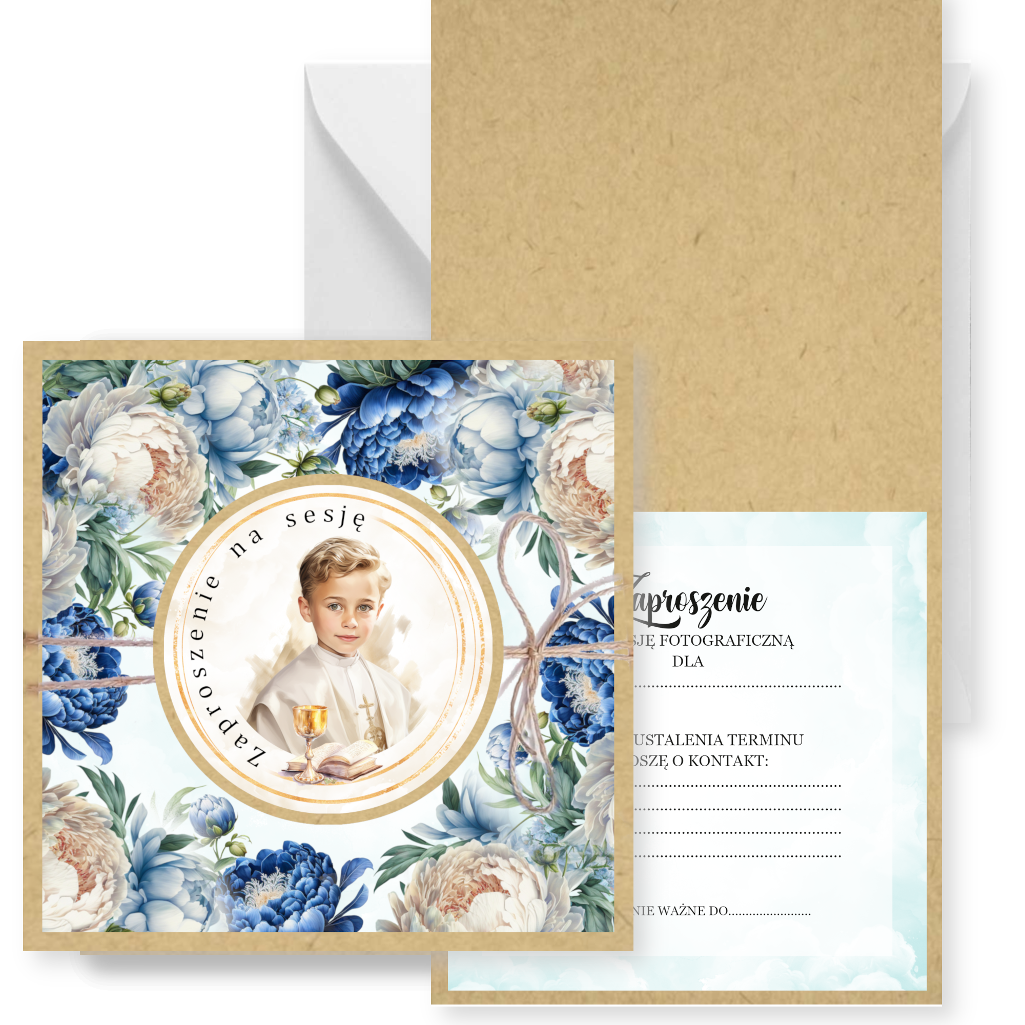 Zaproszenia na sesję na podkładzie eko z motywem graficznym. Przewiązane lnianym sznureczkiem. Format 14cm.