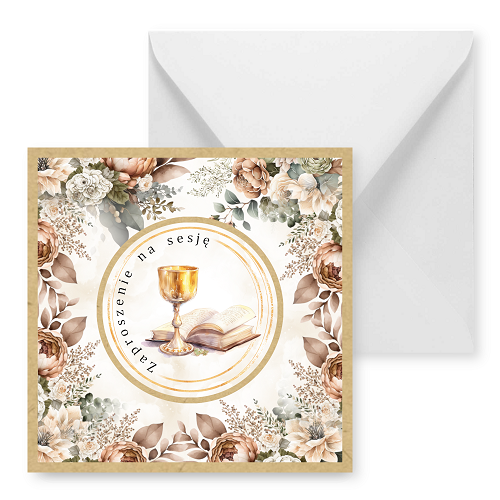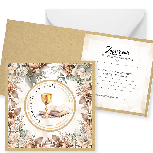 Zaproszenia na sesję na podkładzie eko z motywem graficznym. Format 14cm. W komplecie z białą kopertą.
