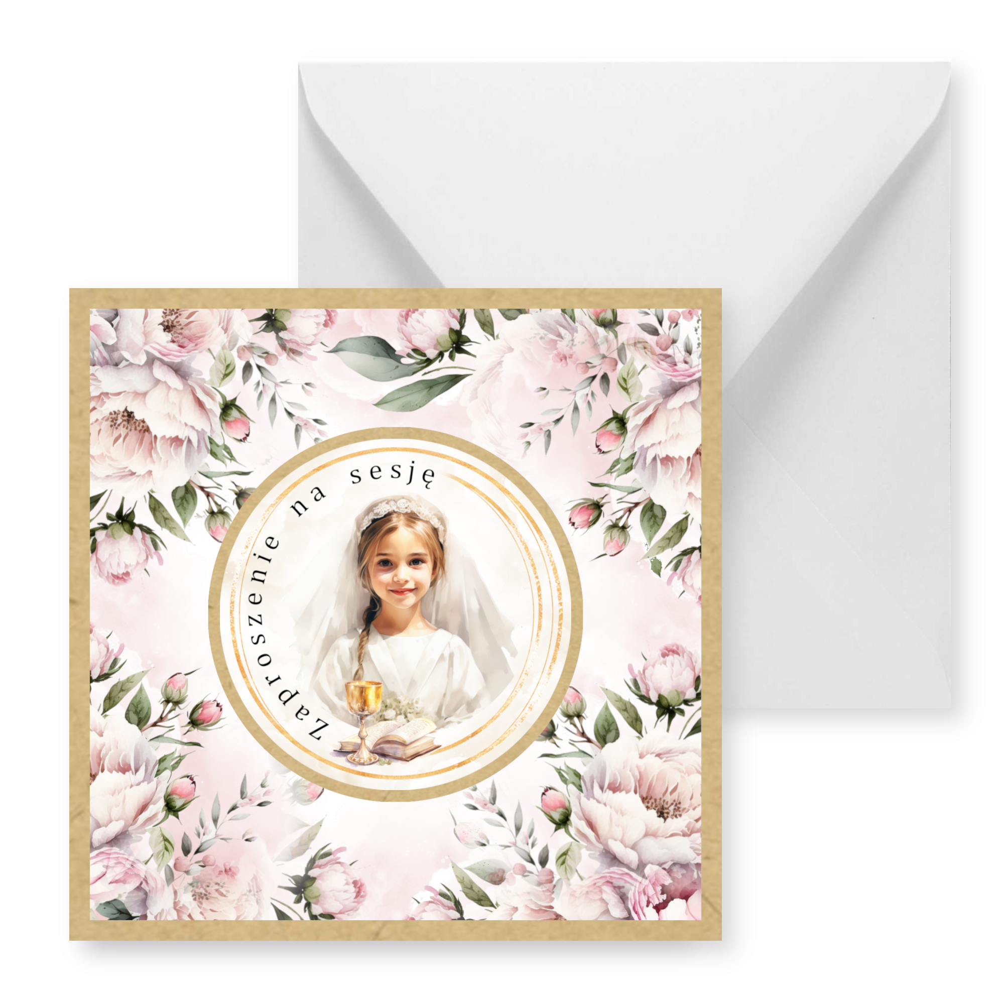 Zaproszenia na sesję na podkładzie eko z motywem graficznym. Format 14cm. W komplecie z białą kopertą.