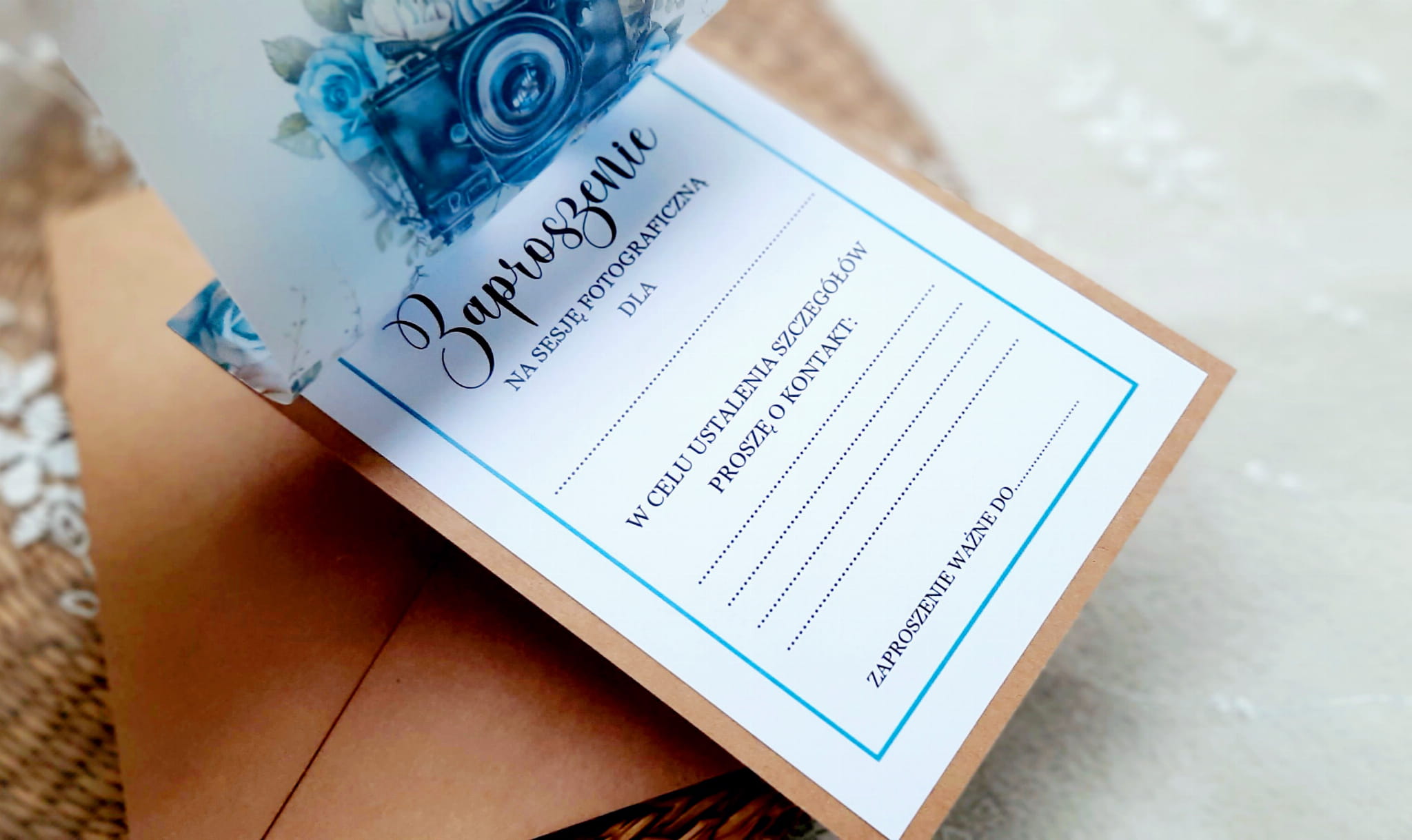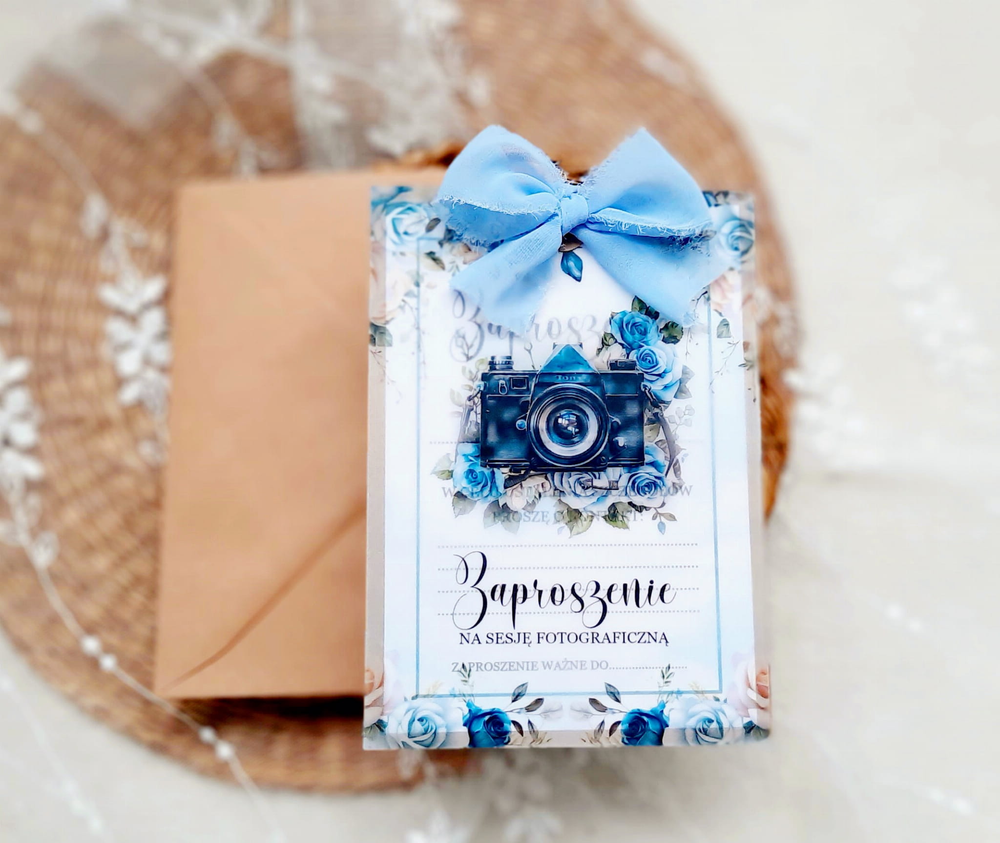 Zaproszenia na sesję na podkładzie eko, z kalką z motywem graficznym oraz szyfonową wstążeczką. Format 12x17cm. W komplecie z eko kopertą.